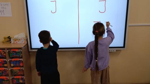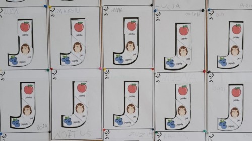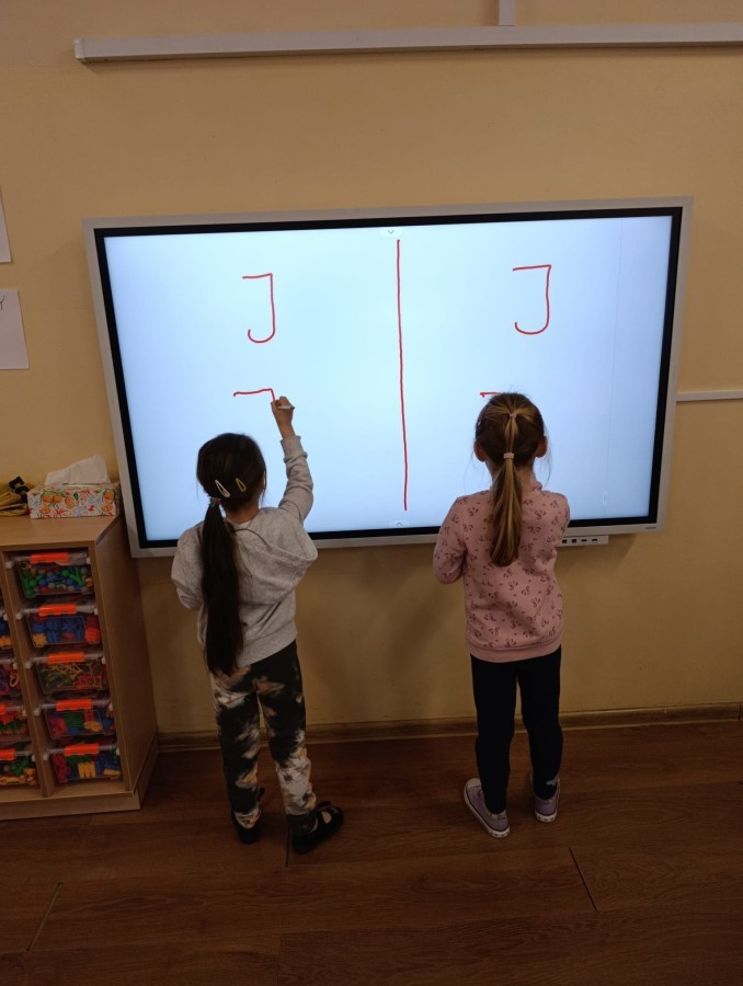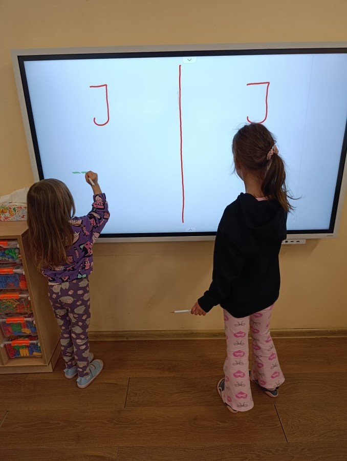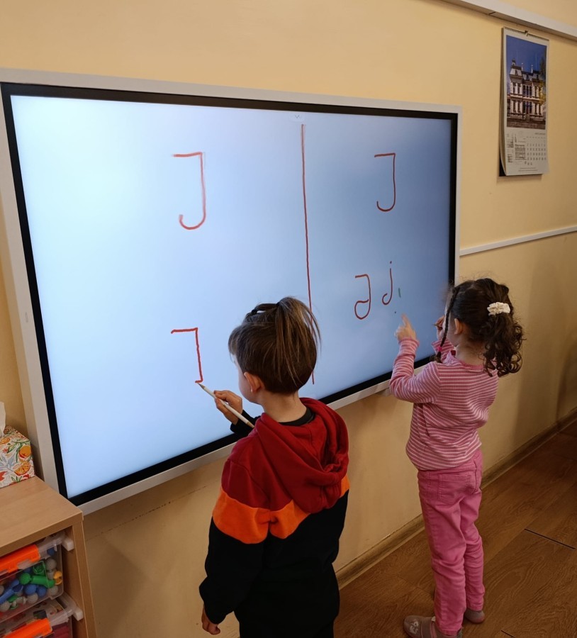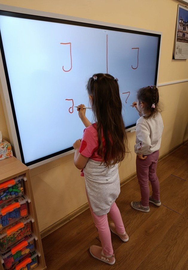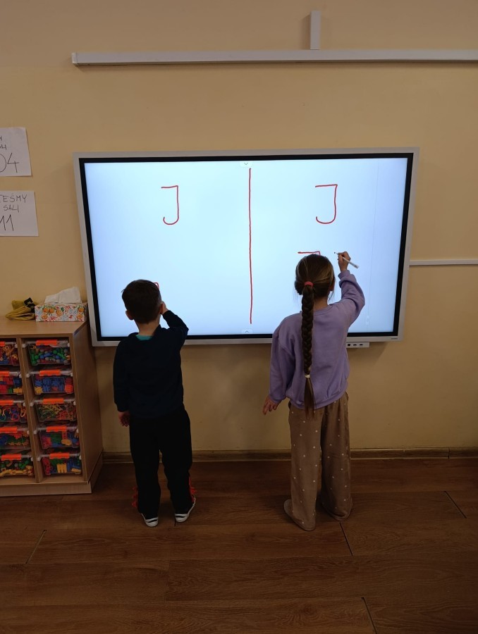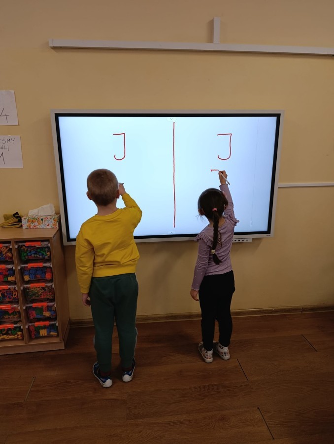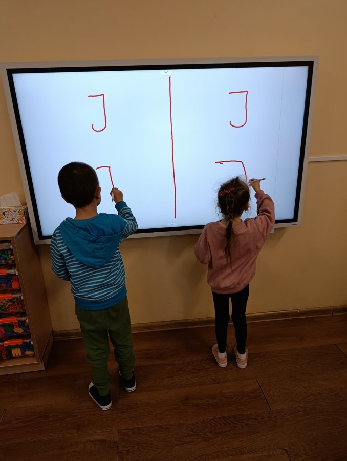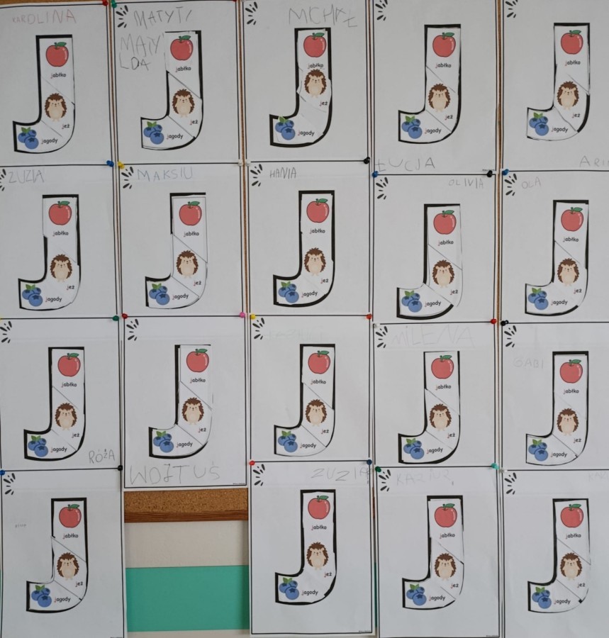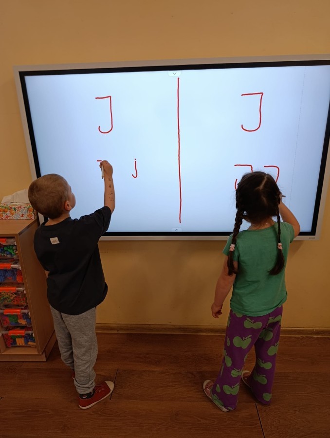 „Jeżyki” poznały nową literkę – „J”. Naszą przygodę rozpoczęliśmy od pisania literki w powietrzu, co sprawiło dzieciom wiele radości i pozwoliło oswoić się z jej kształtem. Następnie ćwiczyliśmy ją w nietypowy sposób – pisząc palcem na plecach kolegi lub koleżanki. Kolejnym krokiem było pisanie litery „J” na tablicy multimedialnej, gdzie dzieci mogły samodzielnie spróbować swoich sił. Wspólnie zastanawialiśmy się także nad wyrazami rozpoczynającymi się na tę literkę – pomysłów nie brakowało! Uczyliśmy się również poprawnego zapisu litery „J”, a na zakończenie zajęć wykonaliśmy pracę plastyczną – wyklejanie literki, które rozwijało kreatywność i sprawność manualną.To był dzień pełen nauki przez zabawę.
