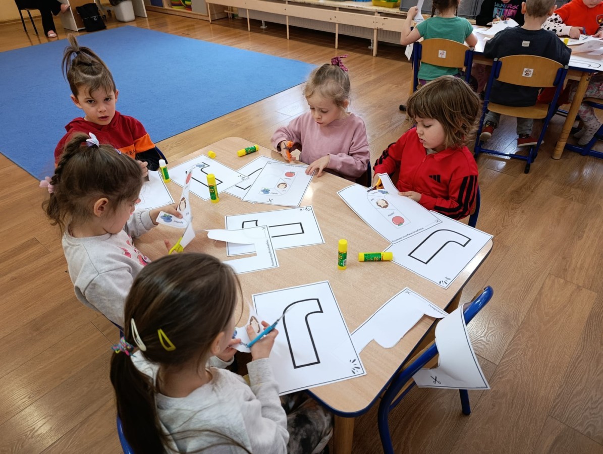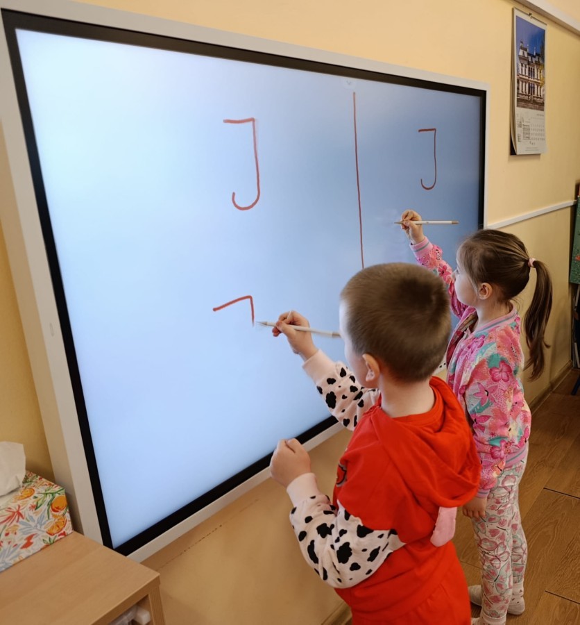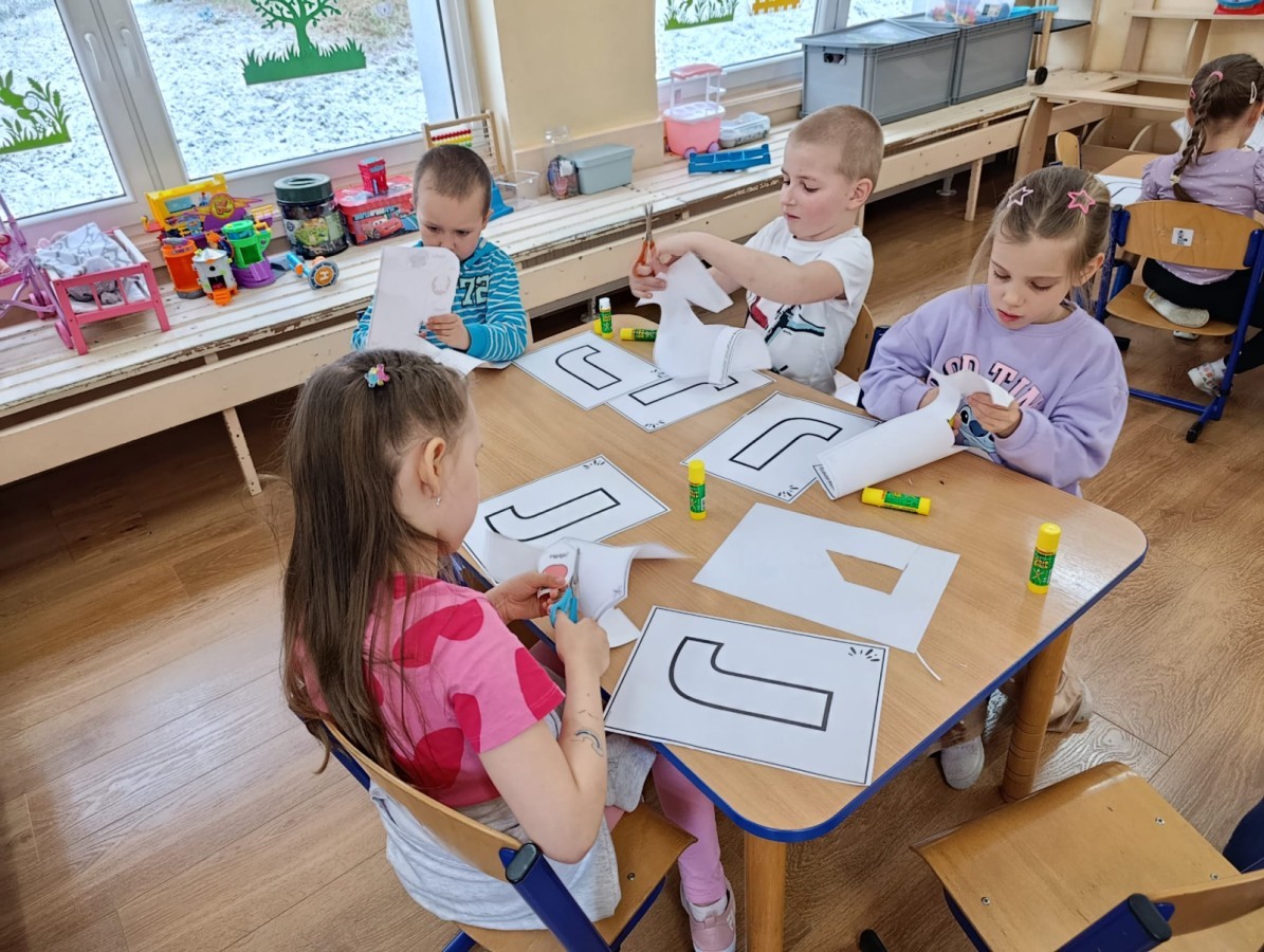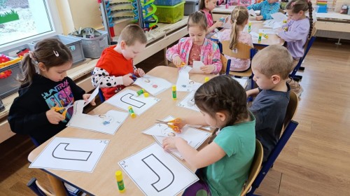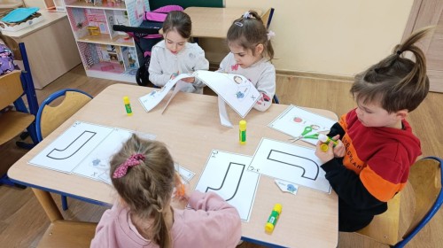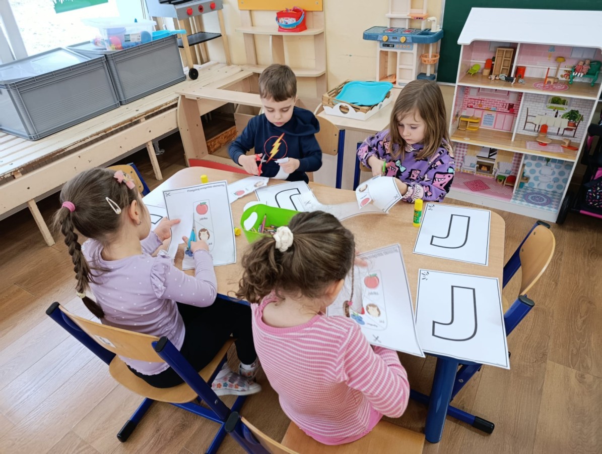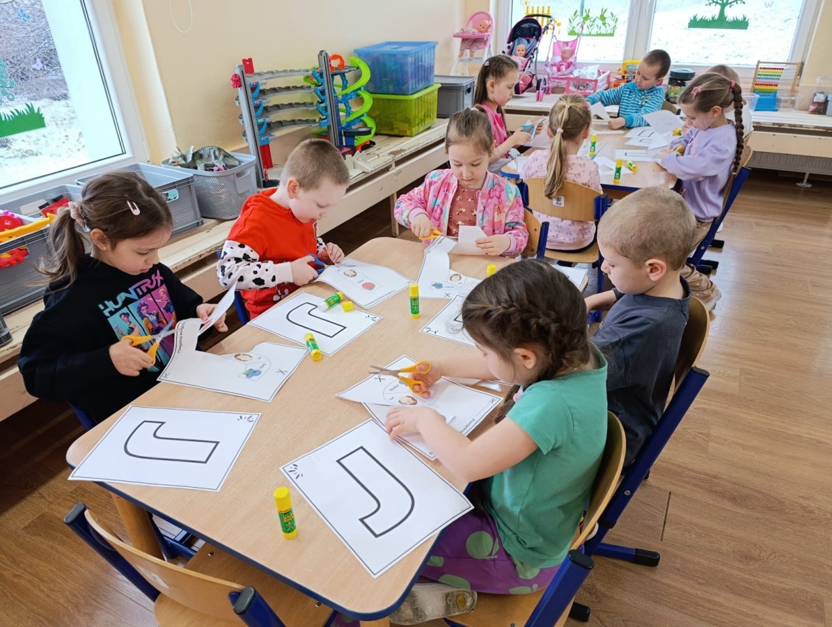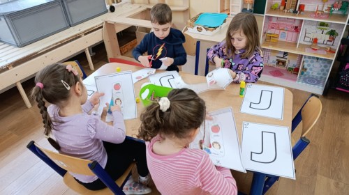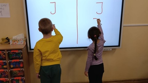 „Jeżyki” poznały nową literkę – „J”. Naszą przygodę rozpoczęliśmy od pisania literki w powietrzu, co sprawiło dzieciom wiele radości i pozwoliło oswoić się z jej kształtem. Następnie ćwiczyliśmy ją w nietypowy sposób – pisząc palcem na plecach kolegi lub koleżanki. Kolejnym krokiem było pisanie litery „J” na tablicy multimedialnej, gdzie dzieci mogły samodzielnie spróbować swoich sił. Wspólnie zastanawialiśmy się także nad wyrazami rozpoczynającymi się na tę literkę – pomysłów nie brakowało! Uczyliśmy się również poprawnego zapisu litery „J”, a na zakończenie zajęć wykonaliśmy pracę plastyczną – wyklejanie literki, które rozwijało kreatywność i sprawność manualną.To był dzień pełen nauki przez zabawę.
