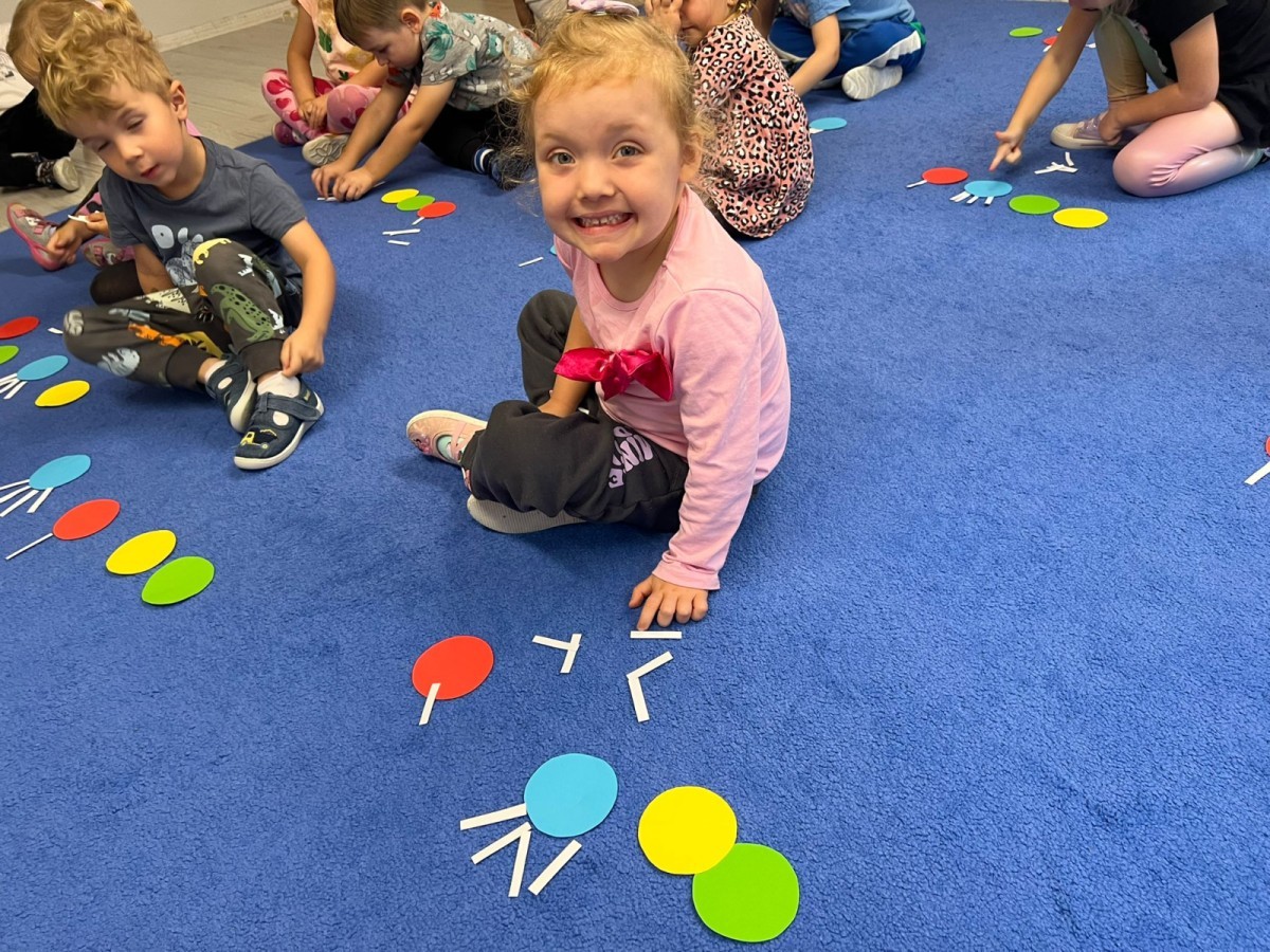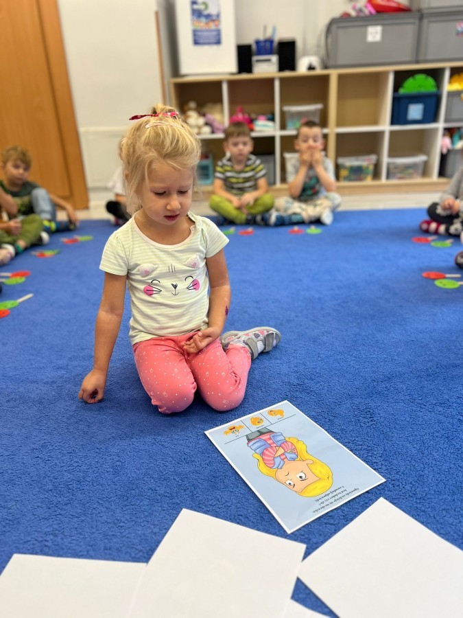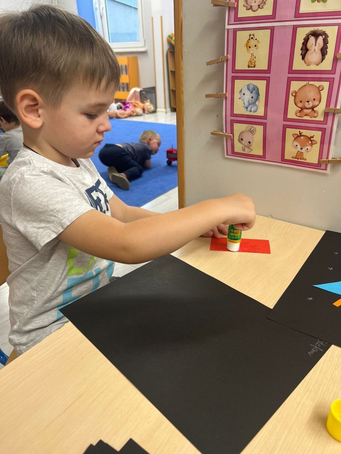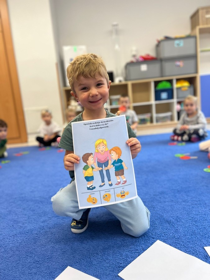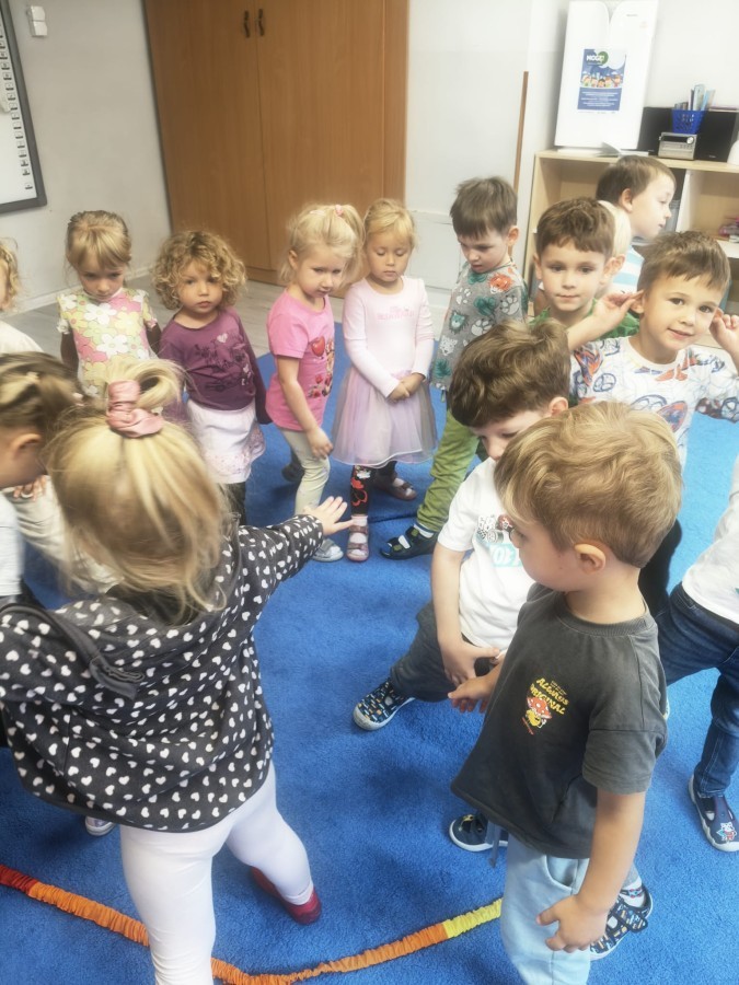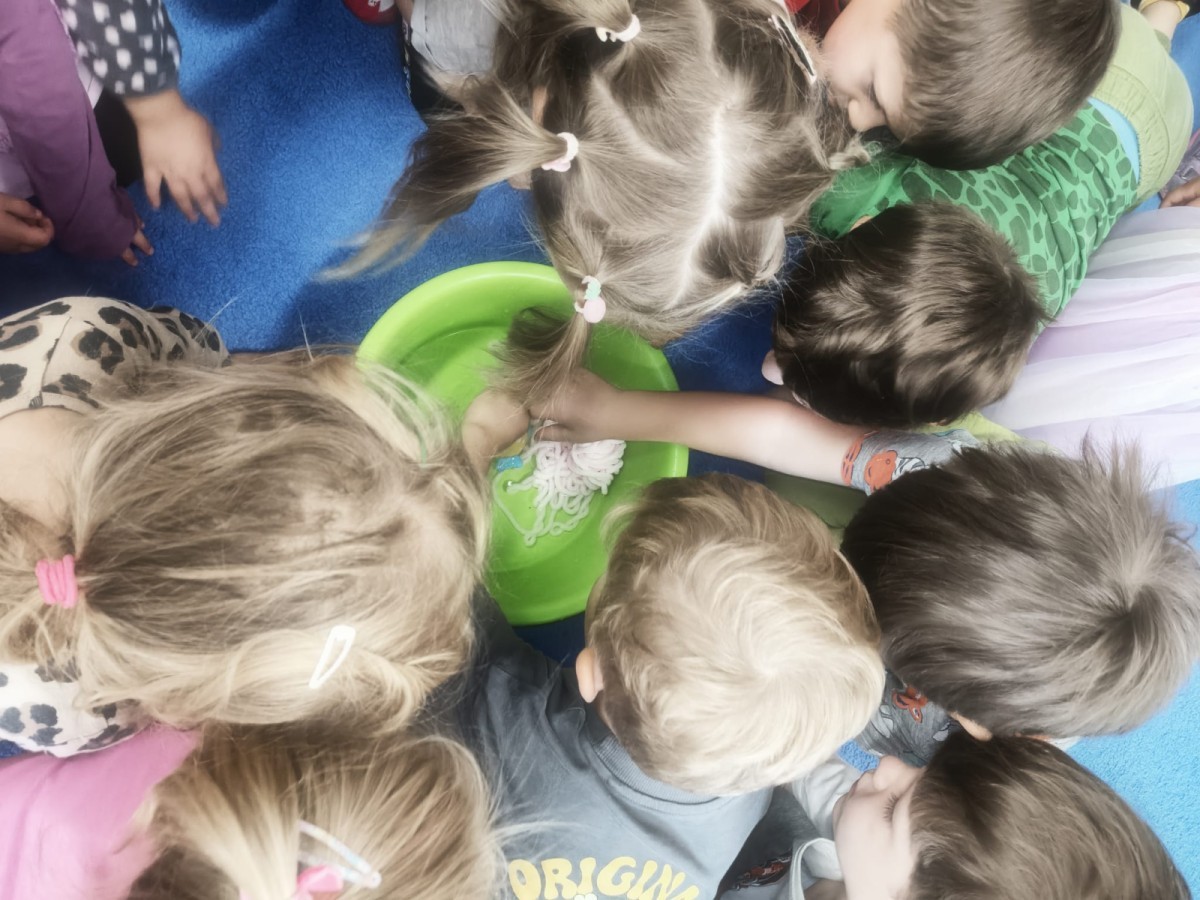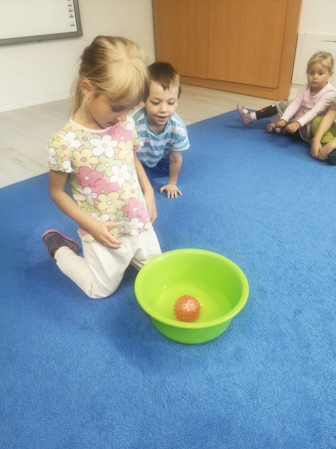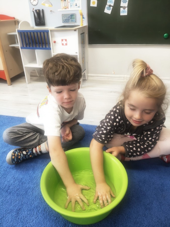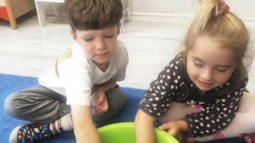 W tym tygodniu dzieci wykonywały różne eksperymenty z wodą, obserwując zachowania poszczególnych przedmiotów w wodzie, robiły wodną orkiestrę z wykorzystaniem kubeczka z wodą i słomki oraz poznawały jej właściwości. Dzieci miały też okazję malować na wodnym arkuszu i obserwować zachowanie rozchodzących się barw oraz ich mieszanie i powstawanie kolorów pochodnych. Utrwaliły również kształty i kolory podczas zajęć z przeliczania na konkretach (torty i świeczki)do 4 oraz przy tworzeniu pracy plastycznej z figur geometrycznych. Pod koniec tygodnia miały miejsce również rozmowy na temat dobrych i złych zachowań, akceptowalnych i nieakceptowalnych w danej sytuacji oraz na temat emocji im towarzyszących. Rozważaliśmy z dziećmi, w jakich sytuacjach czujemy strach, złość, smutek, radość i dumę. Szukaliśmy sposobów, jak sobie radzić ze smutkiem, ale też zauważyliśmy, że czasem każdy z nas czuje potrzebę posmucić się i to jest ok.