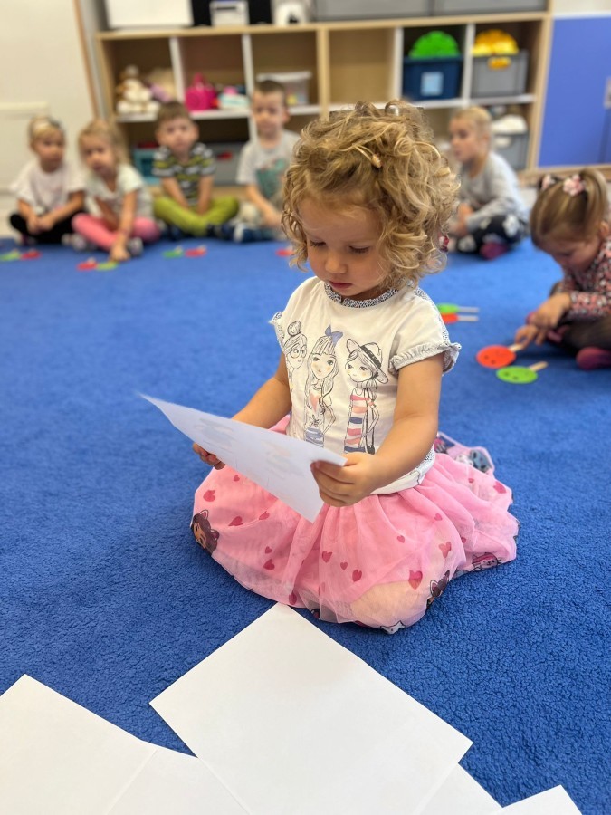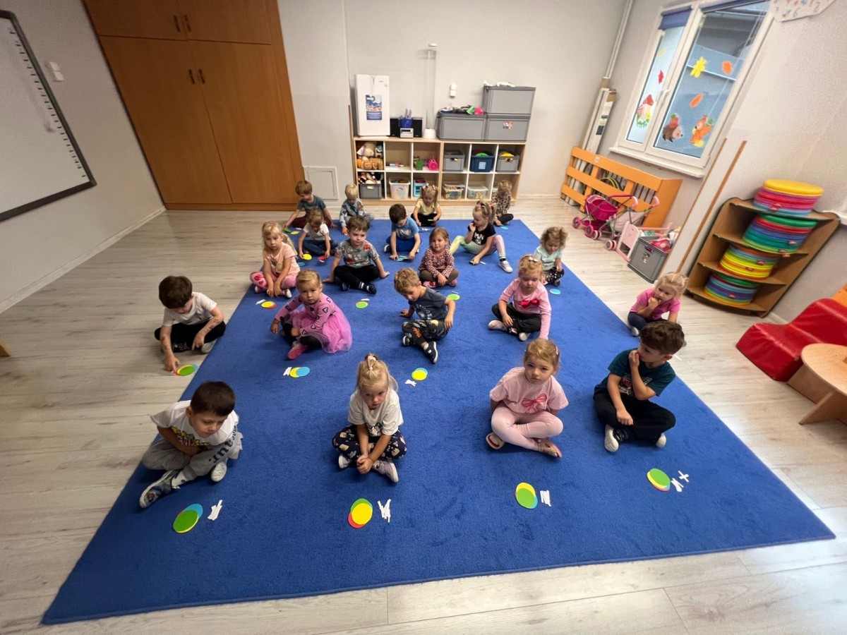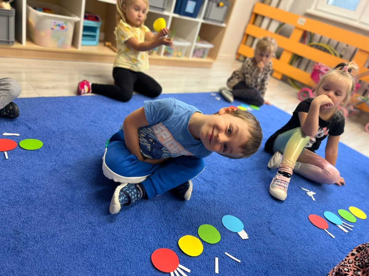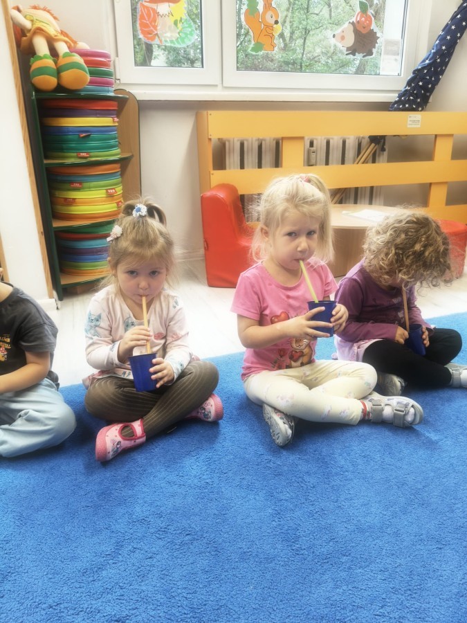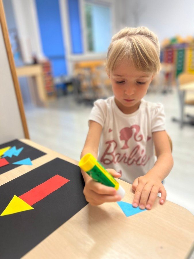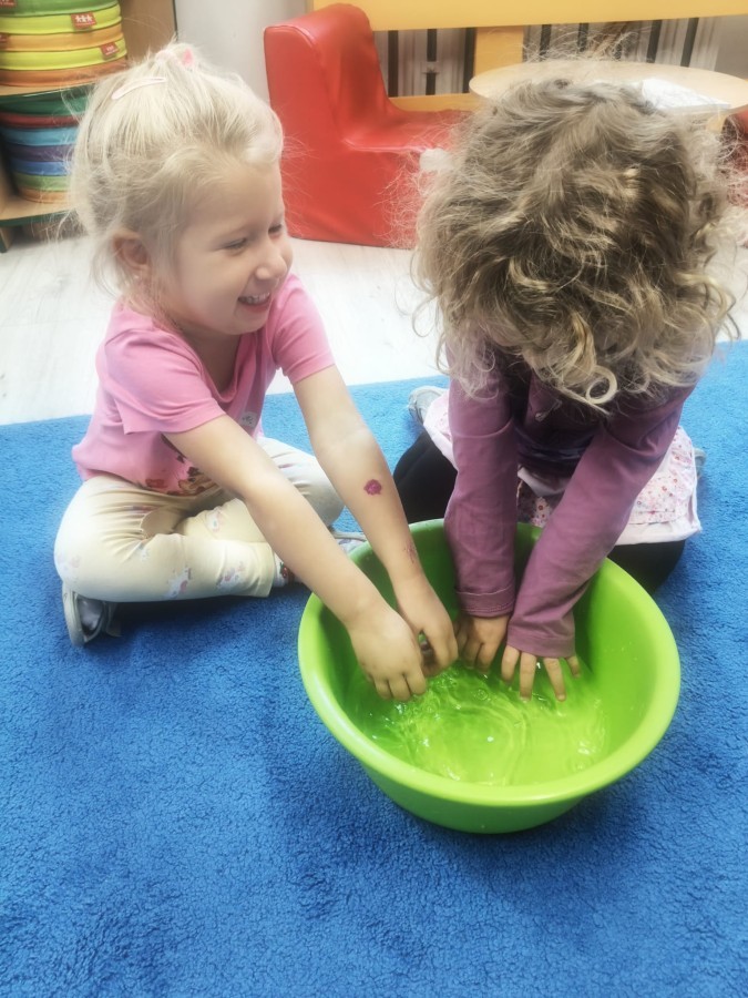 W tym tygodniu dzieci wykonywały różne eksperymenty z wodą, obserwując zachowania poszczególnych przedmiotów w wodzie, robiły wodną orkiestrę z wykorzystaniem kubeczka z wodą i słomki oraz poznawały jej właściwości. Dzieci miały też okazję malować na wodnym arkuszu i obserwować zachowanie rozchodzących się barw oraz ich mieszanie i powstawanie kolorów pochodnych. Utrwaliły również kształty i kolory podczas zajęć z przeliczania na konkretach (torty i świeczki)do 4 oraz przy tworzeniu pracy plastycznej z figur geometrycznych. Pod koniec tygodnia miały miejsce również rozmowy na temat dobrych i złych zachowań, akceptowalnych i nieakceptowalnych w danej sytuacji oraz na temat emocji im towarzyszących. Rozważaliśmy z dziećmi, w jakich sytuacjach czujemy strach, złość, smutek, radość i dumę. Szukaliśmy sposobów, jak sobie radzić ze smutkiem, ale też zauważyliśmy, że czasem każdy z nas czuje potrzebę posmucić się i to jest ok.