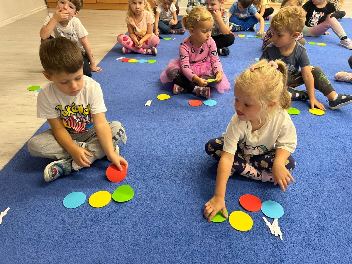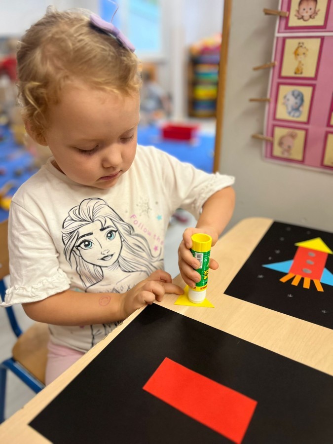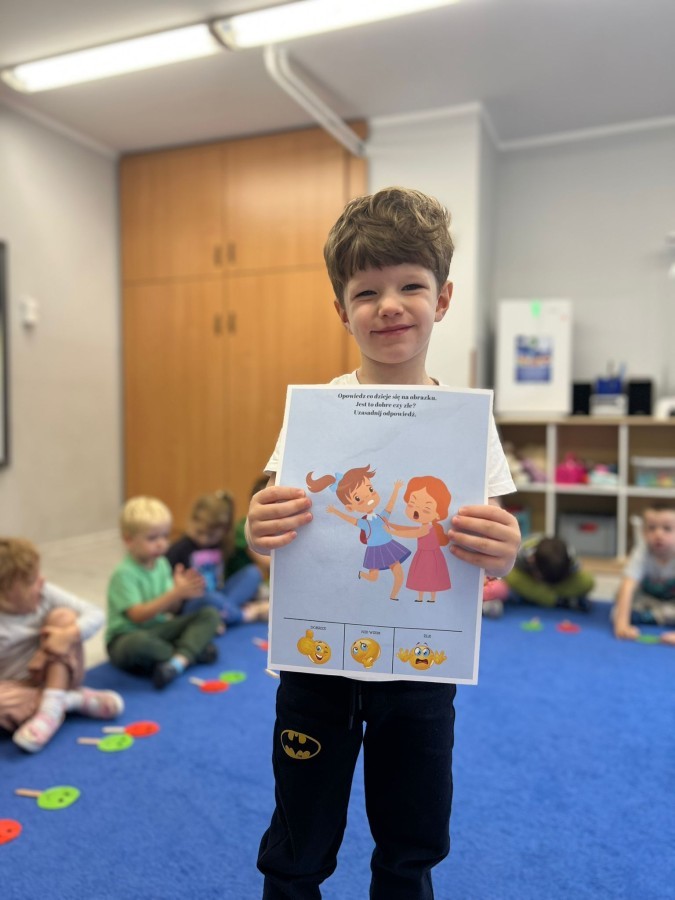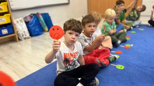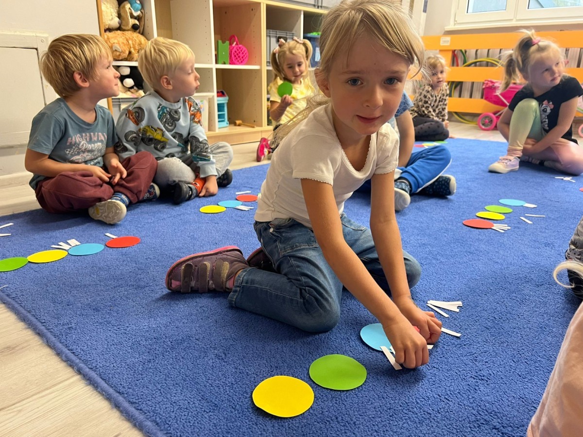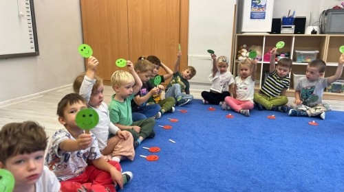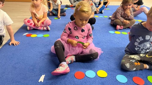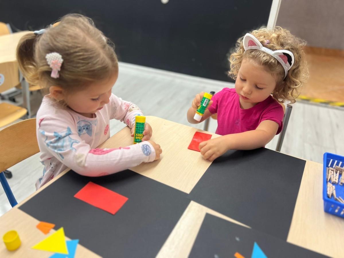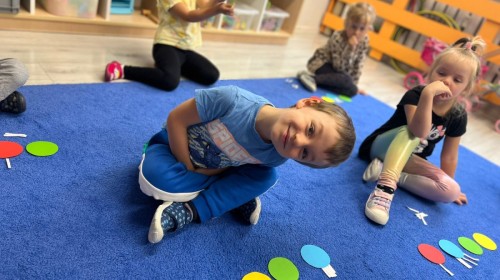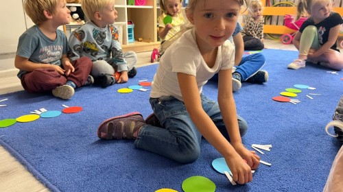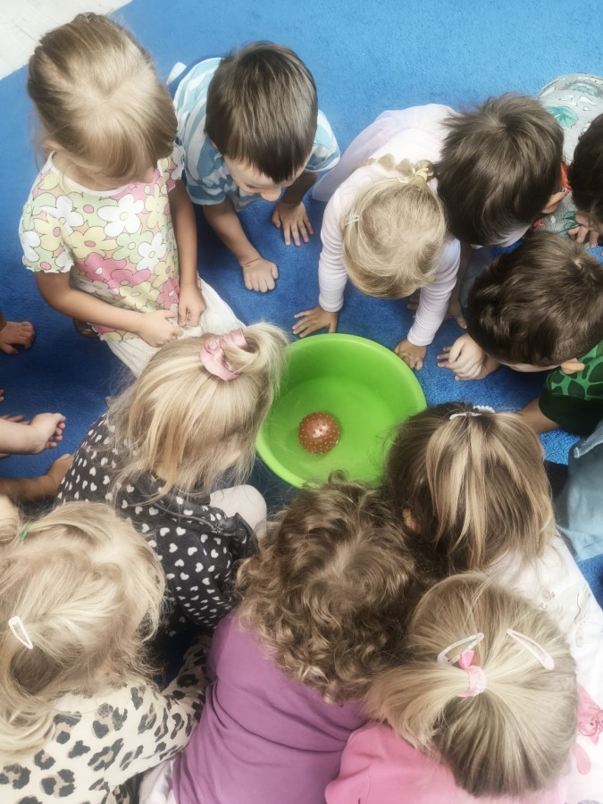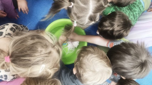 W tym tygodniu dzieci wykonywały różne eksperymenty z wodą, obserwując zachowania poszczególnych przedmiotów w wodzie, robiły wodną orkiestrę z wykorzystaniem kubeczka z wodą i słomki oraz poznawały jej właściwości. Dzieci miały też okazję malować na wodnym arkuszu i obserwować zachowanie rozchodzących się barw oraz ich mieszanie i powstawanie kolorów pochodnych. Utrwaliły również kształty i kolory podczas zajęć z przeliczania na konkretach (torty i świeczki)do 4 oraz przy tworzeniu pracy plastycznej z figur geometrycznych. Pod koniec tygodnia miały miejsce również rozmowy na temat dobrych i złych zachowań, akceptowalnych i nieakceptowalnych w danej sytuacji oraz na temat emocji im towarzyszących. Rozważaliśmy z dziećmi, w jakich sytuacjach czujemy strach, złość, smutek, radość i dumę. Szukaliśmy sposobów, jak sobie radzić ze smutkiem, ale też zauważyliśmy, że czasem każdy z nas czuje potrzebę posmucić się i to jest ok.