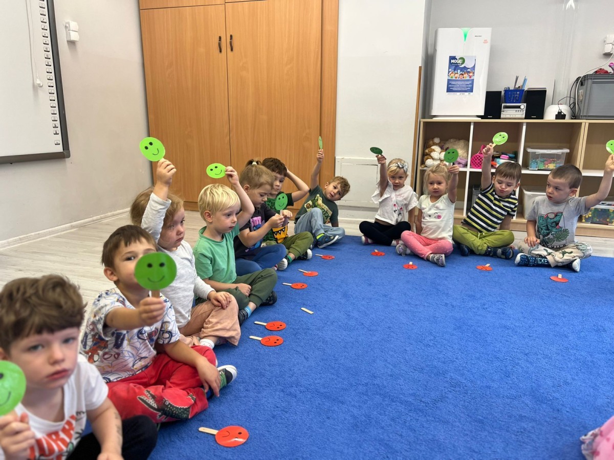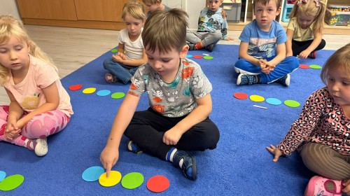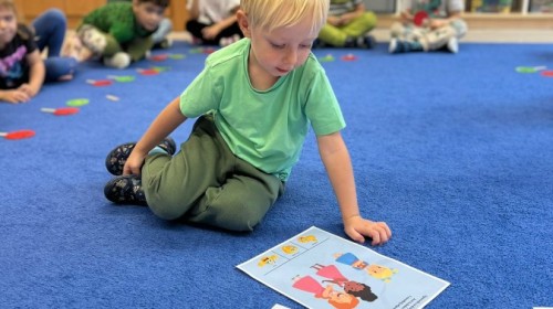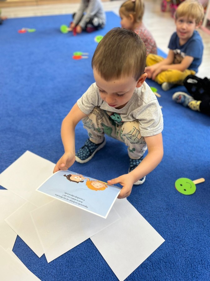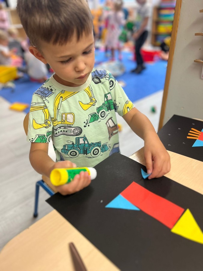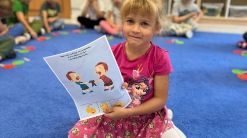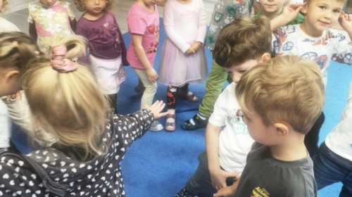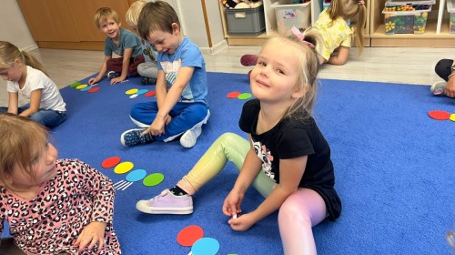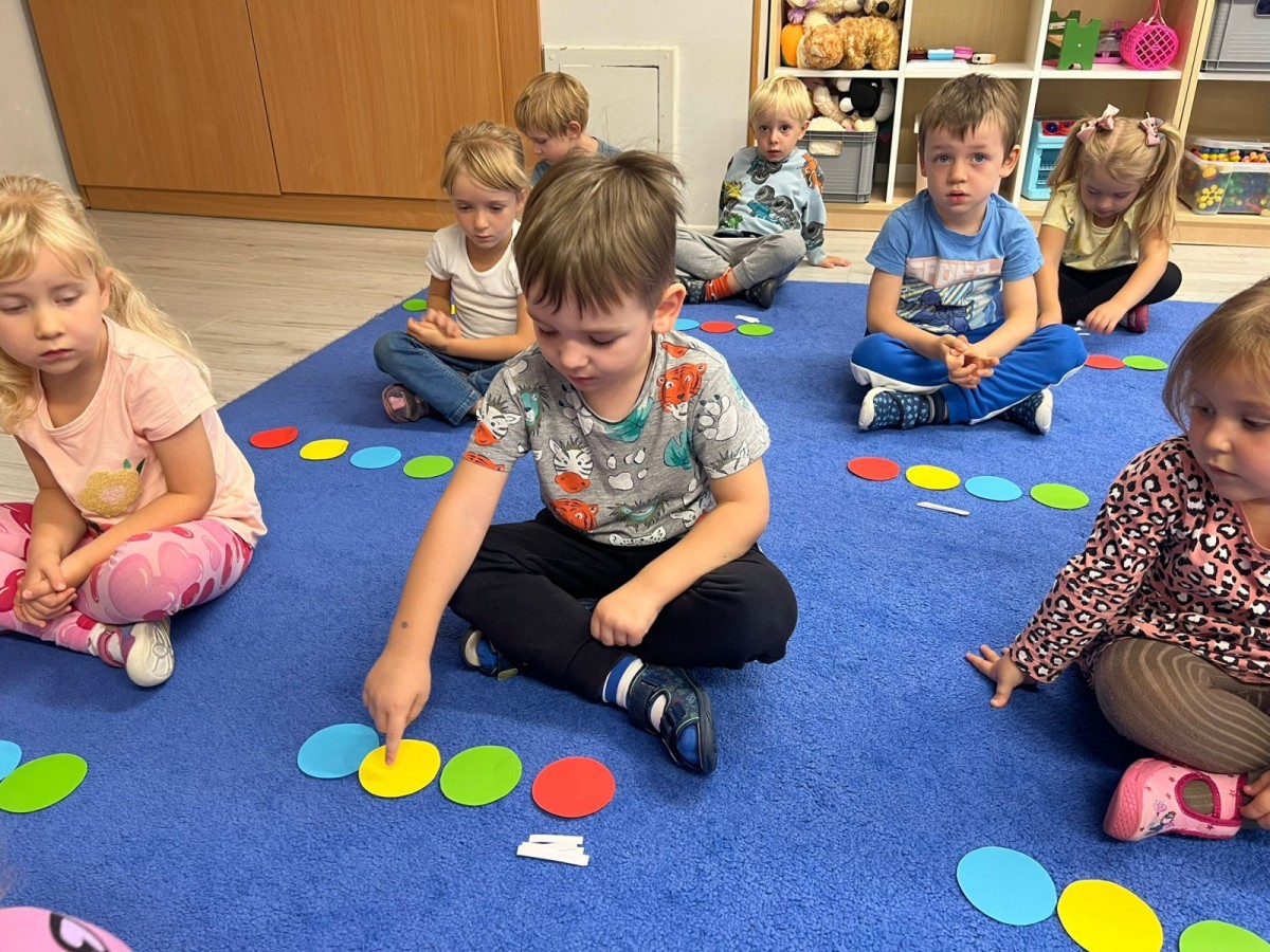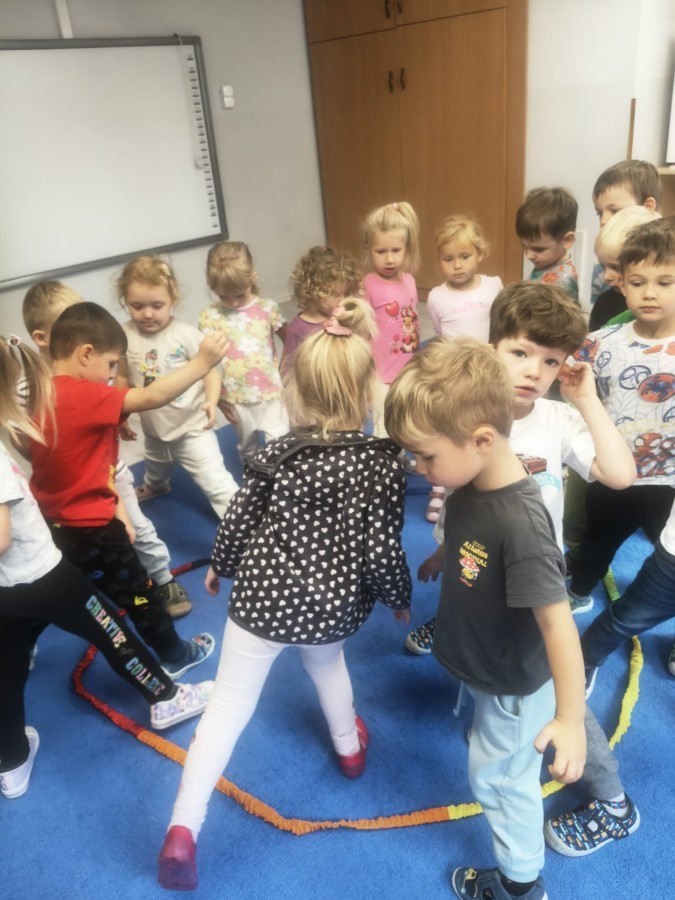 W tym tygodniu dzieci wykonywały różne eksperymenty z wodą, obserwując zachowania poszczególnych przedmiotów w wodzie, robiły wodną orkiestrę z wykorzystaniem kubeczka z wodą i słomki oraz poznawały jej właściwości. Dzieci miały też okazję malować na wodnym arkuszu i obserwować zachowanie rozchodzących się barw oraz ich mieszanie i powstawanie kolorów pochodnych. Utrwaliły również kształty i kolory podczas zajęć z przeliczania na konkretach (torty i świeczki)do 4 oraz przy tworzeniu pracy plastycznej z figur geometrycznych. Pod koniec tygodnia miały miejsce również rozmowy na temat dobrych i złych zachowań, akceptowalnych i nieakceptowalnych w danej sytuacji oraz na temat emocji im towarzyszących. Rozważaliśmy z dziećmi, w jakich sytuacjach czujemy strach, złość, smutek, radość i dumę. Szukaliśmy sposobów, jak sobie radzić ze smutkiem, ale też zauważyliśmy, że czasem każdy z nas czuje potrzebę posmucić się i to jest ok.