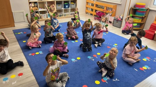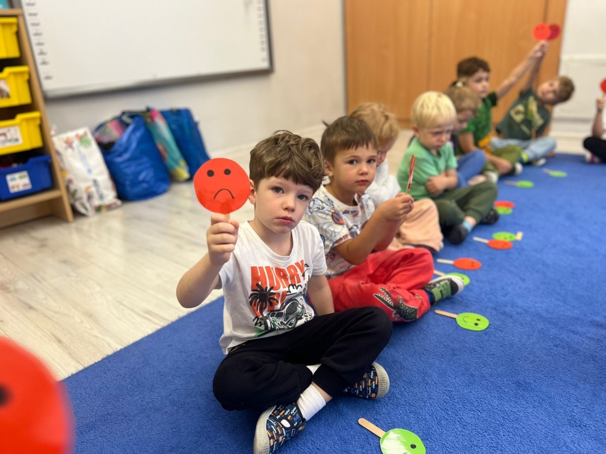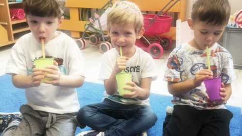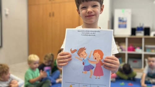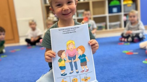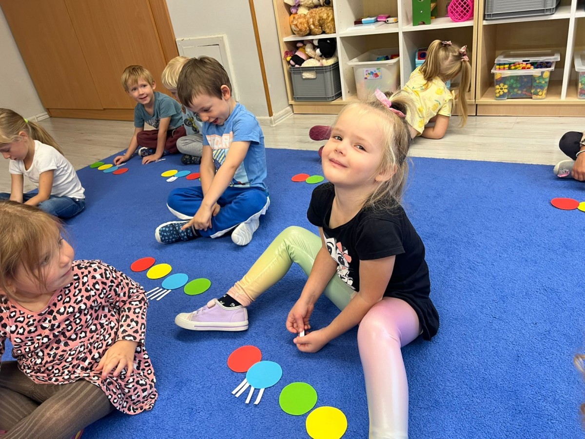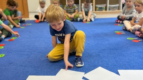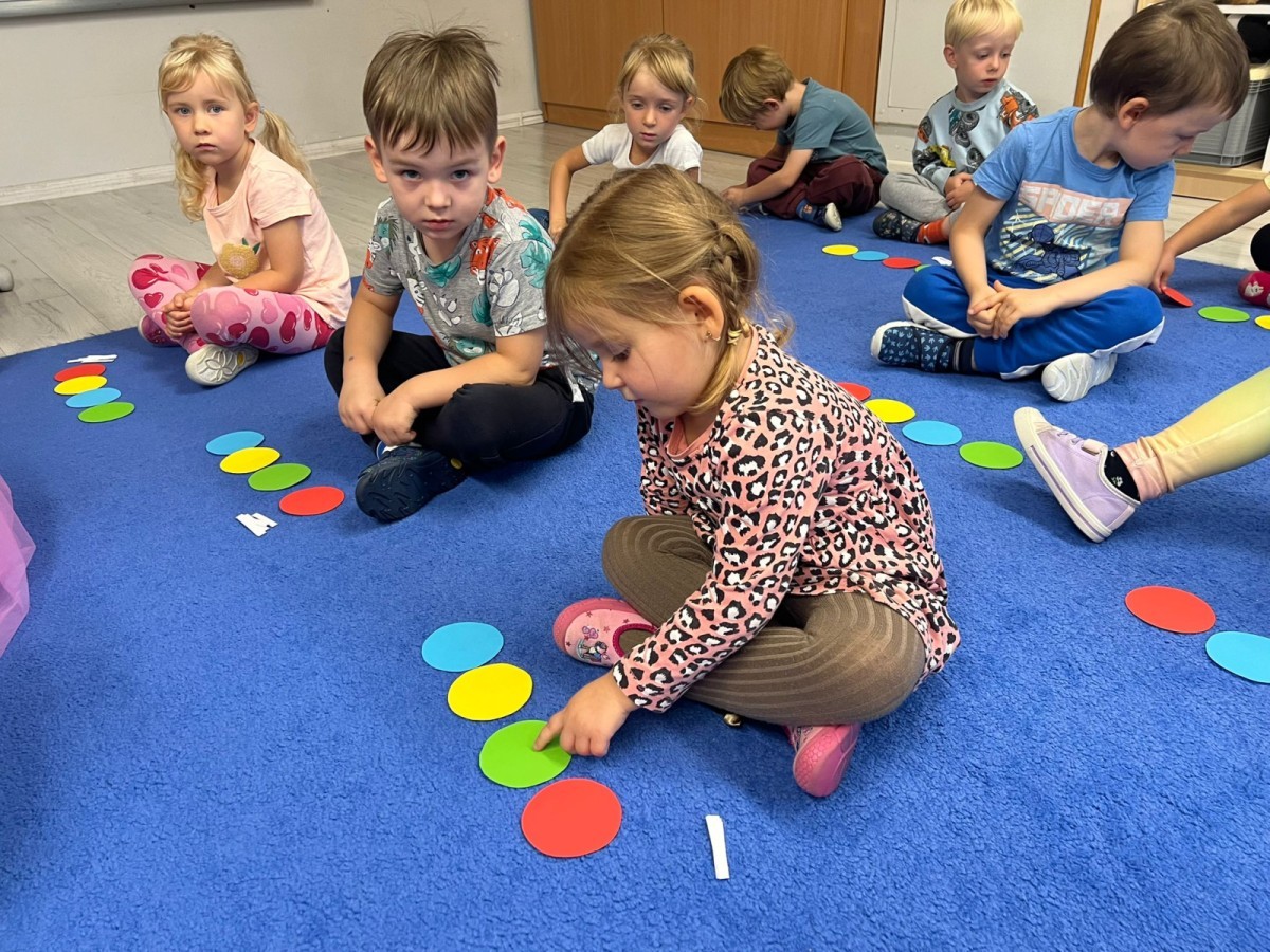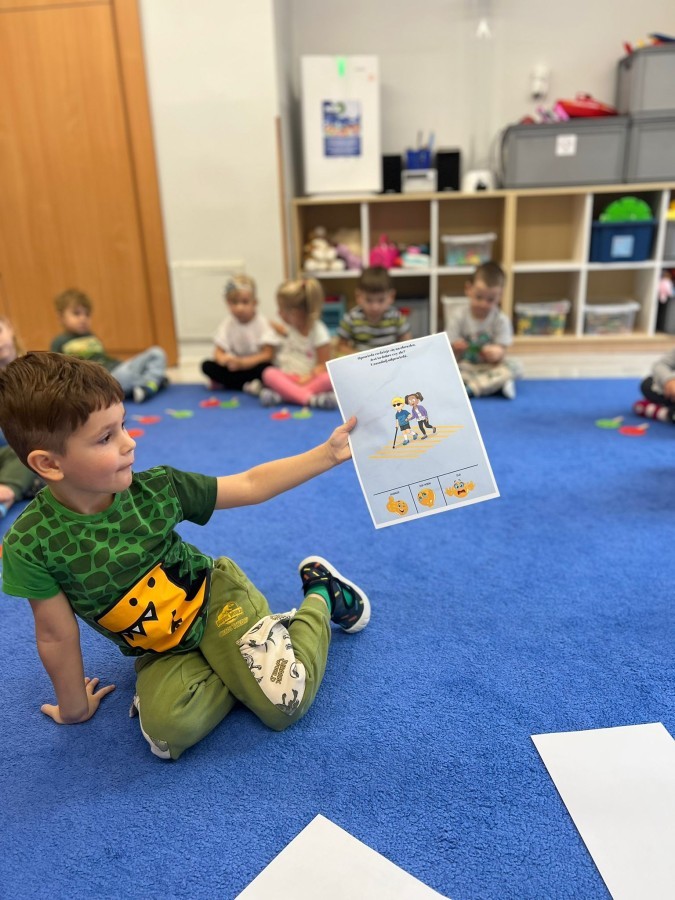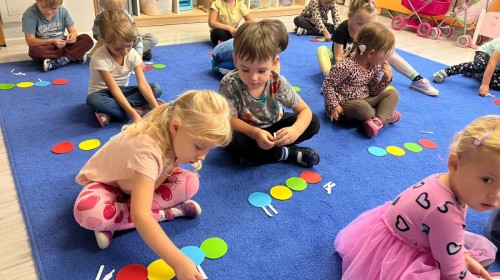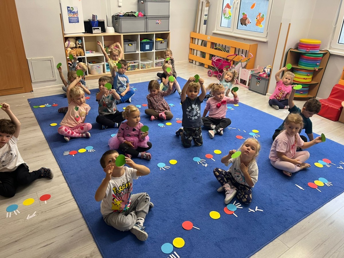 W tym tygodniu dzieci wykonywały różne eksperymenty z wodą, obserwując zachowania poszczególnych przedmiotów w wodzie, robiły wodną orkiestrę z wykorzystaniem kubeczka z wodą i słomki oraz poznawały jej właściwości. Dzieci miały też okazję malować na wodnym arkuszu i obserwować zachowanie rozchodzących się barw oraz ich mieszanie i powstawanie kolorów pochodnych. Utrwaliły również kształty i kolory podczas zajęć z przeliczania na konkretach (torty i świeczki)do 4 oraz przy tworzeniu pracy plastycznej z figur geometrycznych. Pod koniec tygodnia miały miejsce również rozmowy na temat dobrych i złych zachowań, akceptowalnych i nieakceptowalnych w danej sytuacji oraz na temat emocji im towarzyszących. Rozważaliśmy z dziećmi, w jakich sytuacjach czujemy strach, złość, smutek, radość i dumę. Szukaliśmy sposobów, jak sobie radzić ze smutkiem, ale też zauważyliśmy, że czasem każdy z nas czuje potrzebę posmucić się i to jest ok.