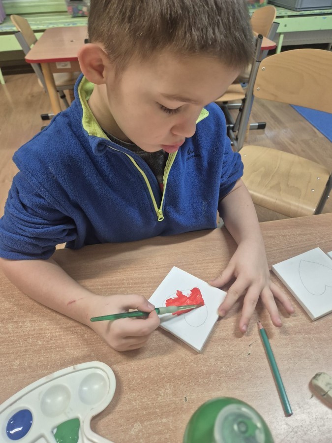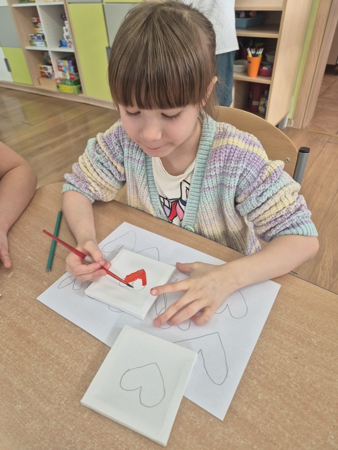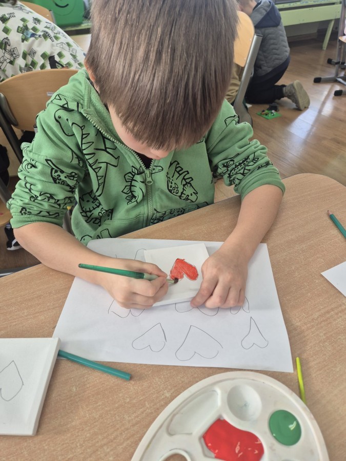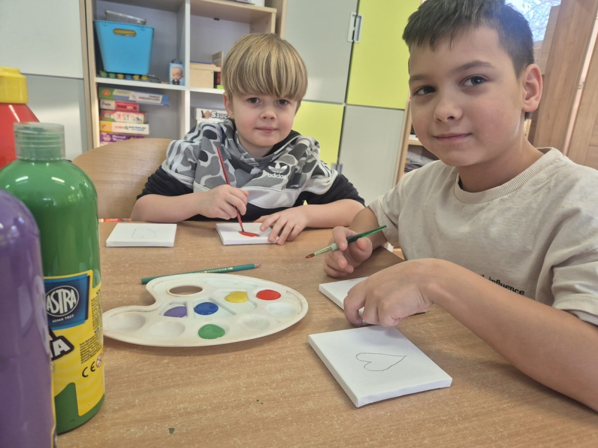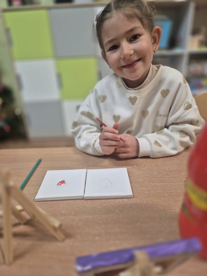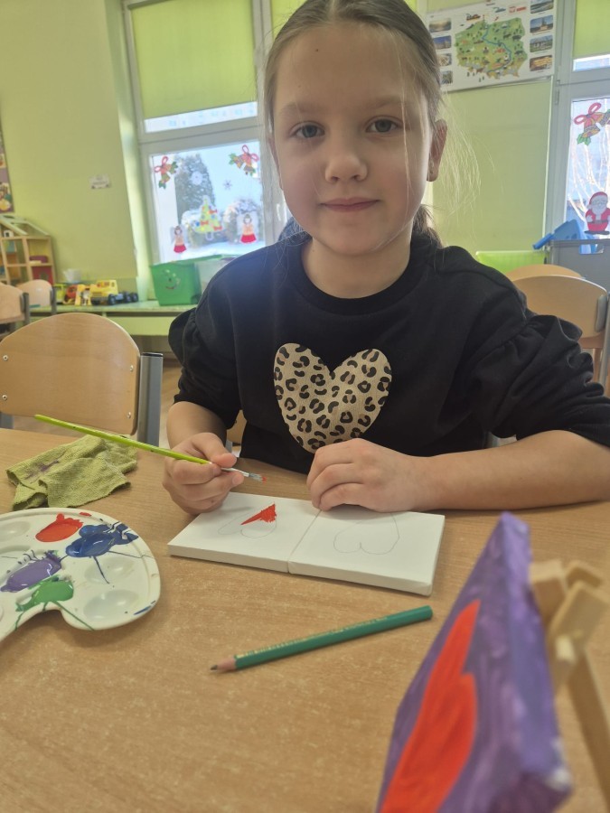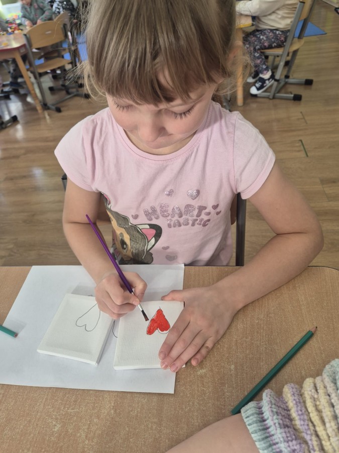 Z okazji zbliżającego się Dnia Babci i Dziadka dzieci z grupy Wilki z wielkim zaangażowaniem tworzyły wyjątkowe prezenty dla swoich bliskich. Najpierw dzieci szkicowały serca na małych podobraziach, ćwicząc precyzję i sprawność manualną. Następnie dobierały kolory farb, kierując się własną wyobraźnią i pomysłami, po czym malowały pędzlem swoje prace, wkładając w nie wiele serca i ciepłych uczuć. Każdy obrazek był niepowtarzalny i pełen emocji, a tworzeniu towarzyszyła radość oraz rozmowy o babciach