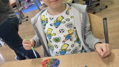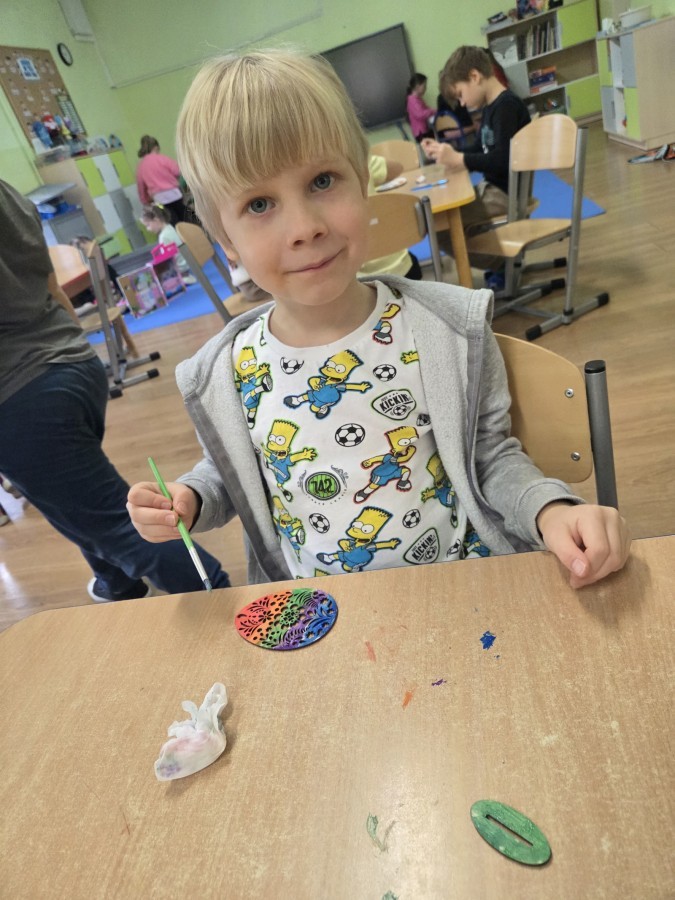 Każde z nich mogło wykazać się swoją pomysłowością i kreatywnością, tworząc niepowtarzalne, kolorowe wzory. W trakcie zajęć wykorzystano bogatą paletę barw, dzięki czemu powstały prawdziwe małe dzieła sztuki. Podczas pracy panowała miła i twórcza atmosfera, a dzieci z dumą prezentowały swoje prace kolegom i koleżankom. Wykonane jajka zostaną zaprezentowane na kiermaszu wielkanocnym, gdzie z pewnością zachwycą wszystkich odwiedzających. Zajęcia nie tylko rozwijały zdolności manualne i wyobraźnię dzieci, ale również wprowadziły je w radosny nastrój zbliżających się Świąt Wielkanocnych.