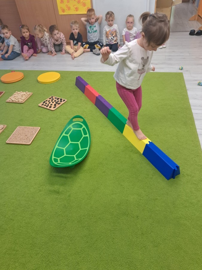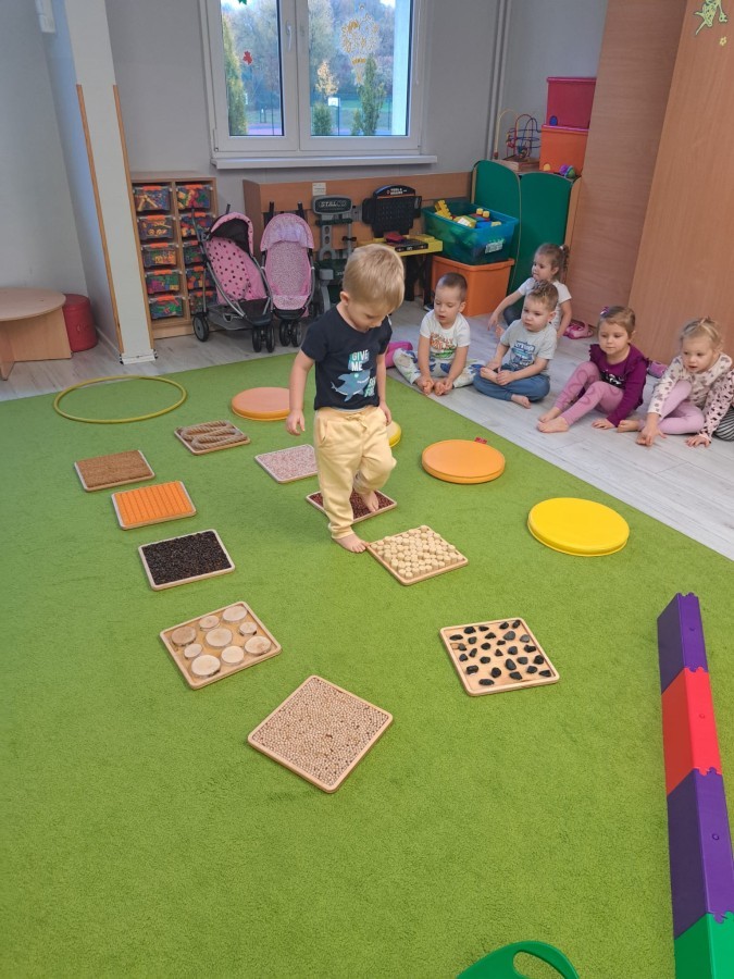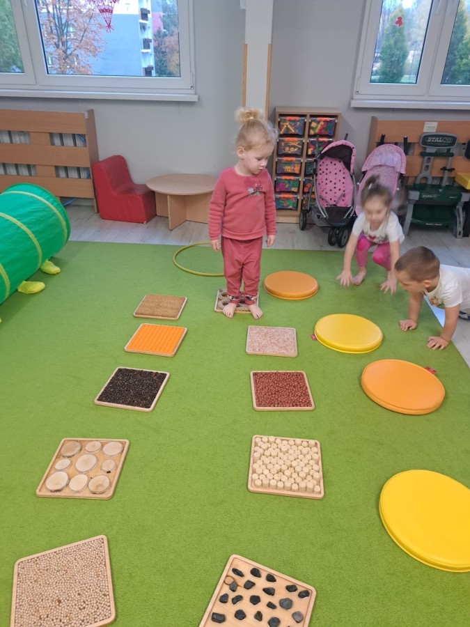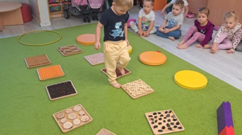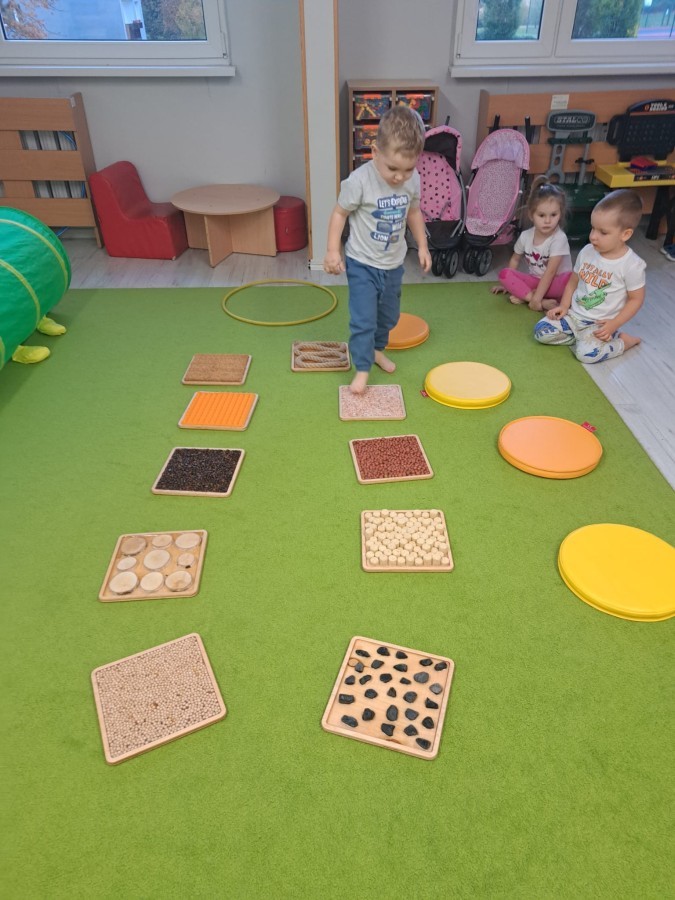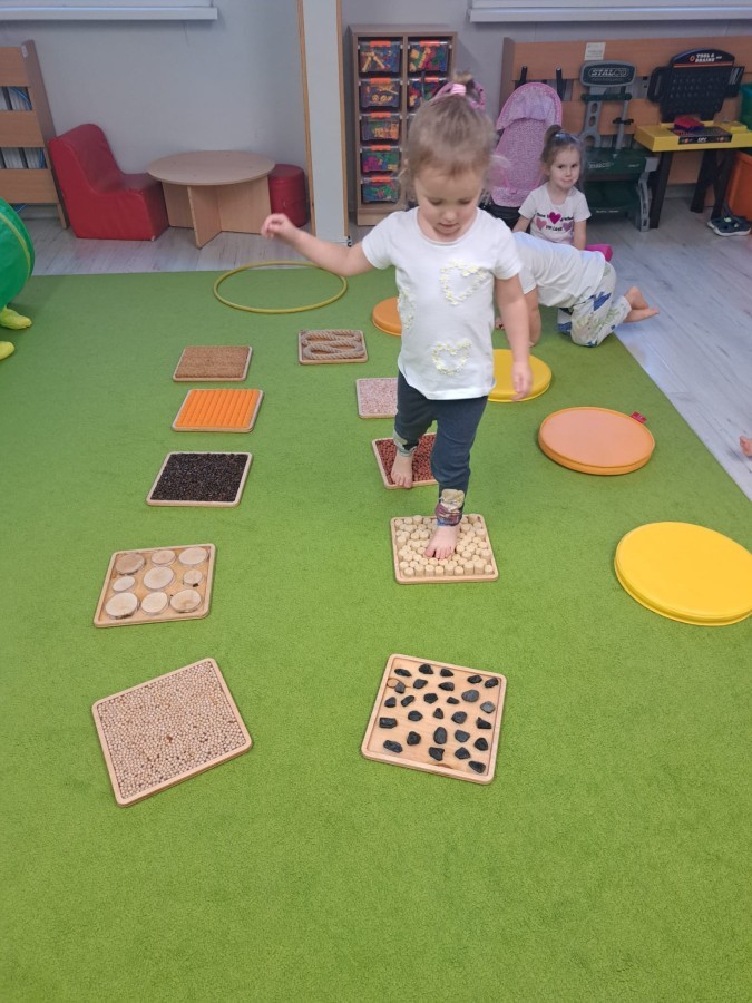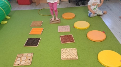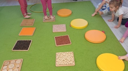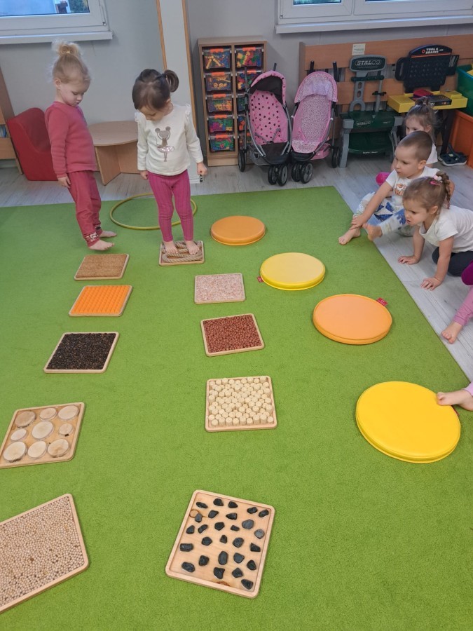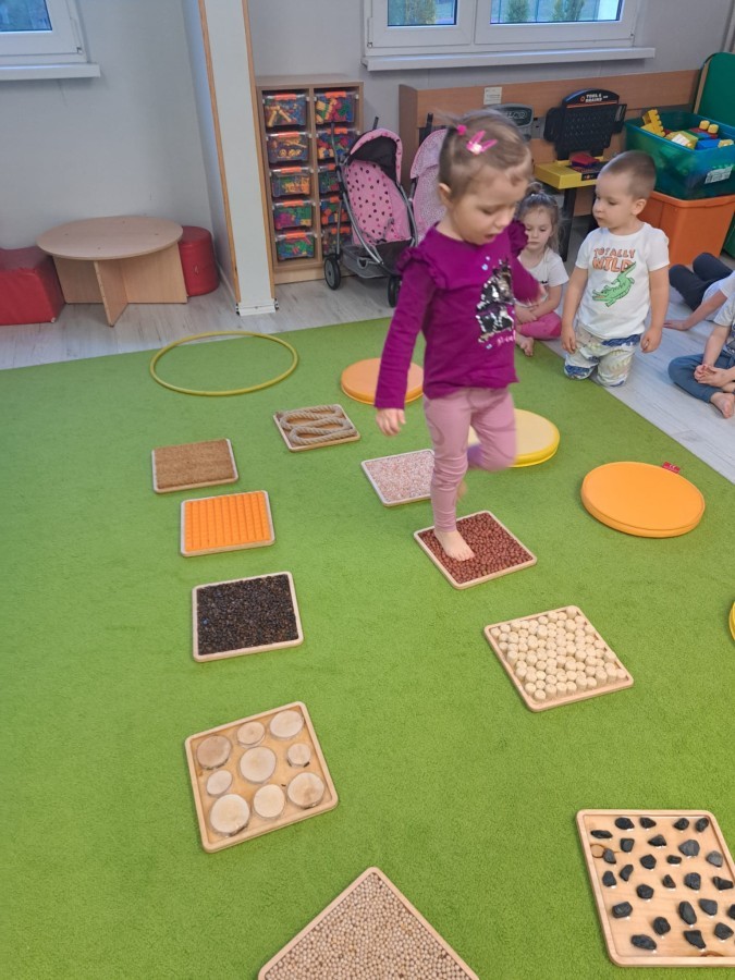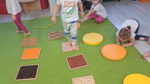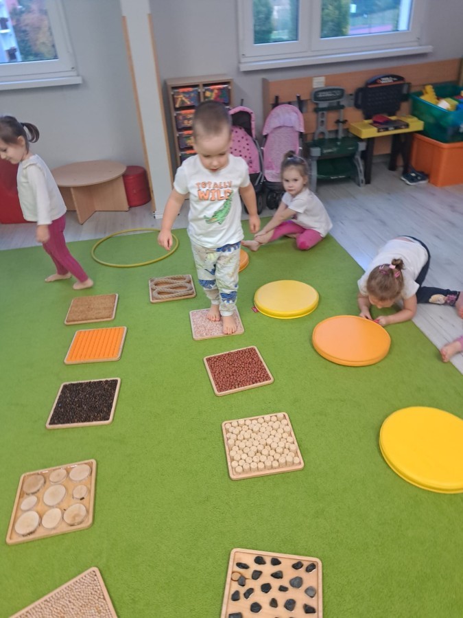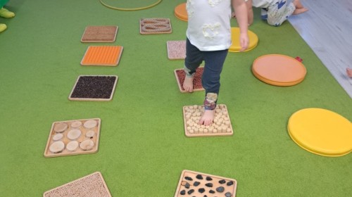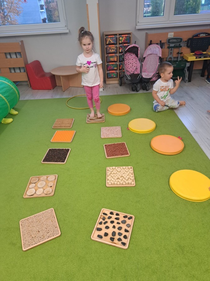 i przechodząc po niej boso, dzieci doświadczały różnorodnych faktur, co stymulowało zmysł dotyku, rozwijało koordynację ruchową