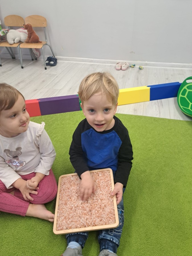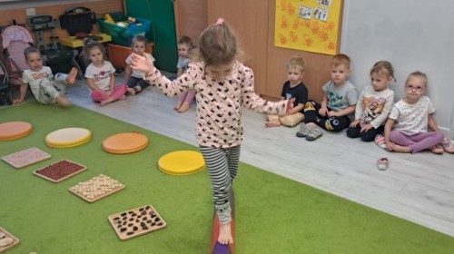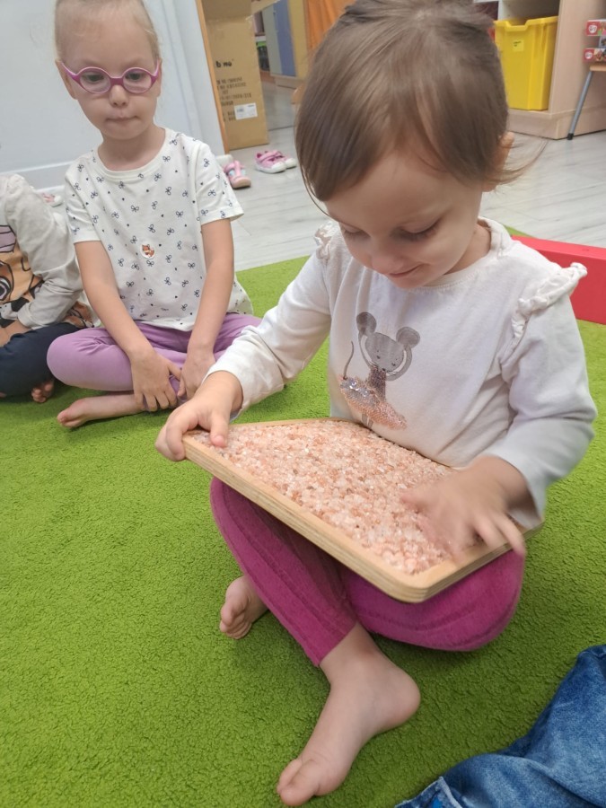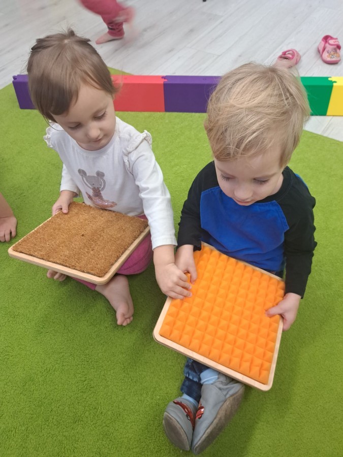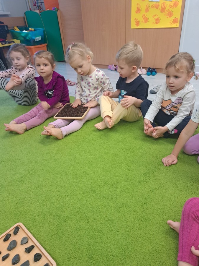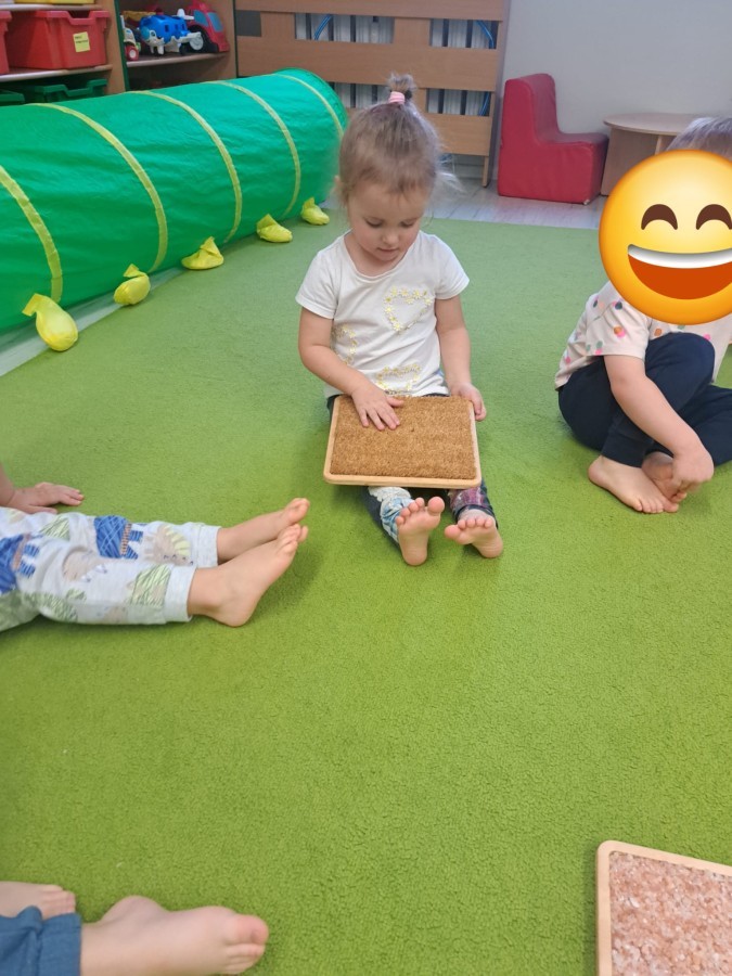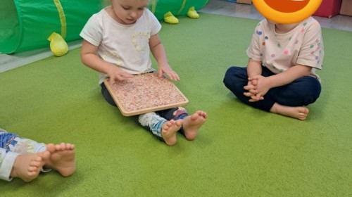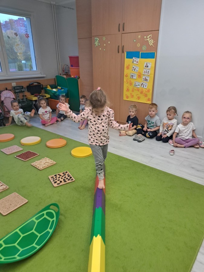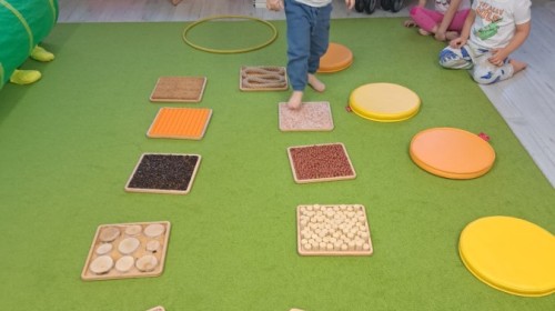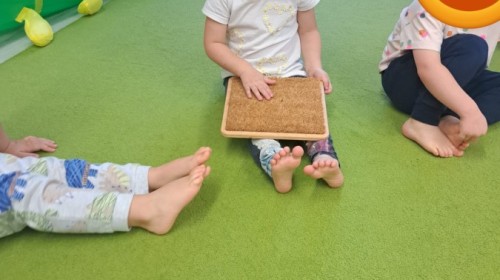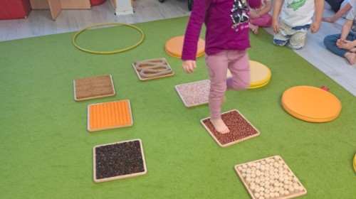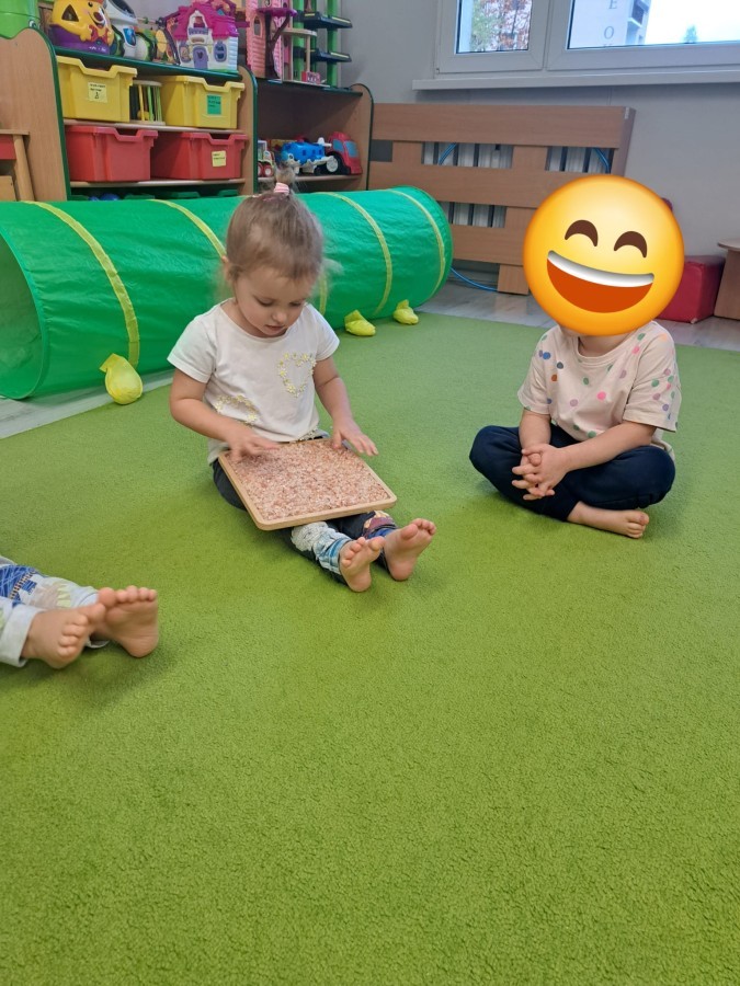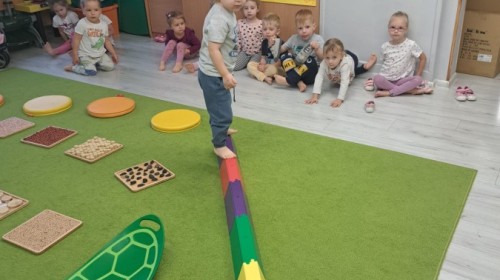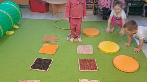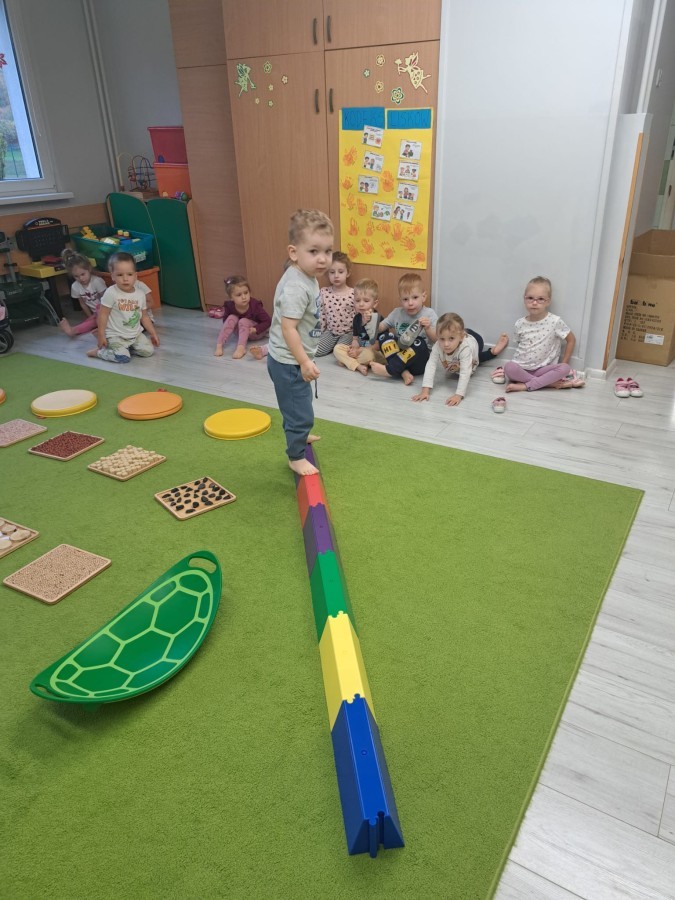 i przechodząc po niej boso, dzieci doświadczały różnorodnych faktur, co stymulowało zmysł dotyku, rozwijało koordynację ruchową
