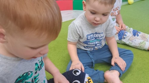 Grupa "Liski" uczestniczyła w zajęciach z wykorzystaniem ścieżki sensorycznej oraz toru przeszkód. Dotykając ścieżki dłońmi