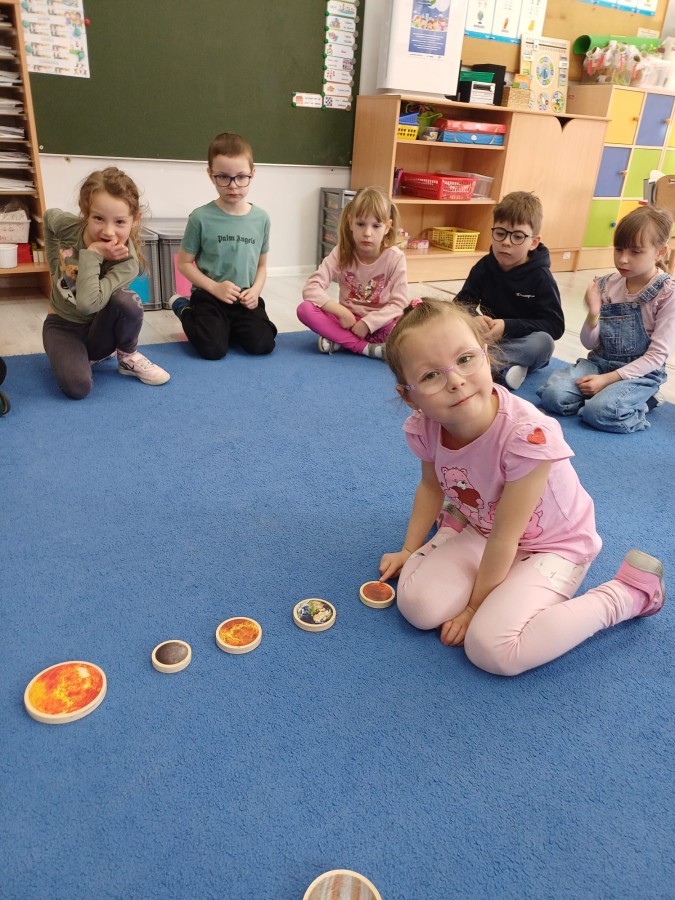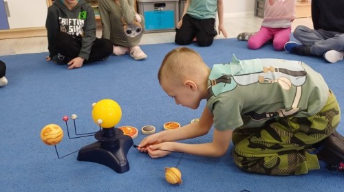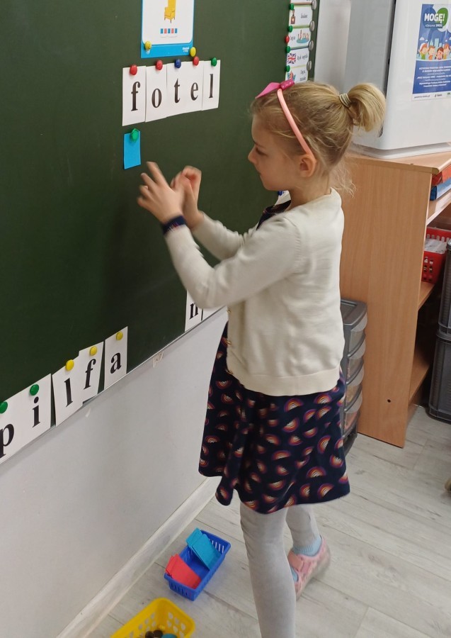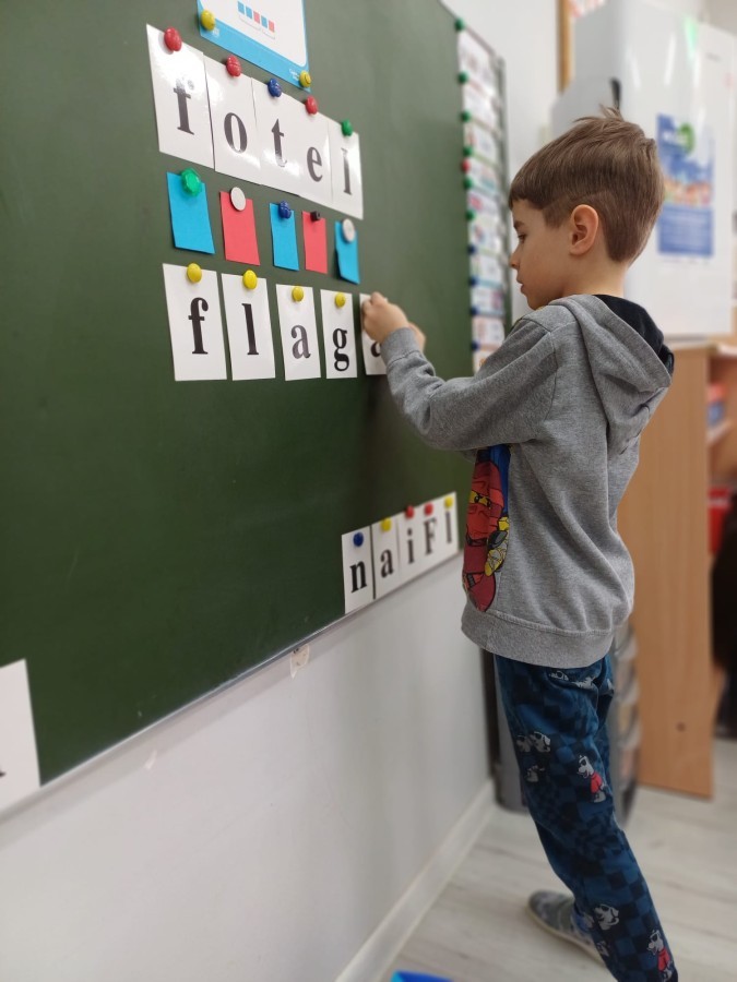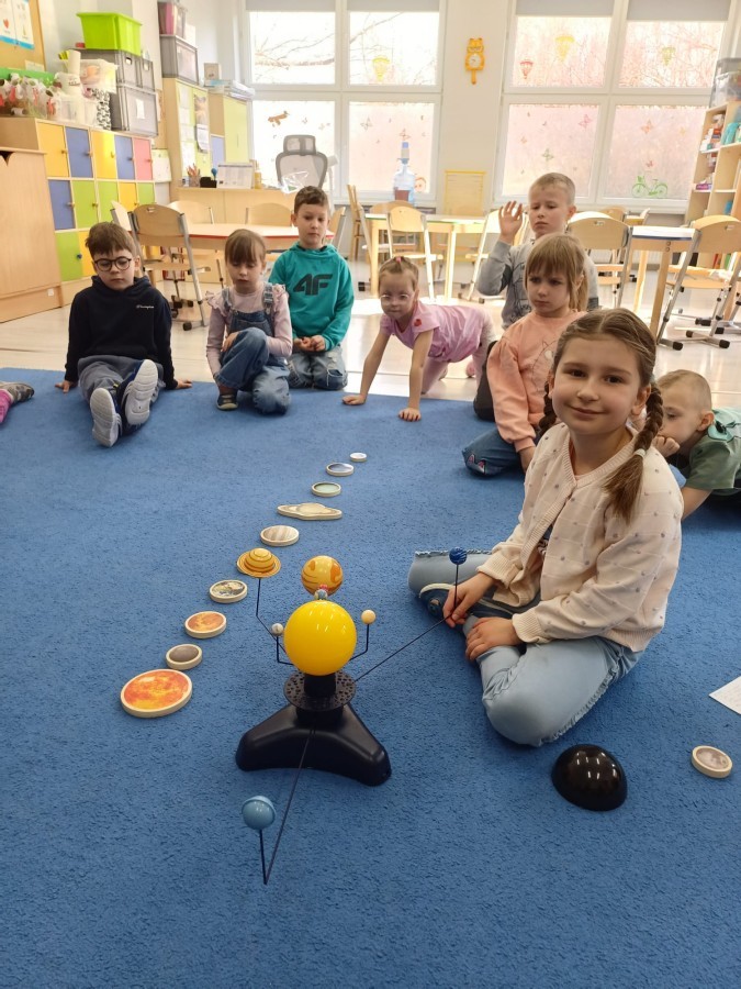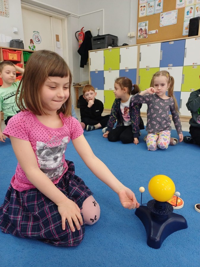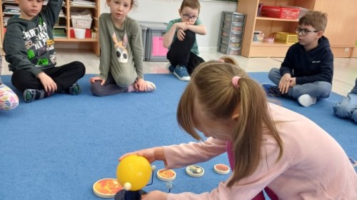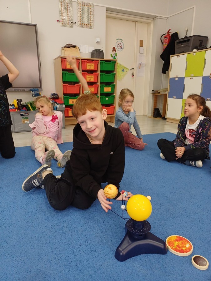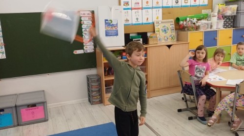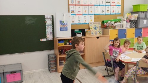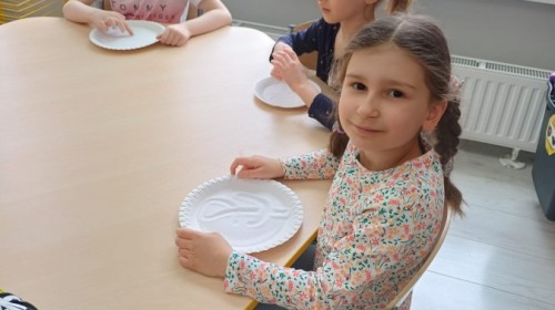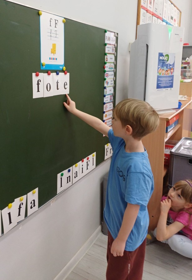 W minionym tygodniu dzieci z grupy Sówek poznały kolejną pisaną literę: "F i f". Aby móc lepiej zapoznać się z jej kształtem oraz poćwiczyć zapisywanie, otrzymały papierowe talerzyki, na których wysypana została sól. Pisząc palcem, mogły wielokrotnie powtórzyć jej kształt. Próbowały zapisać ją także w liniaturze, na tablicy. Tworzyły i odczytywały wyrazy rozpoczynające cię na f i F, utrwalając sobie pozostałe poznane litery oraz zasadę pisowni imion wielką literą. Ponadto Sówki w tym tygodniu wybrały się w podróż po kosmosie. Dzieliły się zgromadzoną już na ten temat wiedzą, jak również zdobywały nowe wiadomości. Ciekawym odkryciem okazało się działanie siły dośrodkowej, która w magiczny- fizyczny sposób utrzymuje krążące obiekty na właściwym torze, nie pozwalając im upaść. W tym tygodniu starszaki wykonały pracę plastycznej, związaną z tematem tygodnia- własny projekt rakiety kosmicznej. Próbowały również swoich sił w rysowaniu oburącz po śladzie, ćwicząc równocześnie obie półkule mózgu.