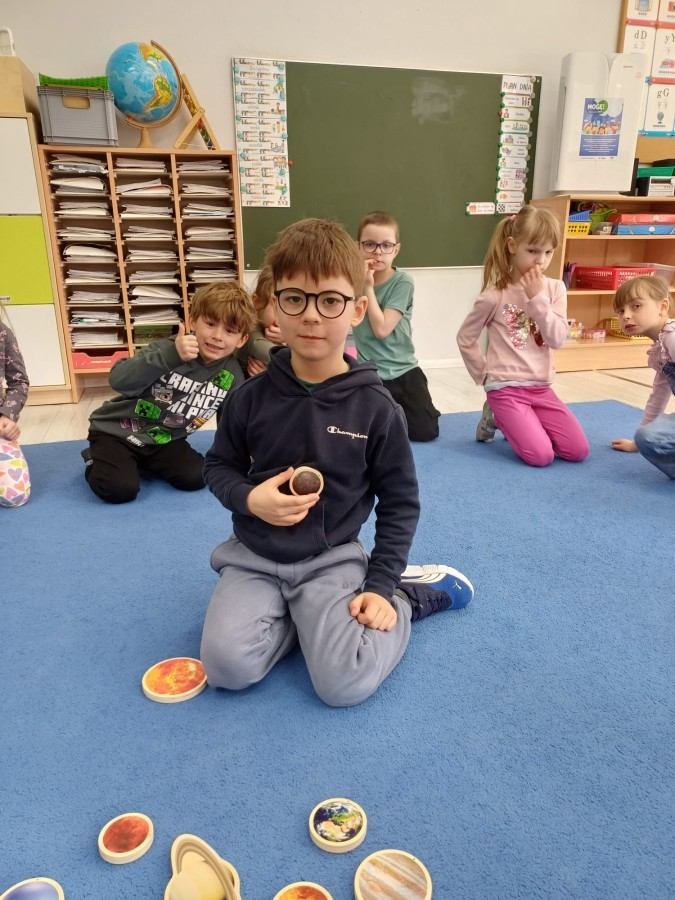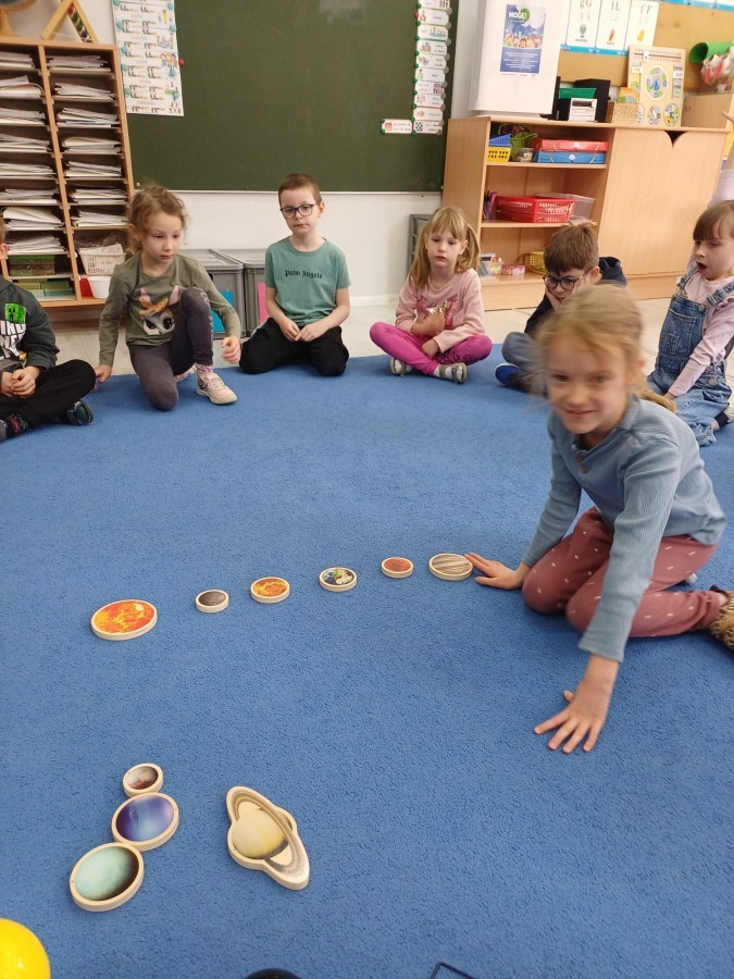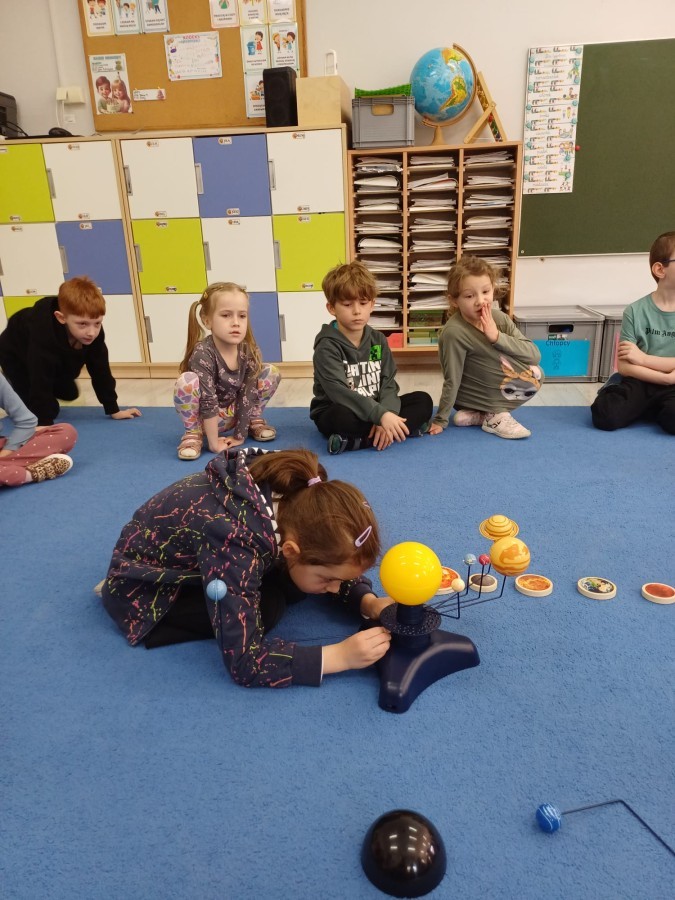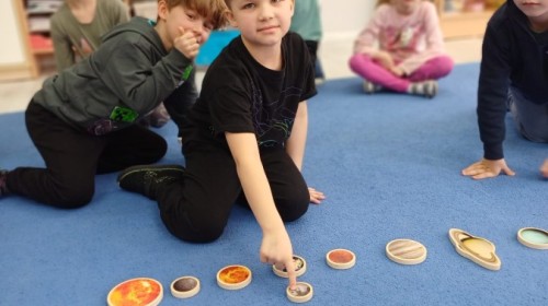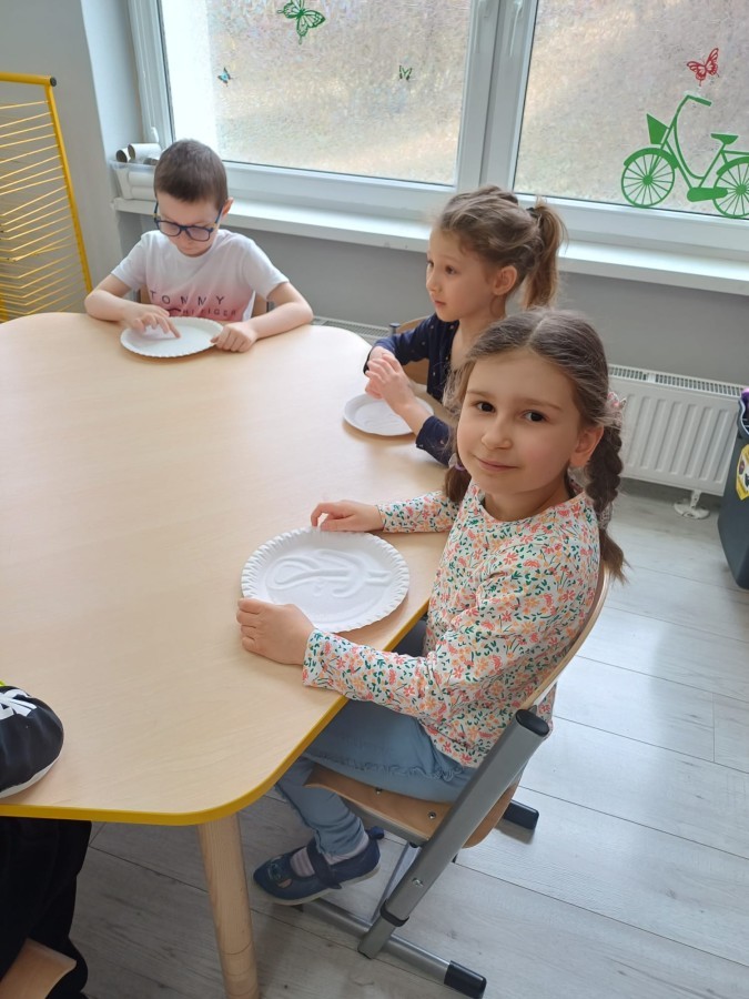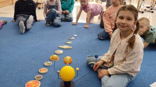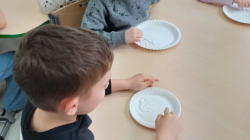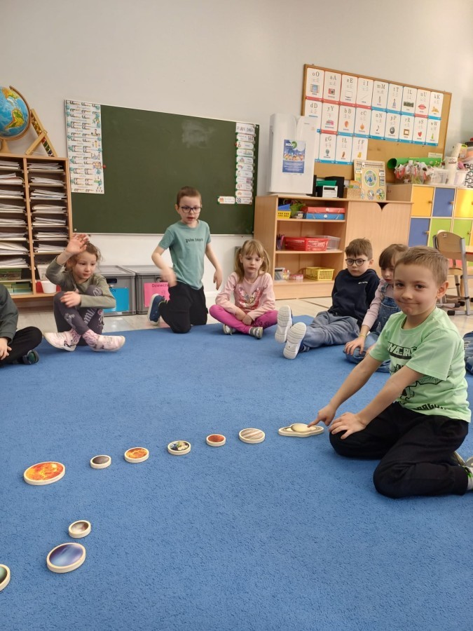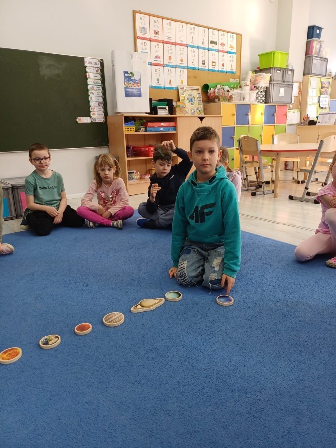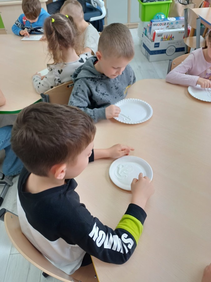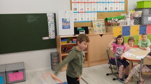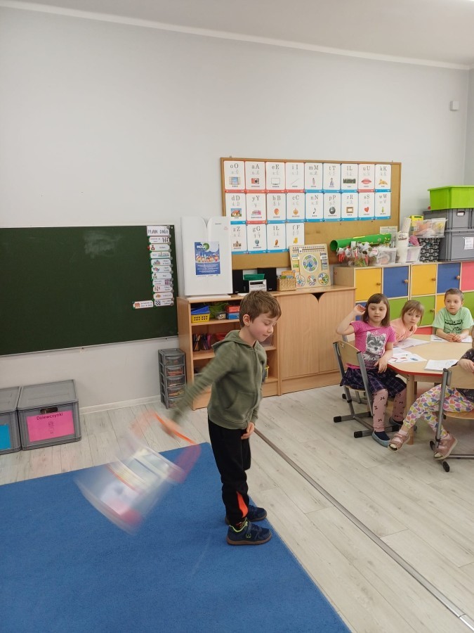W minionym tygodniu dzieci z grupy Sówek poznały kolejną pisaną literę: "F i f". Aby móc lepiej zapoznać się z jej kształtem oraz poćwiczyć zapisywanie, otrzymały papierowe talerzyki, na których wysypana została sól. Pisząc palcem, mogły wielokrotnie powtórzyć jej kształt. Próbowały zapisać ją także w liniaturze, na tablicy. Tworzyły i odczytywały wyrazy rozpoczynające cię na f i F, utrwalając sobie pozostałe poznane litery oraz zasadę pisowni imion wielką literą. Ponadto Sówki w tym tygodniu wybrały się w podróż po kosmosie. Dzieliły się zgromadzoną już na ten temat wiedzą, jak również zdobywały nowe wiadomości. Ciekawym odkryciem okazało się działanie siły dośrodkowej, która w magiczny- fizyczny sposób utrzymuje krążące obiekty na właściwym torze, nie pozwalając im upaść. W tym tygodniu starszaki wykonały pracę plastycznej, związaną z tematem tygodnia- własny projekt rakiety kosmicznej. Próbowały również swoich sił w rysowaniu oburącz po śladzie, ćwicząc równocześnie obie półkule mózgu.