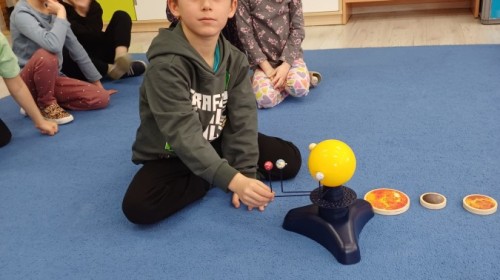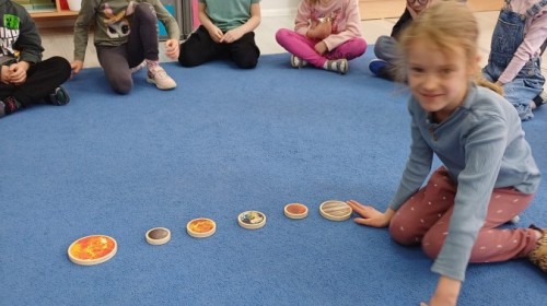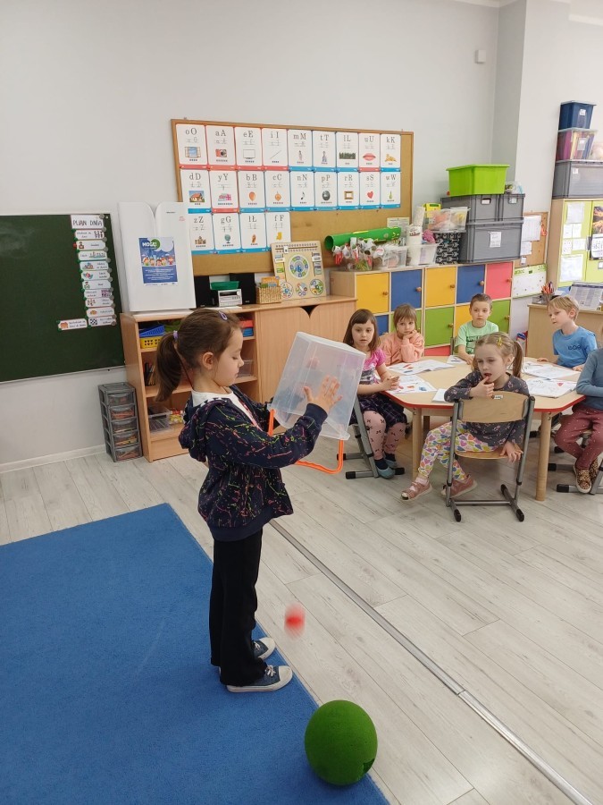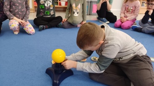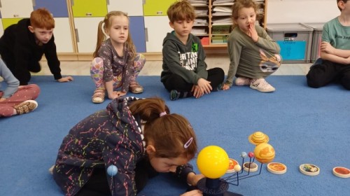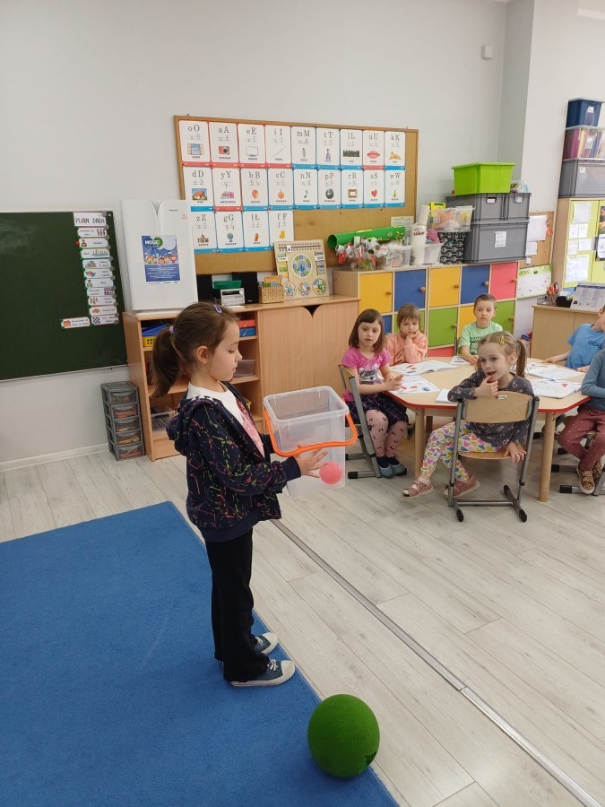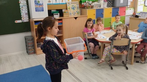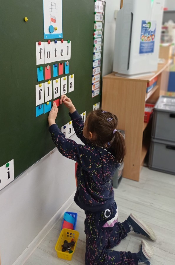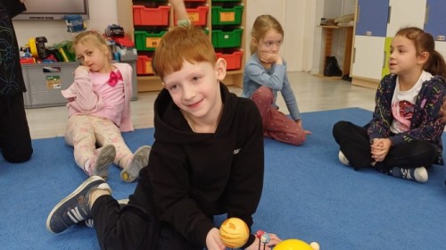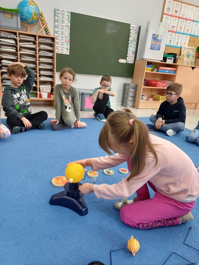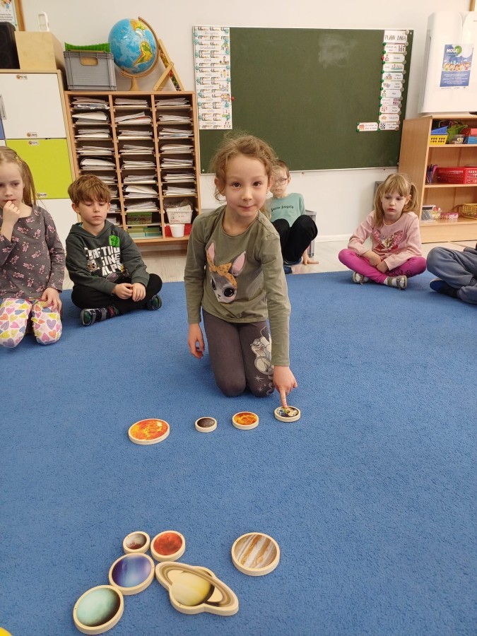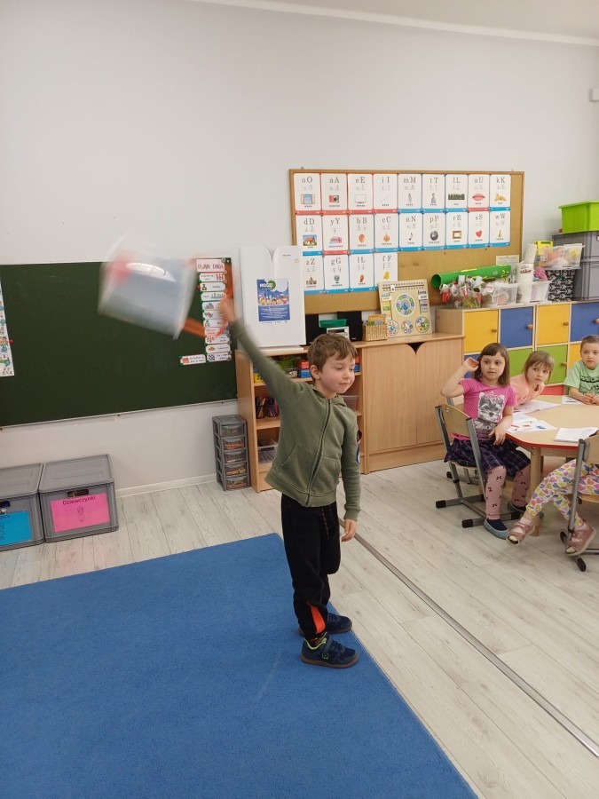 W minionym tygodniu dzieci z grupy Sówek poznały kolejną pisaną literę: "F i f". Aby móc lepiej zapoznać się z jej kształtem oraz poćwiczyć zapisywanie, otrzymały papierowe talerzyki, na których wysypana została sól. Pisząc palcem, mogły wielokrotnie powtórzyć jej kształt. Próbowały zapisać ją także w liniaturze, na tablicy. Tworzyły i odczytywały wyrazy rozpoczynające cię na f i F, utrwalając sobie pozostałe poznane litery oraz zasadę pisowni imion wielką literą. Ponadto Sówki w tym tygodniu wybrały się w podróż po kosmosie. Dzieliły się zgromadzoną już na ten temat wiedzą, jak również zdobywały nowe wiadomości. Ciekawym odkryciem okazało się działanie siły dośrodkowej, która w magiczny- fizyczny sposób utrzymuje krążące obiekty na właściwym torze, nie pozwalając im upaść. W tym tygodniu starszaki wykonały pracę plastycznej, związaną z tematem tygodnia- własny projekt rakiety kosmicznej. Próbowały również swoich sił w rysowaniu oburącz po śladzie, ćwicząc równocześnie obie półkule mózgu.