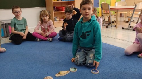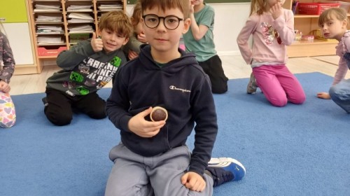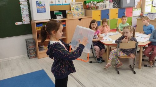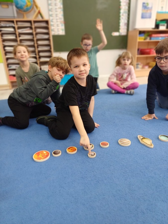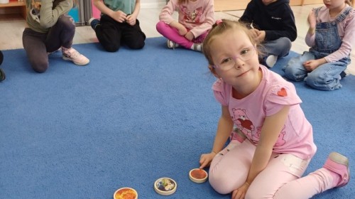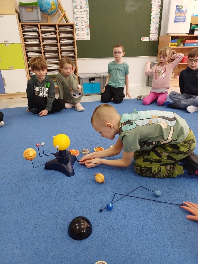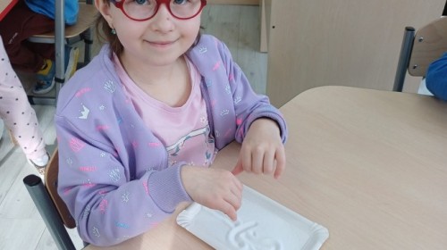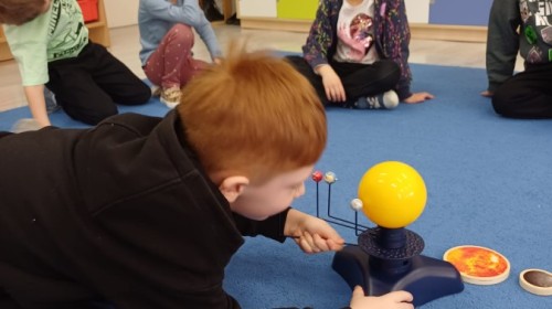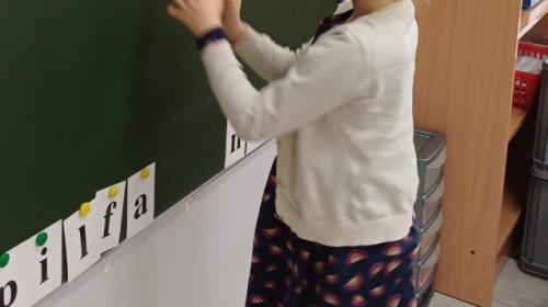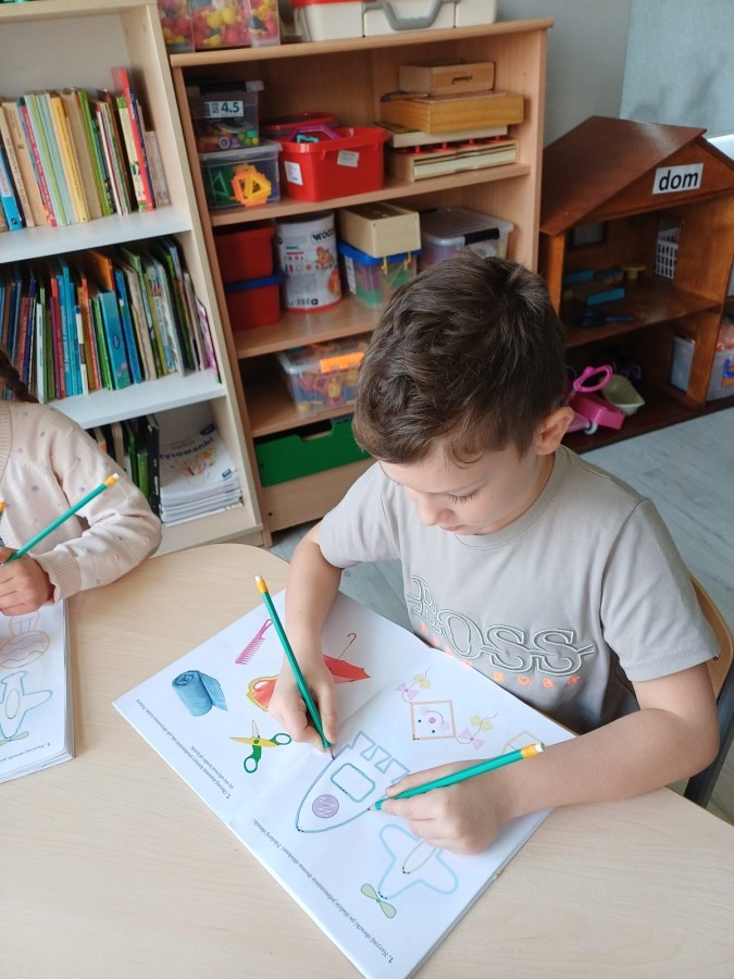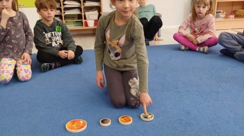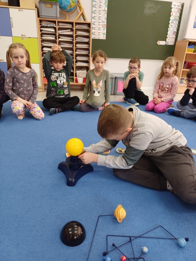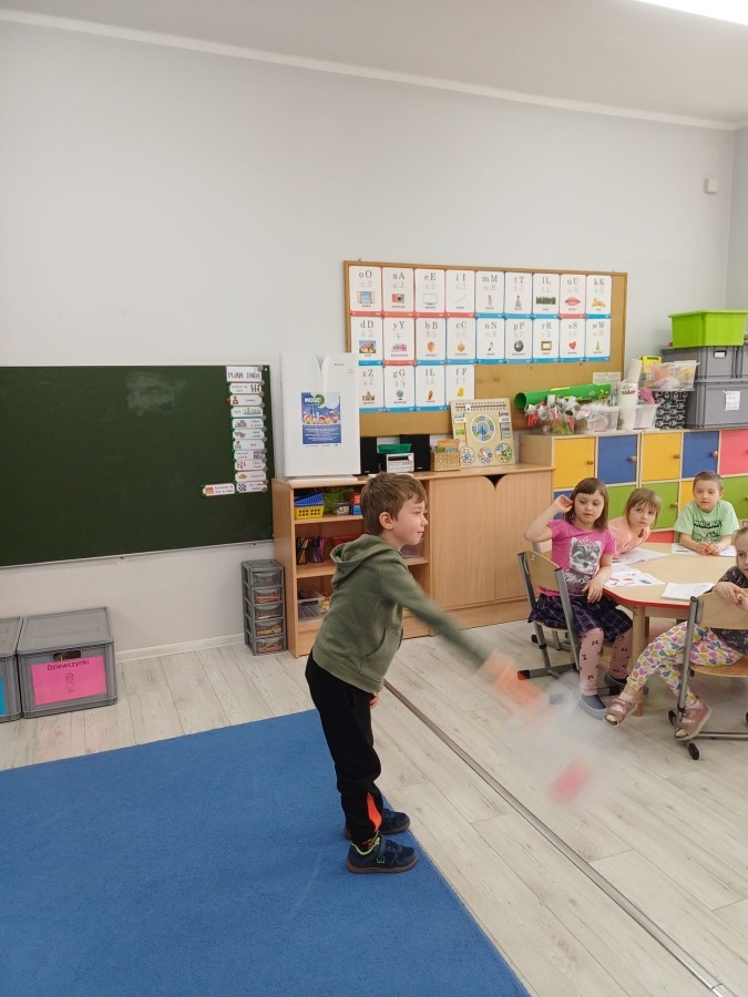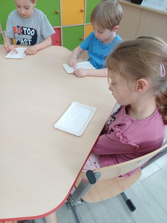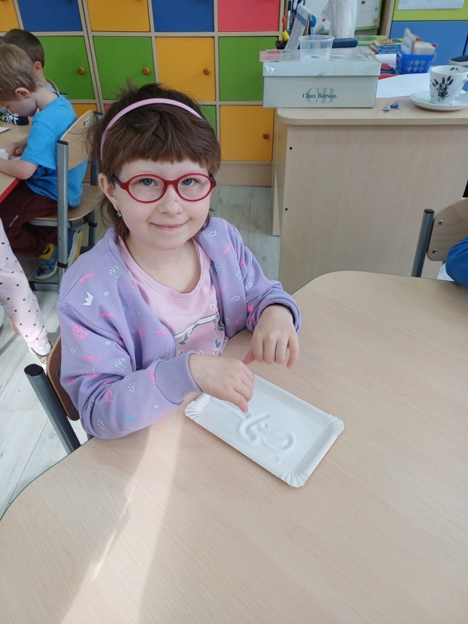 W minionym tygodniu dzieci z grupy Sówek poznały kolejną pisaną literę: "F i f". Aby móc lepiej zapoznać się z jej kształtem oraz poćwiczyć zapisywanie, otrzymały papierowe talerzyki, na których wysypana została sól. Pisząc palcem, mogły wielokrotnie powtórzyć jej kształt. Próbowały zapisać ją także w liniaturze, na tablicy. Tworzyły i odczytywały wyrazy rozpoczynające cię na f i F, utrwalając sobie pozostałe poznane litery oraz zasadę pisowni imion wielką literą. Ponadto Sówki w tym tygodniu wybrały się w podróż po kosmosie. Dzieliły się zgromadzoną już na ten temat wiedzą, jak również zdobywały nowe wiadomości. Ciekawym odkryciem okazało się działanie siły dośrodkowej, która w magiczny- fizyczny sposób utrzymuje krążące obiekty na właściwym torze, nie pozwalając im upaść. W tym tygodniu starszaki wykonały pracę plastycznej, związaną z tematem tygodnia- własny projekt rakiety kosmicznej. Próbowały również swoich sił w rysowaniu oburącz po śladzie, ćwicząc równocześnie obie półkule mózgu.