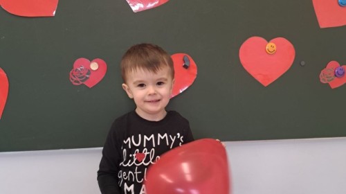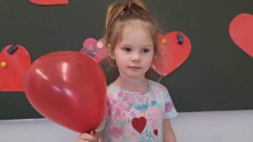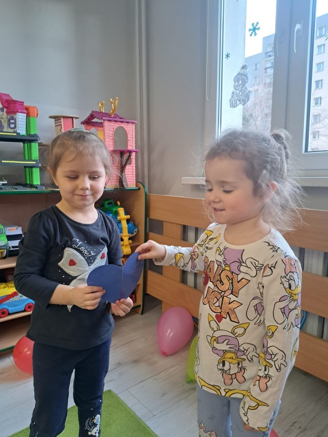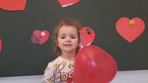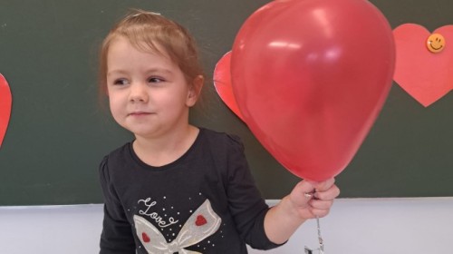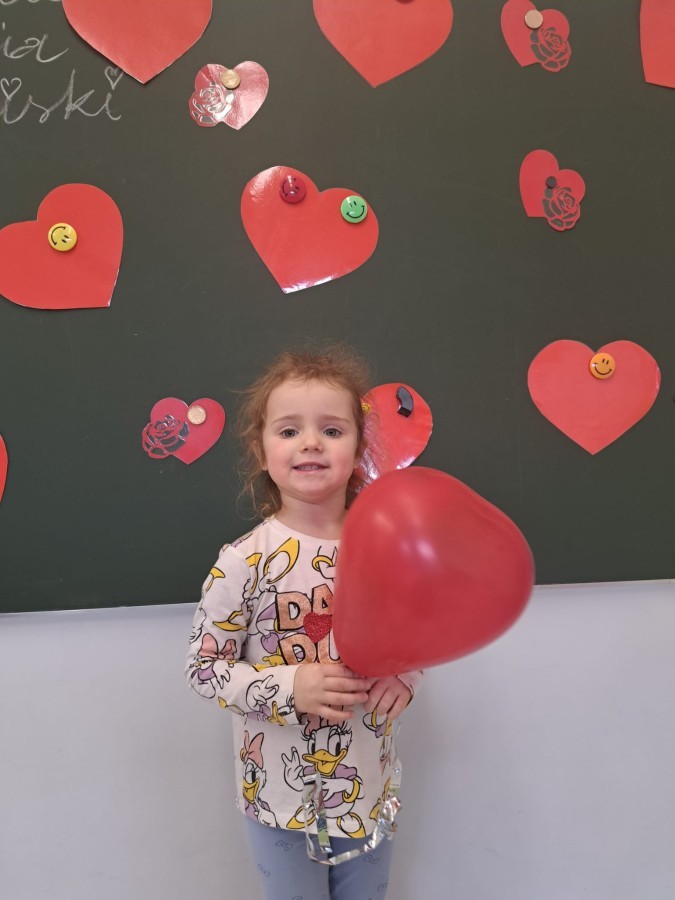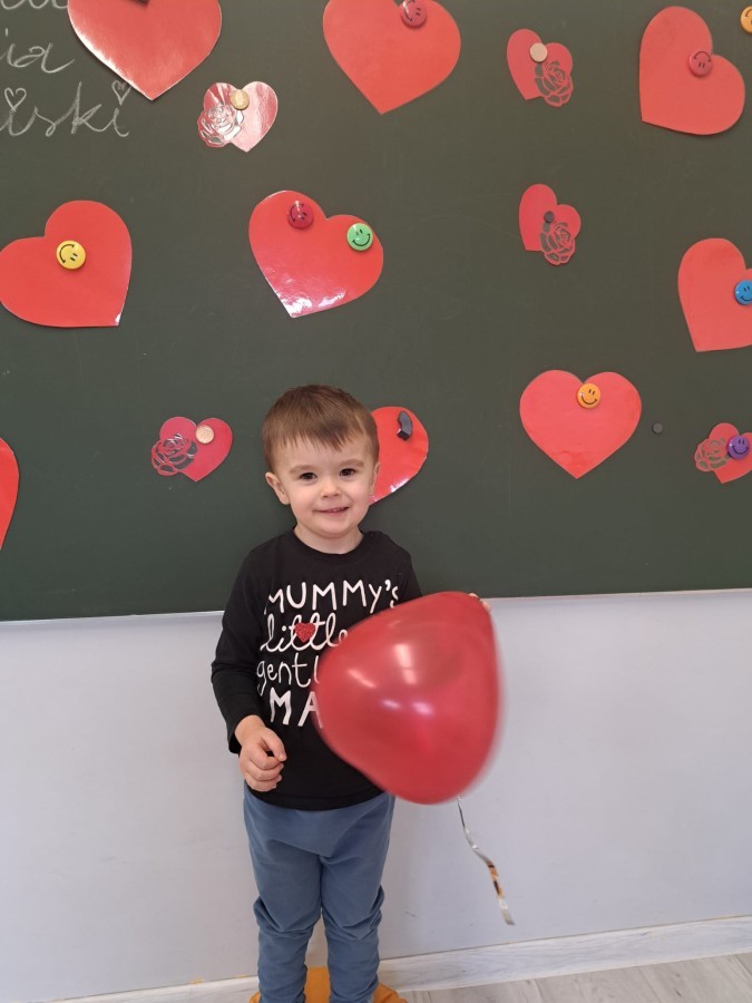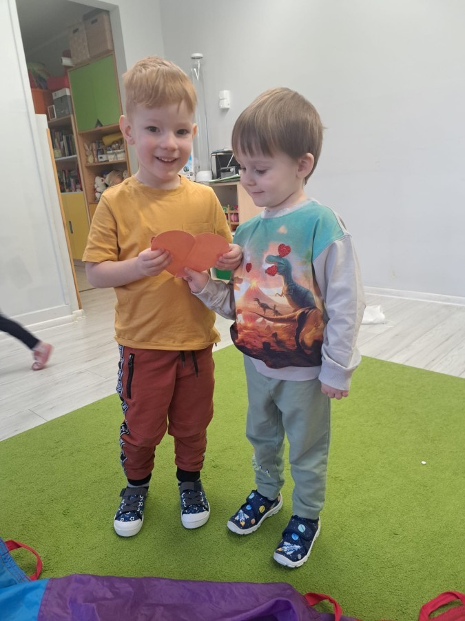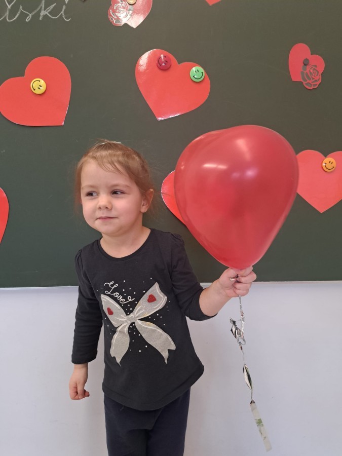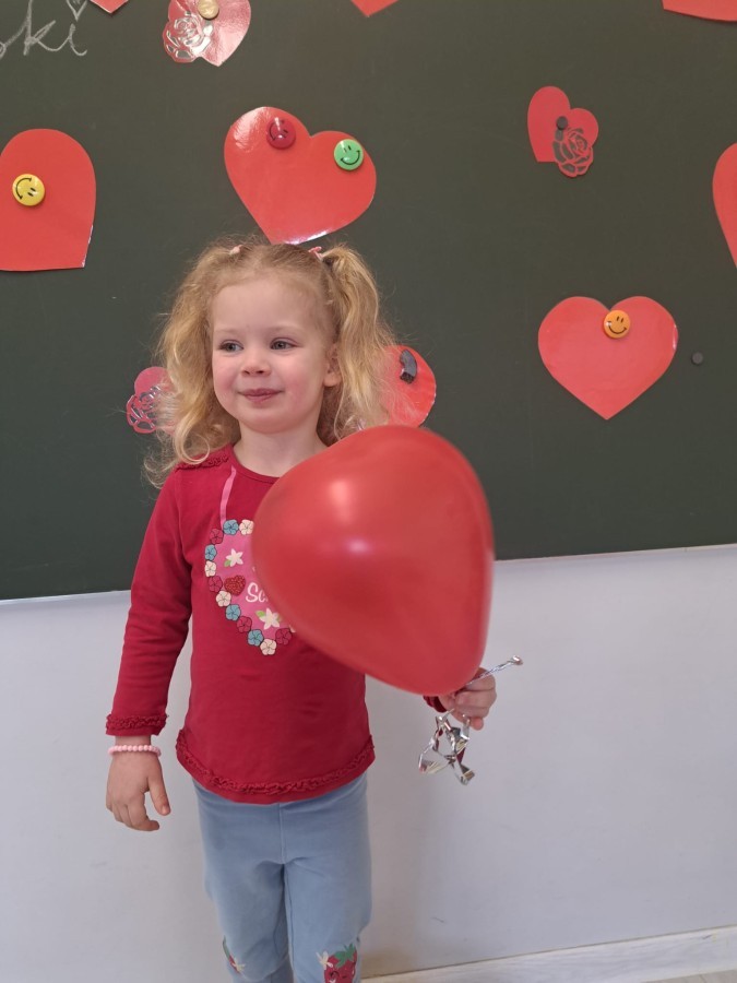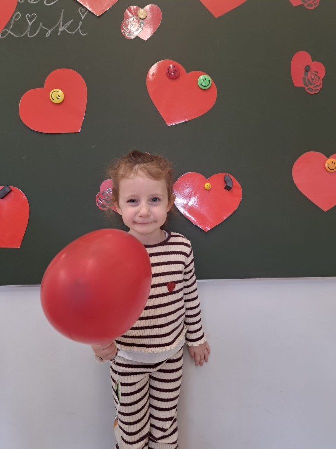 Podczas walentynkowych zajęć dzieci z grupy „Liski” uczestniczyły w zabawach rozwijających współpracę, przedszkolaki łączyły połówki serc, ćwicząc spostrzegawczość i współdziałanie w parach. Następnie układały drogę z papierowych serc, rozwijając orientację przestrzenną. Na zakończenie spotkania odbyła się zabawa z balonami, która dostarczyła dzieciom dużo śmiechu.