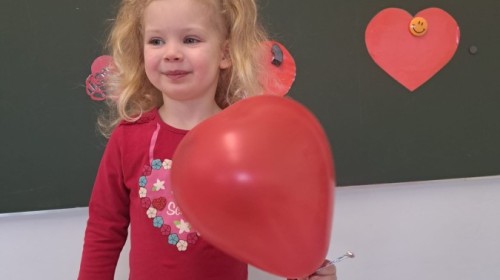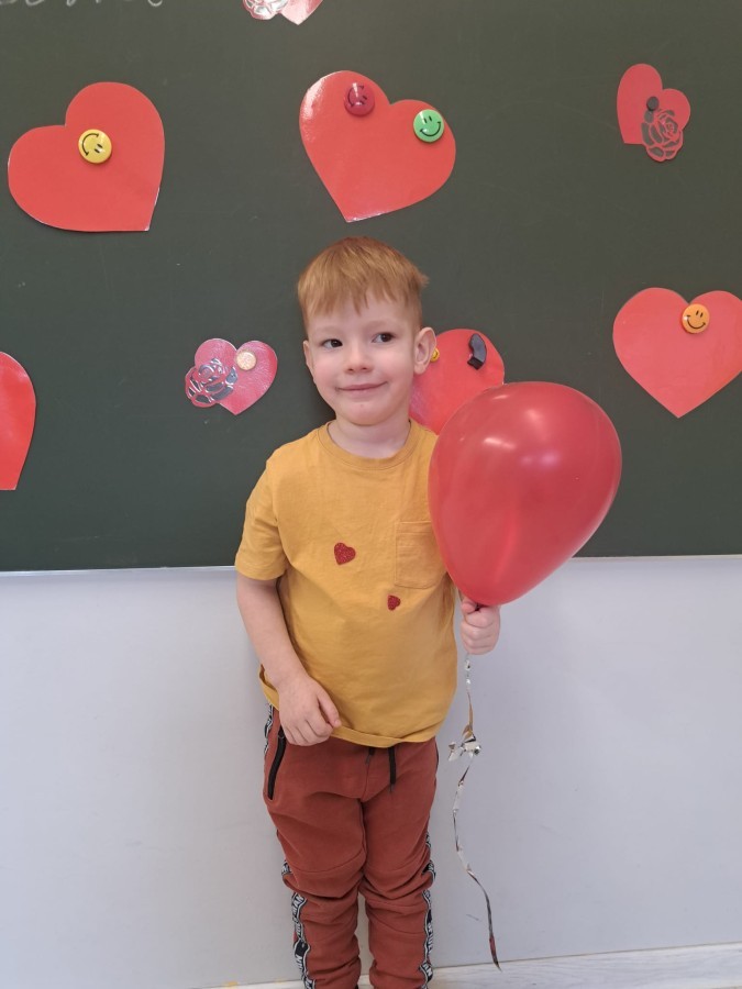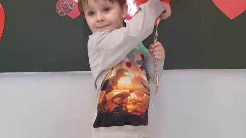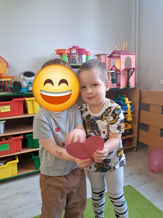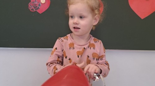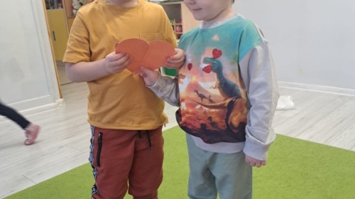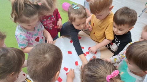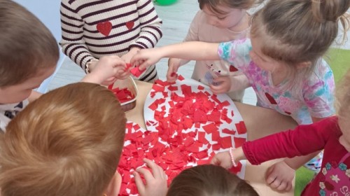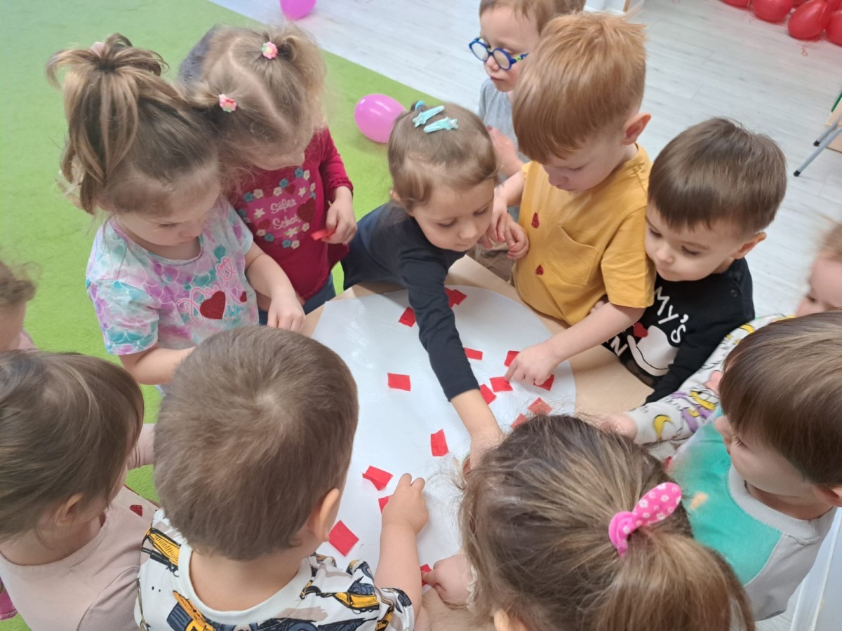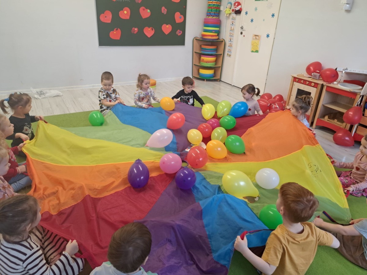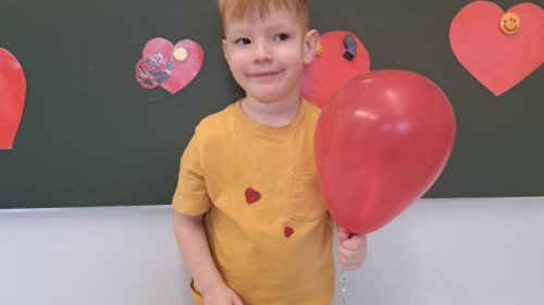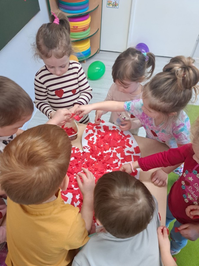 Podczas walentynkowych zajęć dzieci z grupy „Liski” uczestniczyły w zabawach rozwijających współpracę, przedszkolaki łączyły połówki serc, ćwicząc spostrzegawczość i współdziałanie w parach. Następnie układały drogę z papierowych serc, rozwijając orientację przestrzenną. Na zakończenie spotkania odbyła się zabawa z balonami, która dostarczyła dzieciom dużo śmiechu.