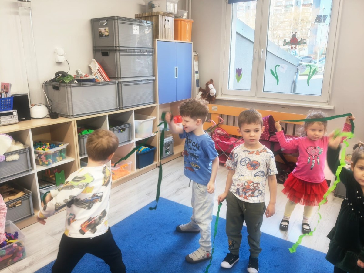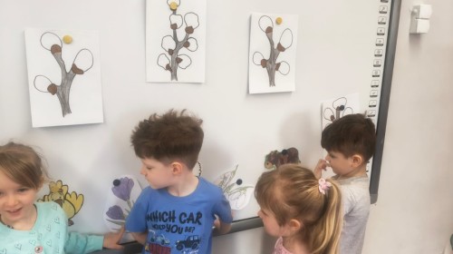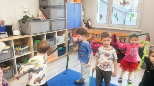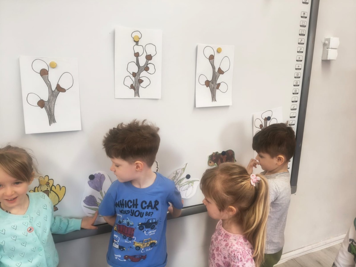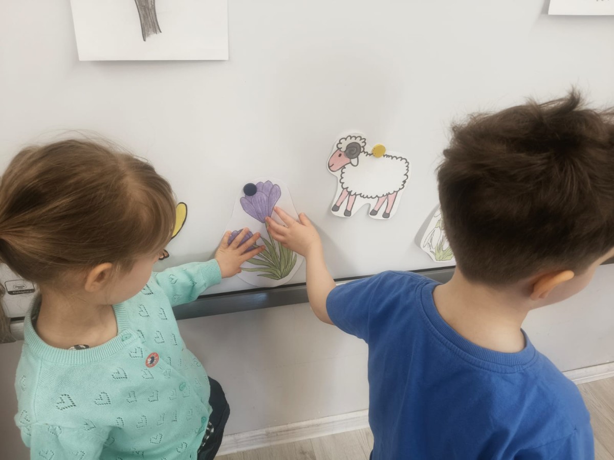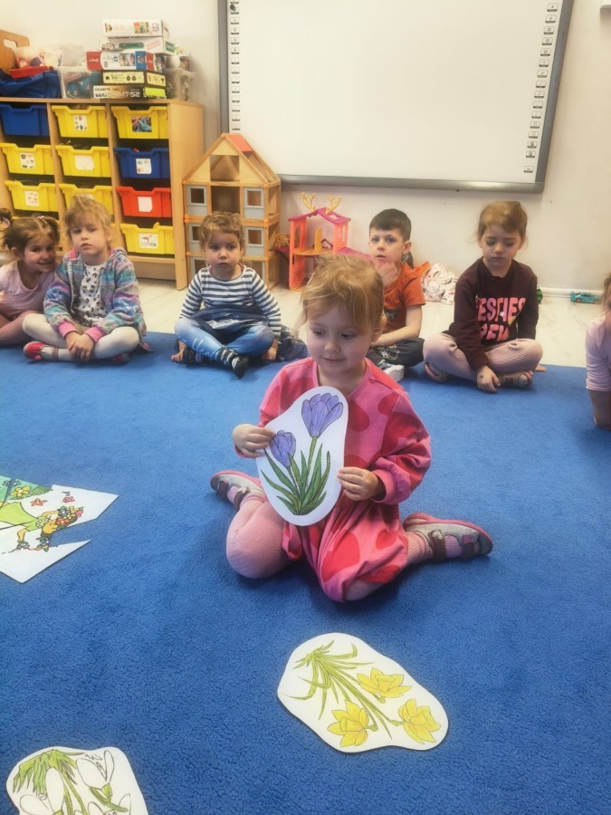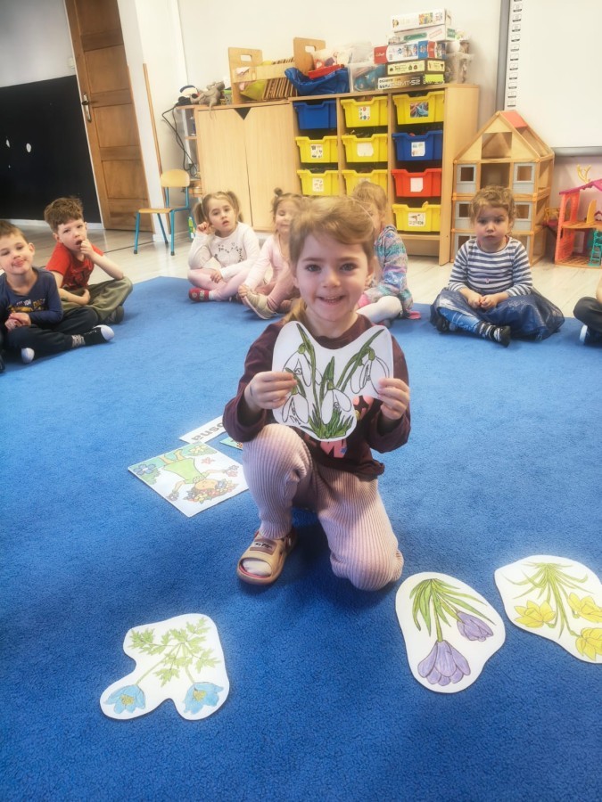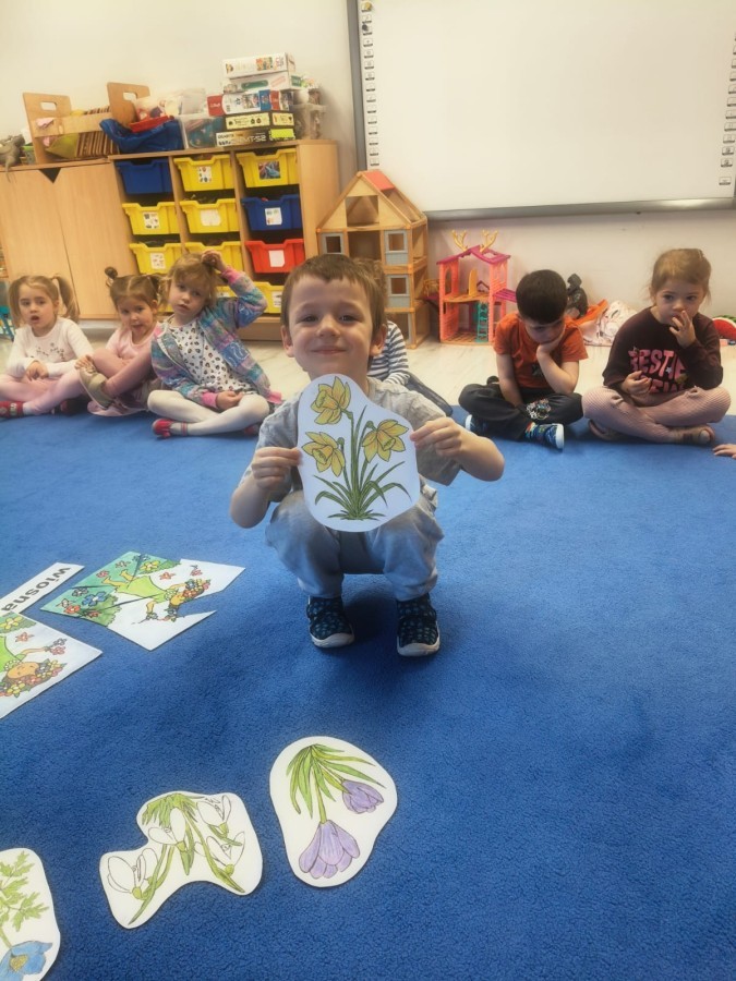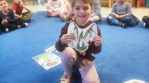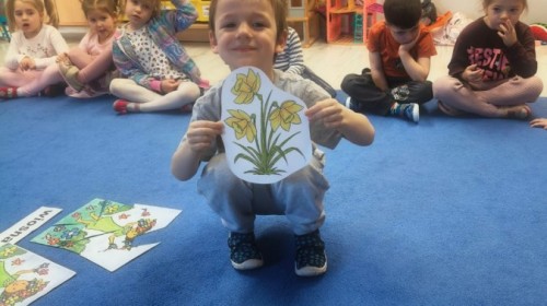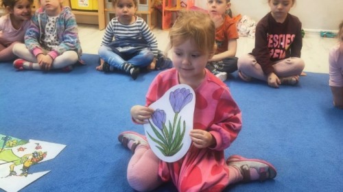 Na wiosnę czeka każdy, i duży, i mały. Dlatego podczas różnych zajęć pojawiały się w przedszkolu tematy wiosenne. Dzieci z radością poznawały pierwsze zwiastuny wiosny, poszukiwały jej w sali, na spacerach. Rozwiązywały zagadki, rebusy, liczyły kwiaty -