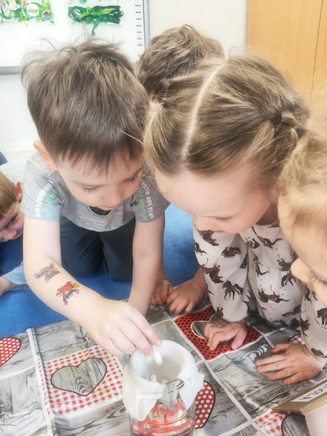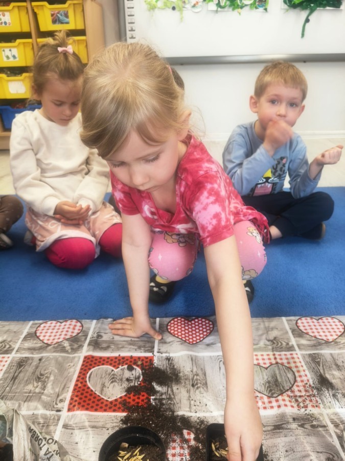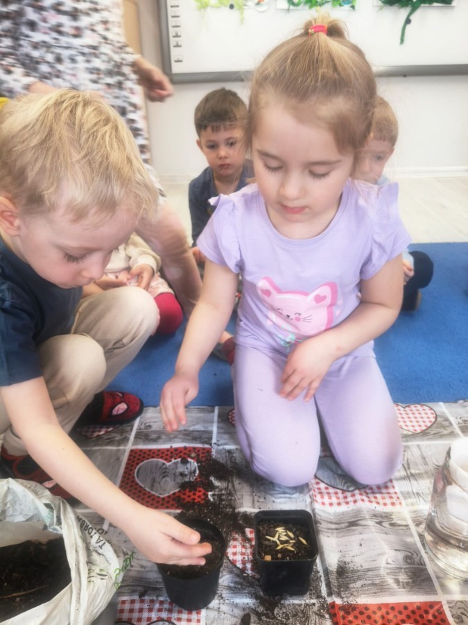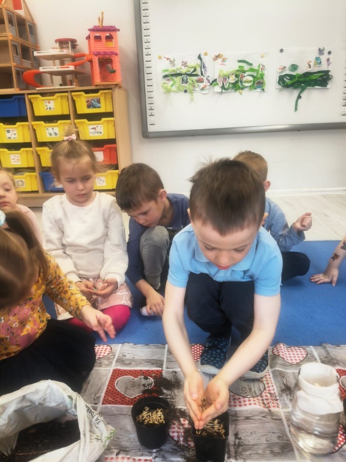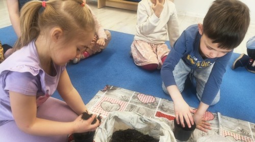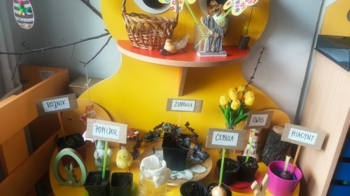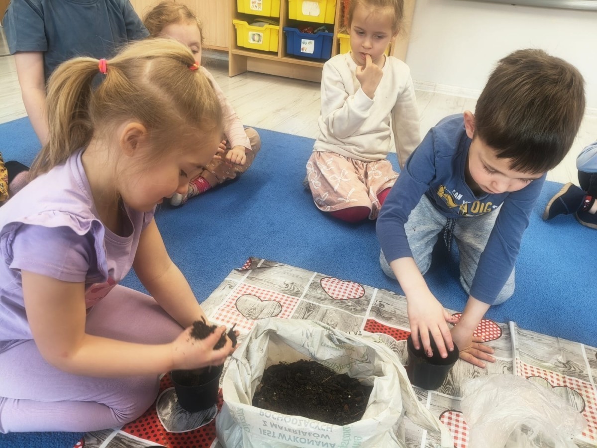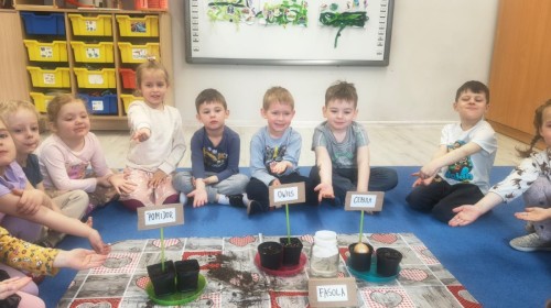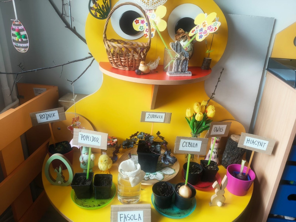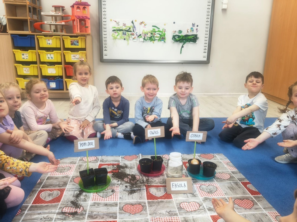 o wiośnie. Ponadto udało się nam już założyć mały ogródek w sali. Dzieci posiały fasolę, owies, pomidorki i inne. Teraz tylko trzeba