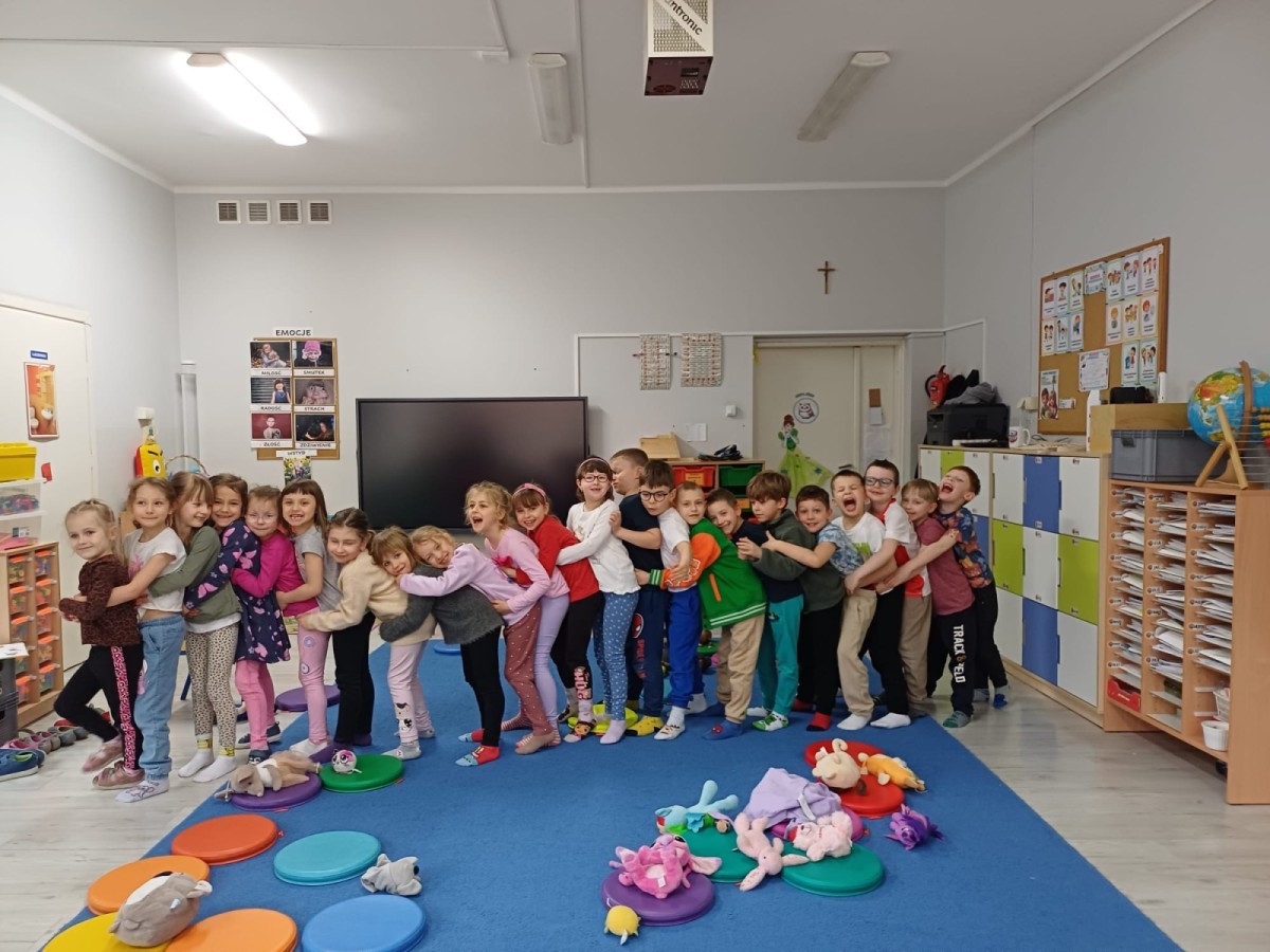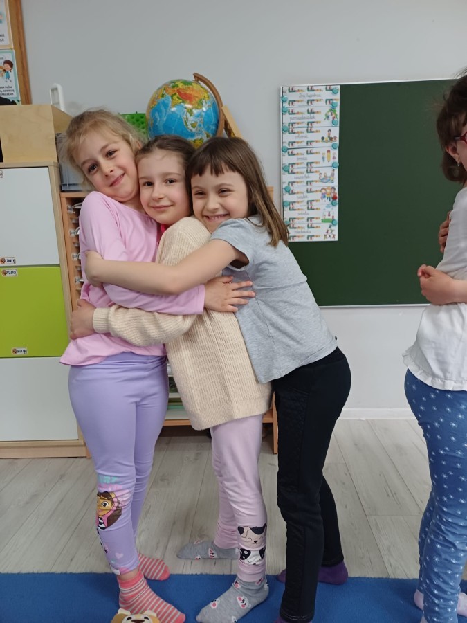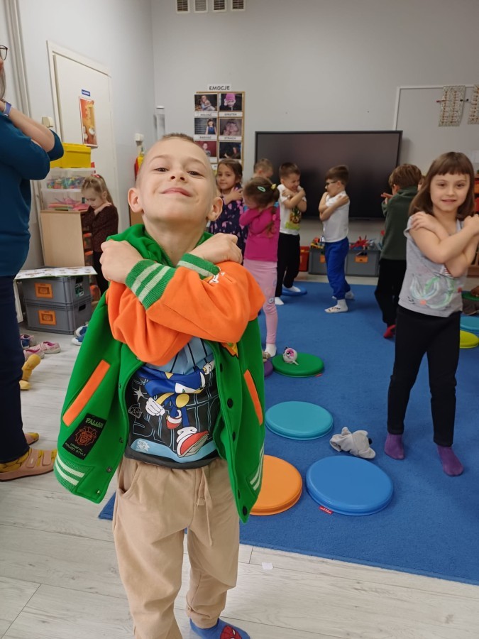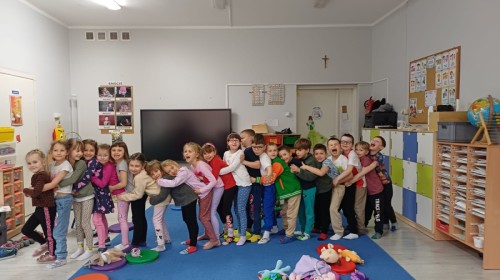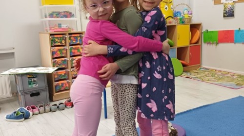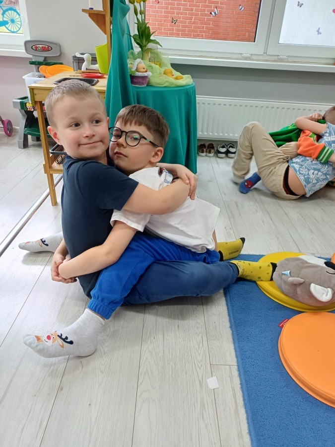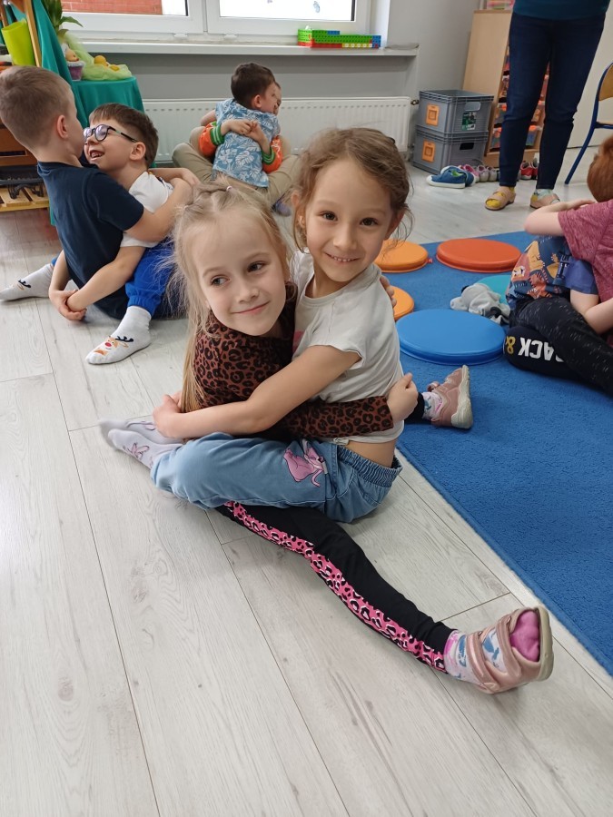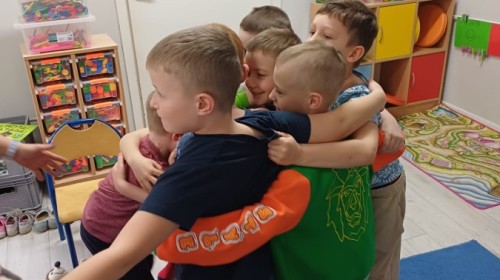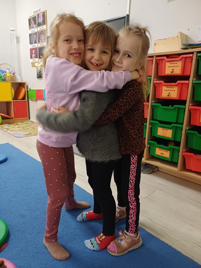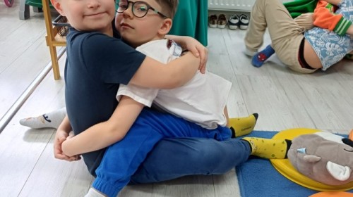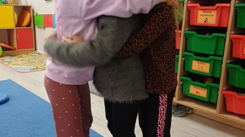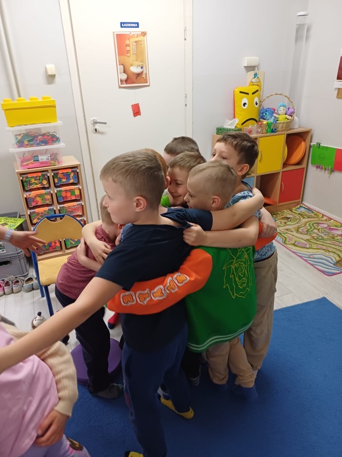 W piątek 27 marca w grupie Sówek odbyło się spotkanie z Panią Kasią- naszym przedszkolnym Pedagogiem Specjalnym. Zajęcia, jak zwykle dotyczyły ważnych w życiu człowieka tematów z obszaru emocji. Tym razem Sówki zgłębiały treści dotyczące przytulania. Wspólnie zastanawiały się na tym, jak bardzo potrzeby to gest- zarówno jego doświadczanie, jak i darowanie. Próbowały odpowiedzieć sobie na trudne pytania, związane z tym tematem, jak na przykład: "Czy zawsze można przytulić, nawet, gdy ktoś nie ma na to ochoty?" Pomocną w tym temacie okazała się książka "Kto przytuli Misia Tulisia?" Daviada Mellinga, której dzieci wysłuchały na początku zajęć. Na podstawie jej treści mogły zbudować swoje wypowiedzi, choć penie własne doświadczenie w tym temacie również stanowiło źródło ich jakże cennych przemyśleń. Po tej części, zajęcia nabrały dynamizmu dzięki zaproponowanym w publikacji ćwiczeniom - ku wielkiej radości dzieci mogły się przytulić "na kanapkę", tyłem, a nawet całą grupą- zachowując przy tym delikatność i uwzględniając potrzeby innych osób. Na koniec dzieci wzięły udział w grupowej grze "Memory", odkrywając karty z pięknymi ilustracjami przedstawiającymi różne emocje, Dzięki temu ćwiczeniu poszerzyły swoją widzę na temat ich nazywania, oraz rozpoznawania w mimice twarzy drugiego człowieka.