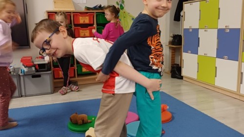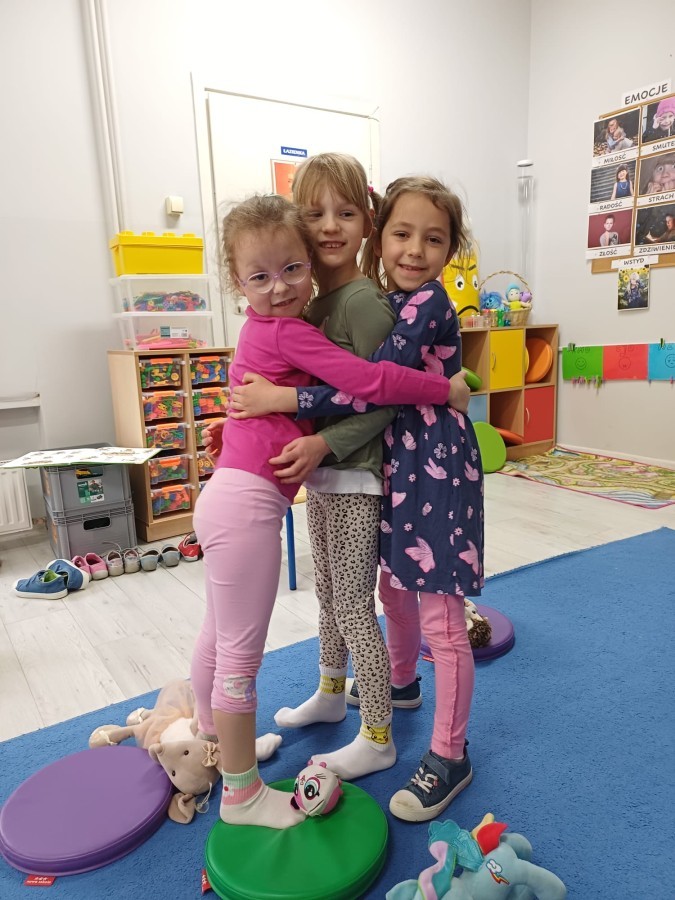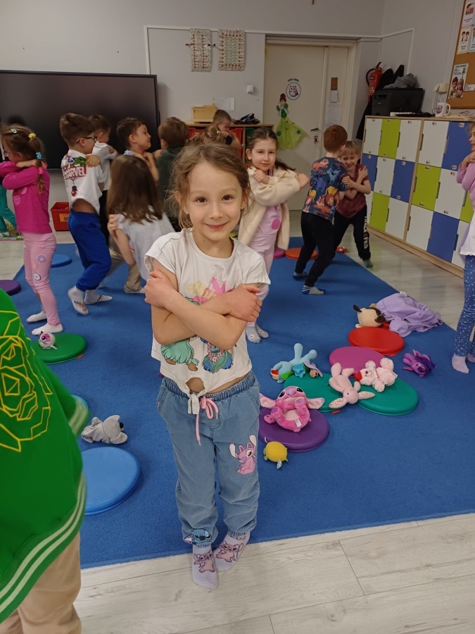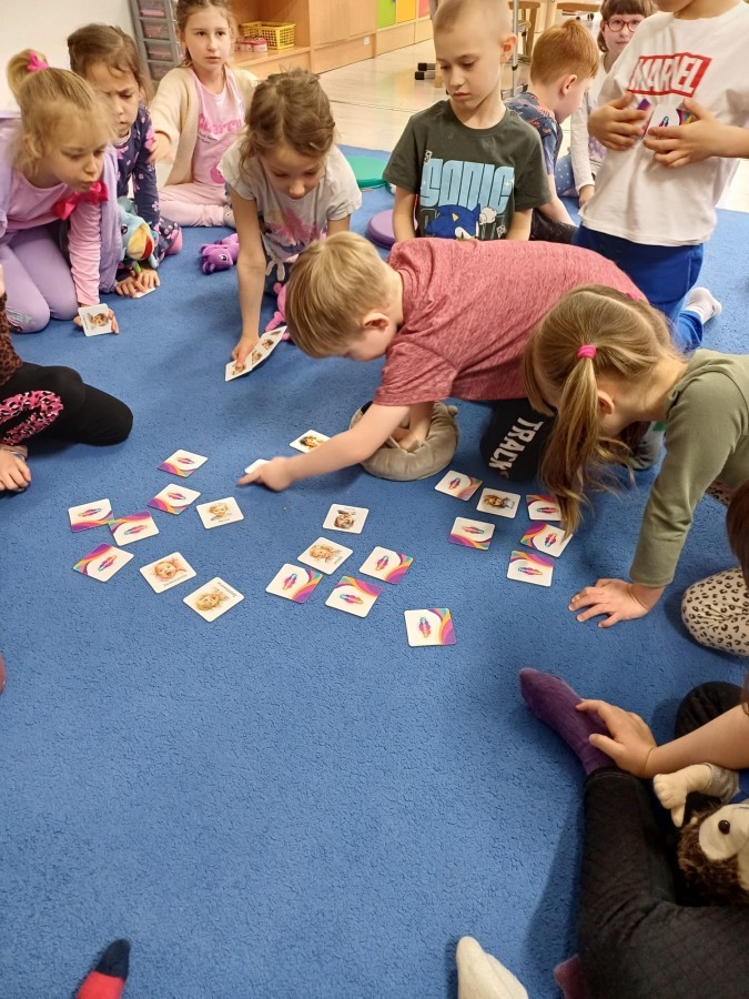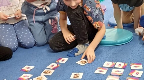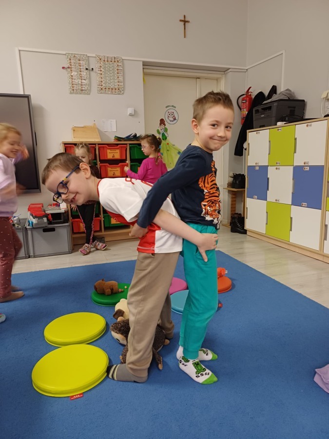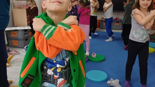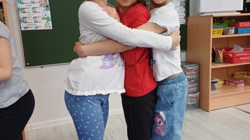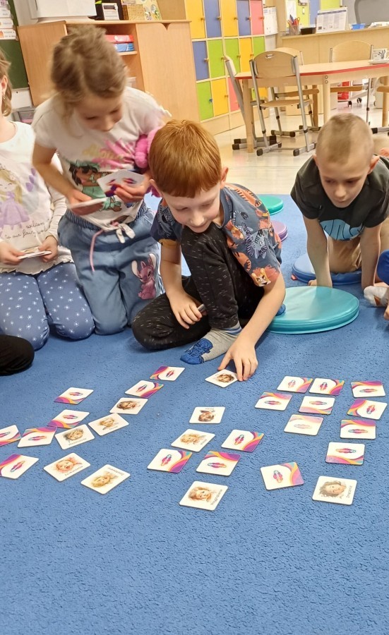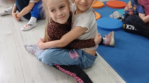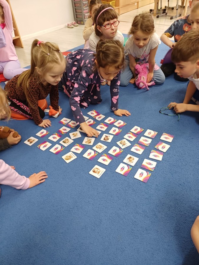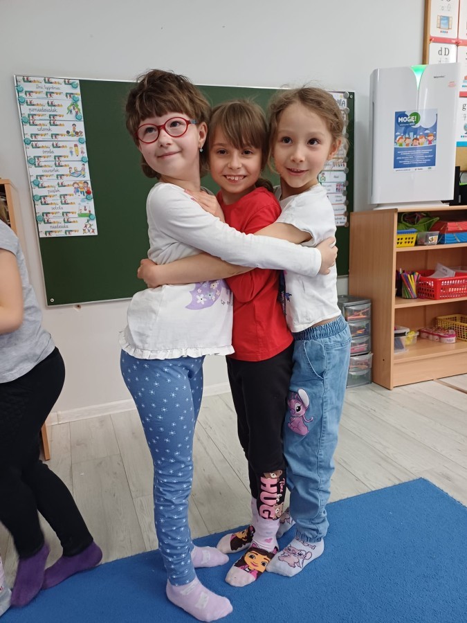 W piątek 27 marca w grupie Sówek odbyło się spotkanie z Panią Kasią- naszym przedszkolnym Pedagogiem Specjalnym. Zajęcia, jak zwykle dotyczyły ważnych w życiu człowieka tematów z obszaru emocji. Tym razem Sówki zgłębiały treści dotyczące przytulania. Wspólnie zastanawiały się na tym, jak bardzo potrzeby to gest- zarówno jego doświadczanie, jak i darowanie. Próbowały odpowiedzieć sobie na trudne pytania, związane z tym tematem, jak na przykład: "Czy zawsze można przytulić, nawet, gdy ktoś nie ma na to ochoty?" Pomocną w tym temacie okazała się książka "Kto przytuli Misia Tulisia?" Daviada Mellinga, której dzieci wysłuchały na początku zajęć. Na podstawie jej treści mogły zbudować swoje wypowiedzi, choć penie własne doświadczenie w tym temacie również stanowiło źródło ich jakże cennych przemyśleń. Po tej części, zajęcia nabrały dynamizmu dzięki zaproponowanym w publikacji ćwiczeniom - ku wielkiej radości dzieci mogły się przytulić "na kanapkę", tyłem, a nawet całą grupą- zachowując przy tym delikatność i uwzględniając potrzeby innych osób. Na koniec dzieci wzięły udział w grupowej grze "Memory", odkrywając karty z pięknymi ilustracjami przedstawiającymi różne emocje, Dzięki temu ćwiczeniu poszerzyły swoją widzę na temat ich nazywania, oraz rozpoznawania w mimice twarzy drugiego człowieka.
