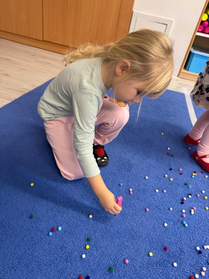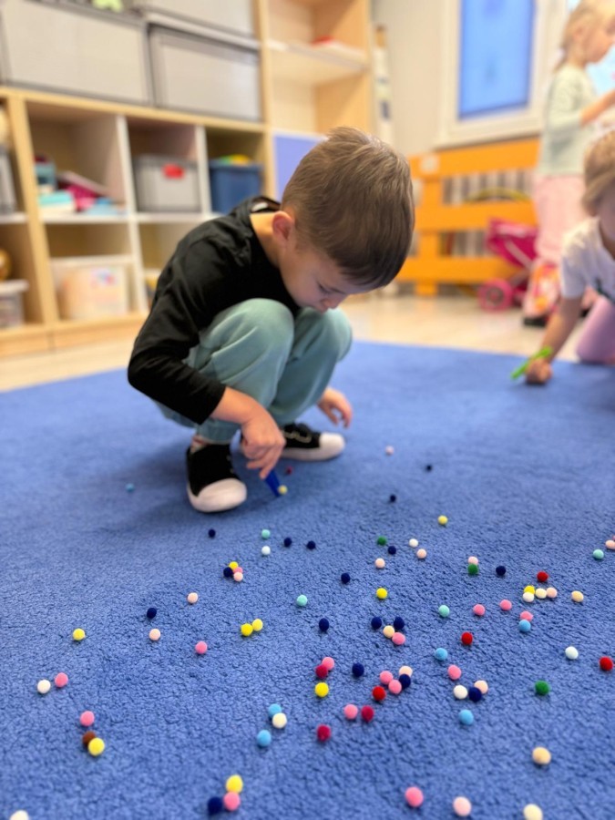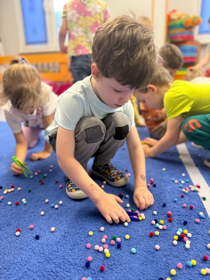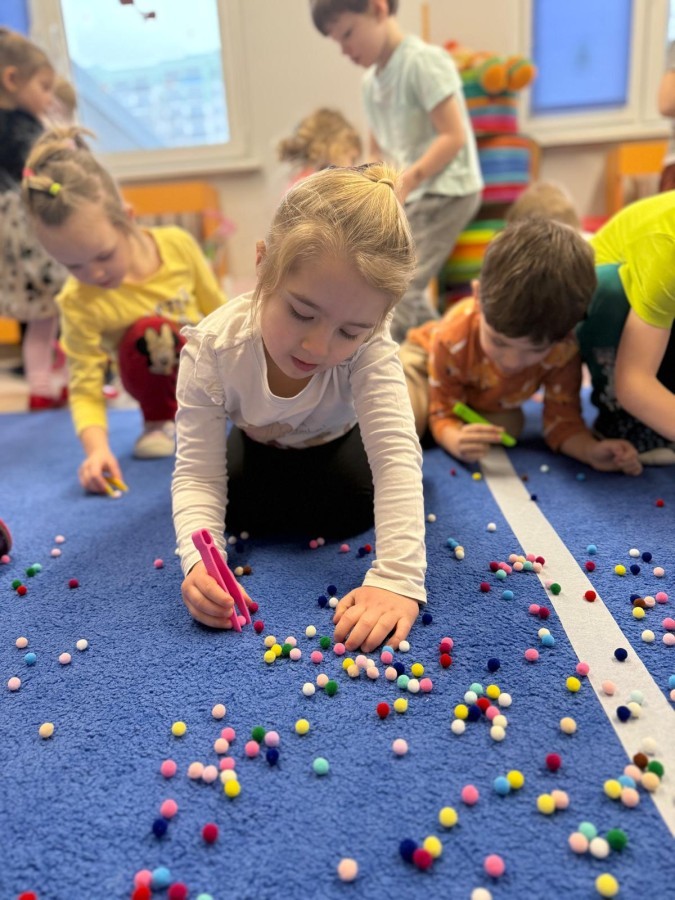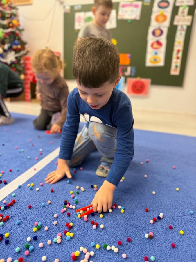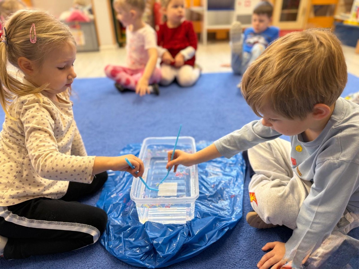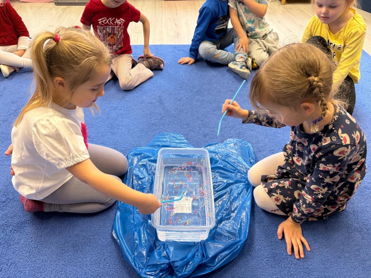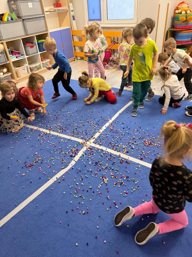 Podczas zimowych zabaw w przedszkolu dzieci aktywnie i radośnie spędzały czas, rozwijając swoje umiejętności poprzez różnorodne aktywności . W ramach ćwiczeń motoryki małej przedszkolaki zbierały pompony rozsypane po sali przy użyciu pęsety, ćwicząc precyzję ruchów i chwyt. Koordynację wzrokowo-ruchową usprawniały poprzez łączenie w pary rękawiczek, a sprawność manualną doskonaliły, łowiąc gumki z wody za pomocą słomki – zadanie wymagało skupienia i cierpliwości. Dzieci brały również udział