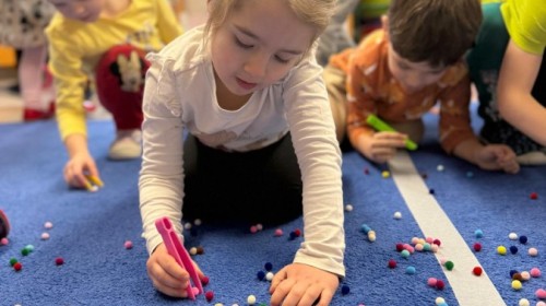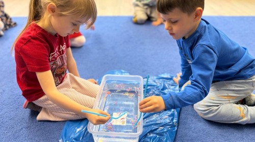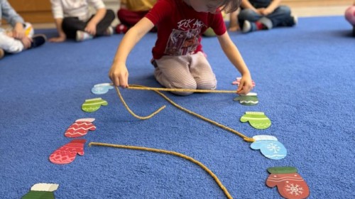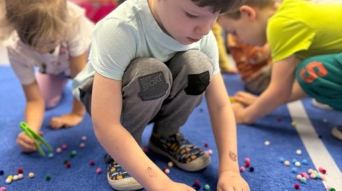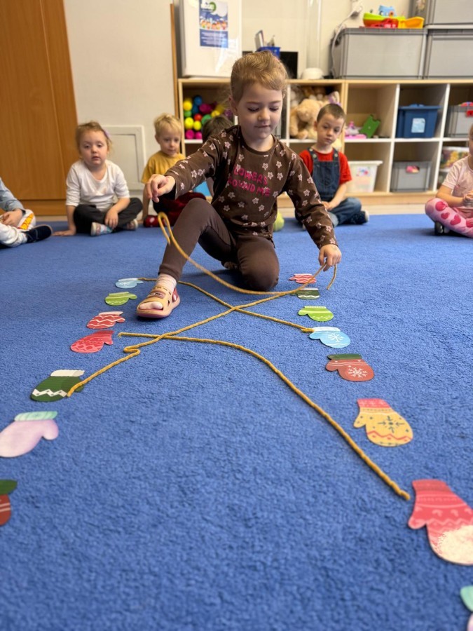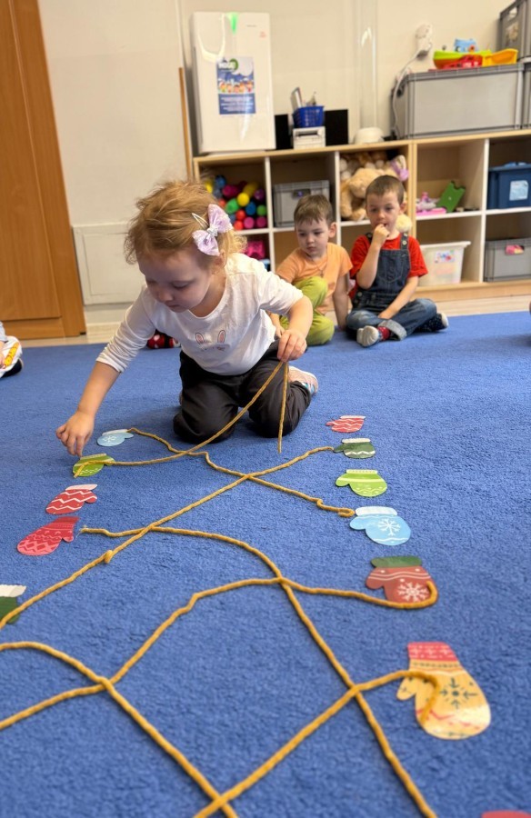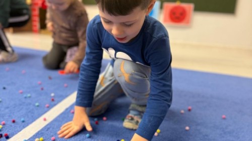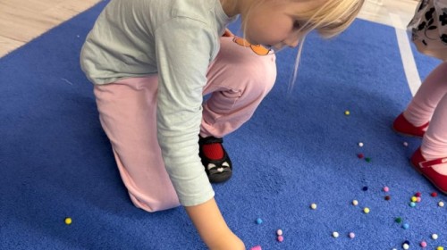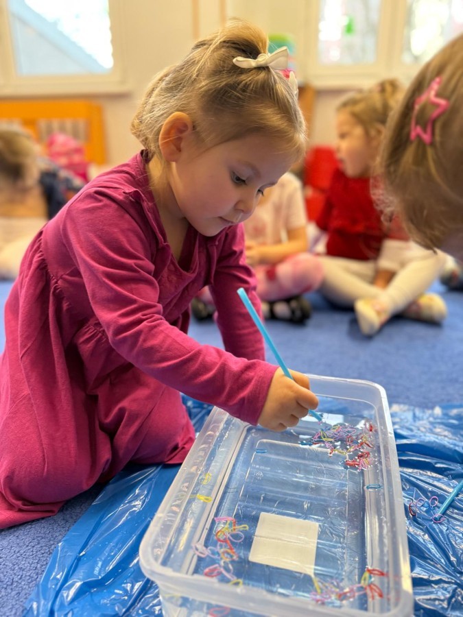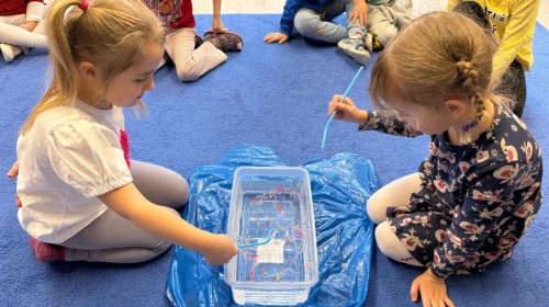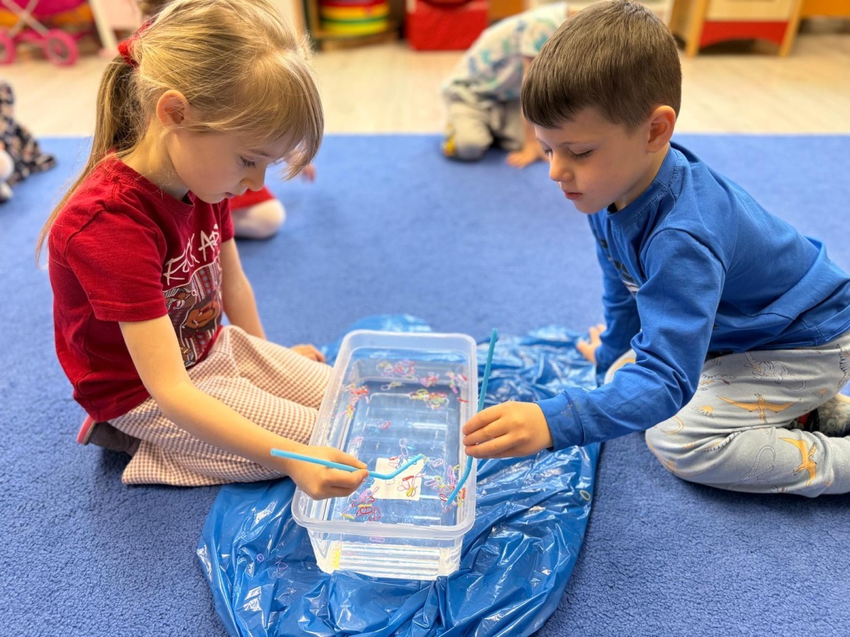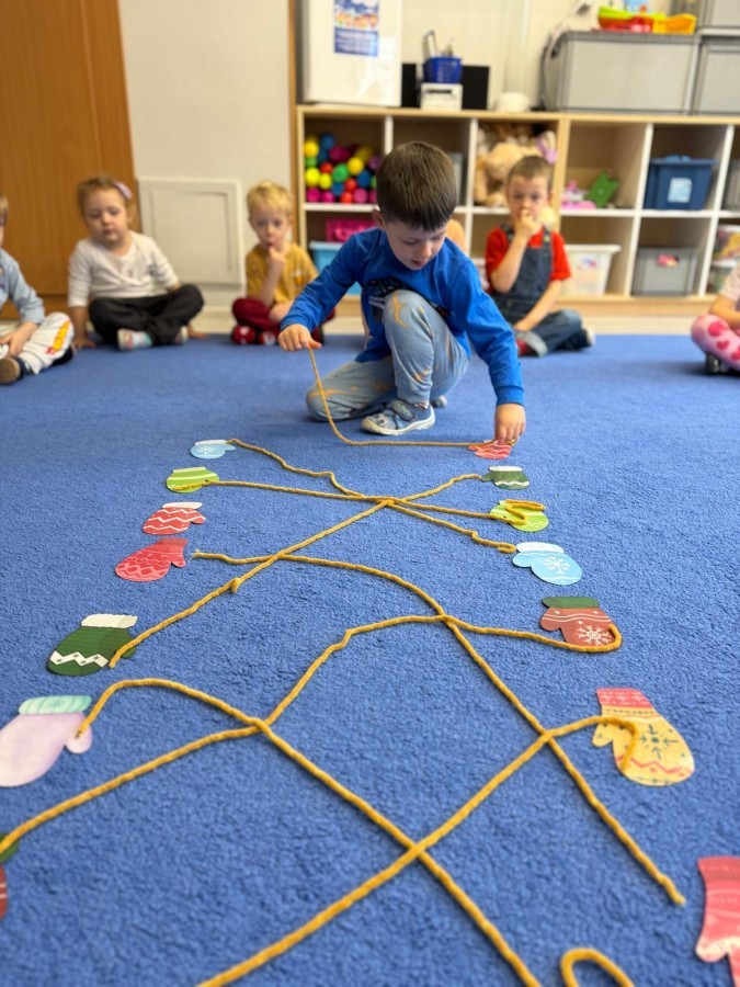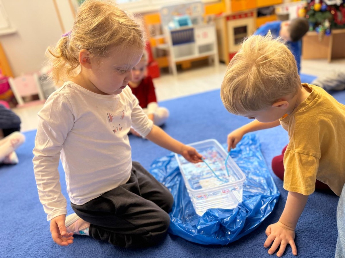Podczas zimowych zabaw w przedszkolu dzieci aktywnie i radośnie spędzały czas, rozwijając swoje umiejętności poprzez różnorodne aktywności . W ramach ćwiczeń motoryki małej przedszkolaki zbierały pompony rozsypane po sali przy użyciu pęsety, ćwicząc precyzję ruchów i chwyt. Koordynację wzrokowo-ruchową usprawniały poprzez łączenie w pary rękawiczek, a sprawność manualną doskonaliły, łowiąc gumki z wody za pomocą słomki – zadanie wymagało skupienia i cierpliwości. Dzieci brały również udział