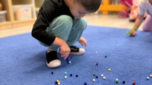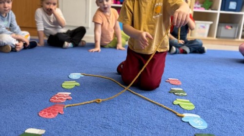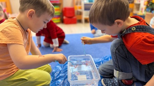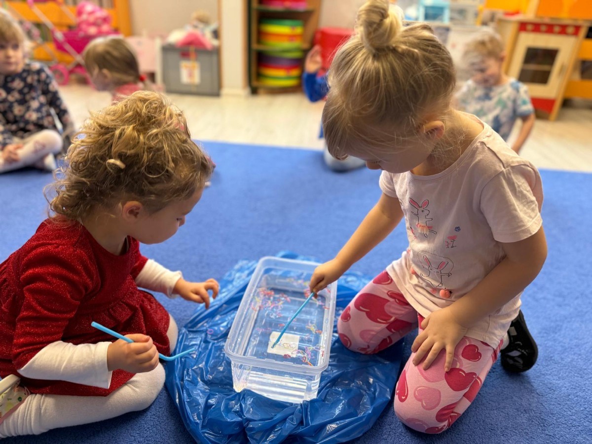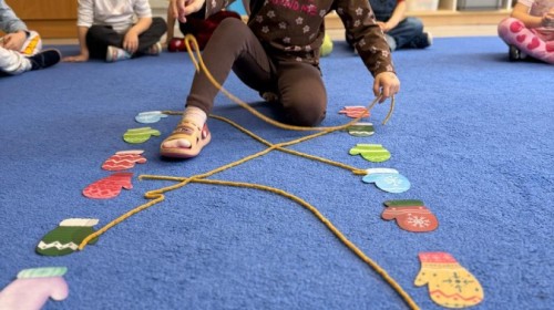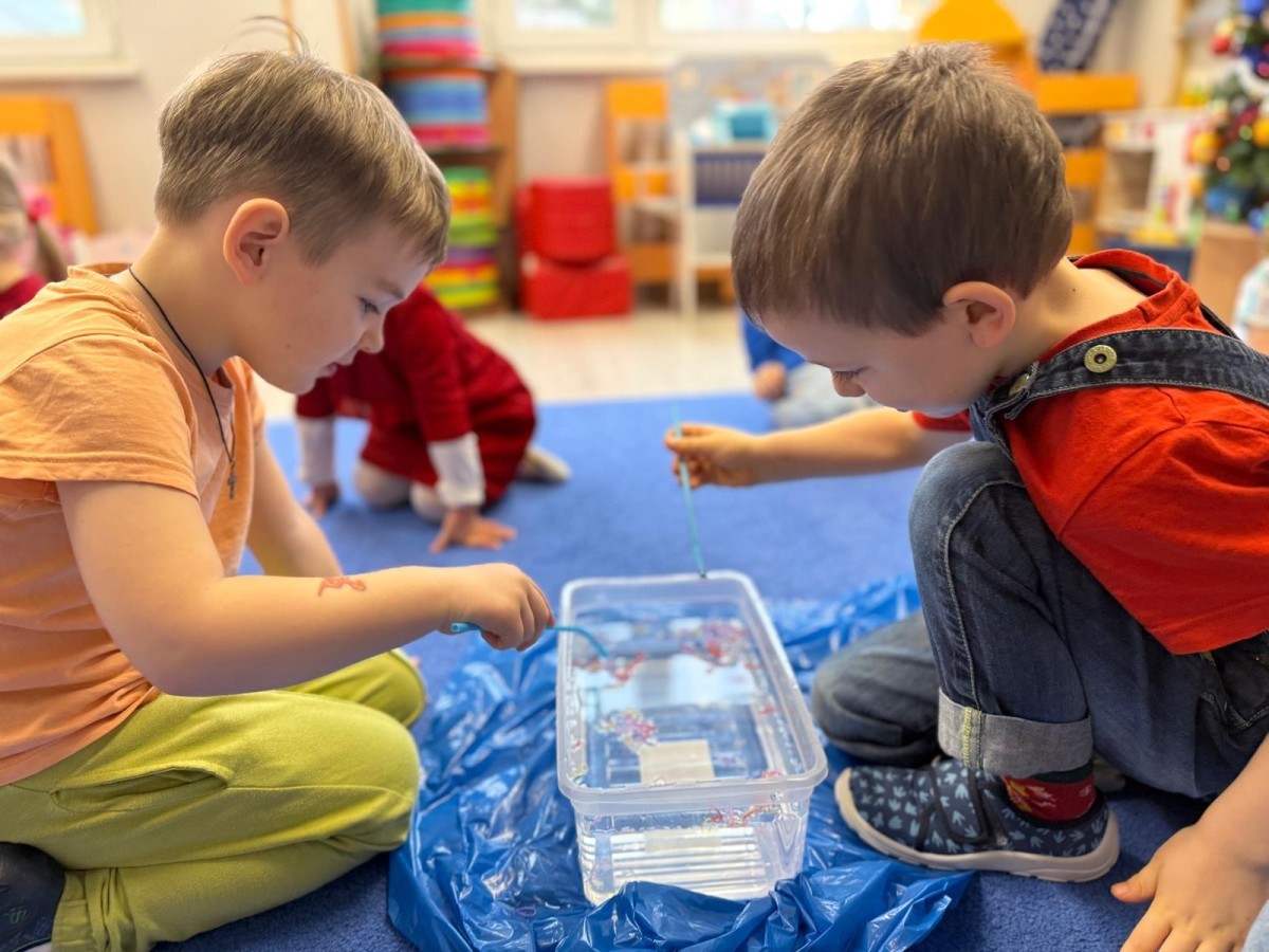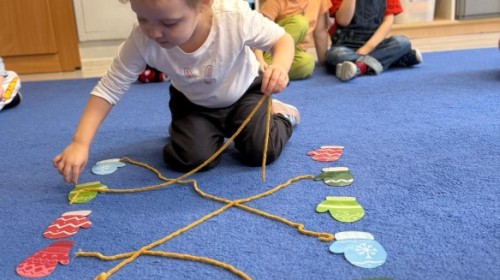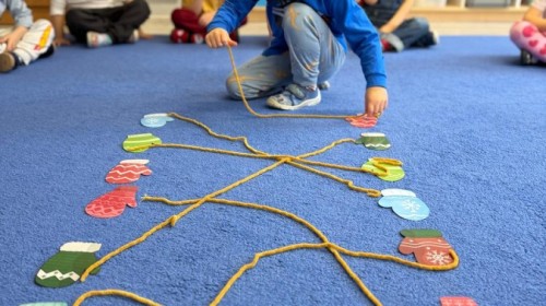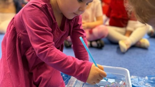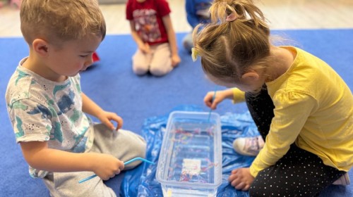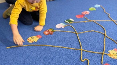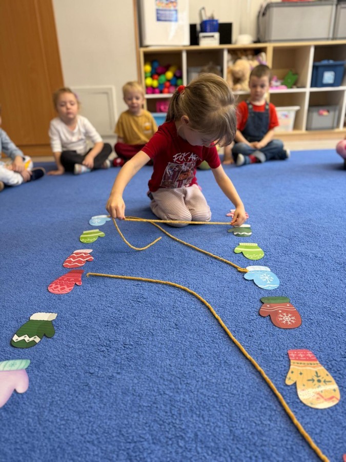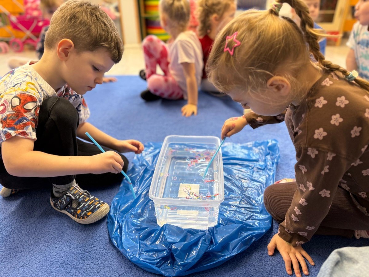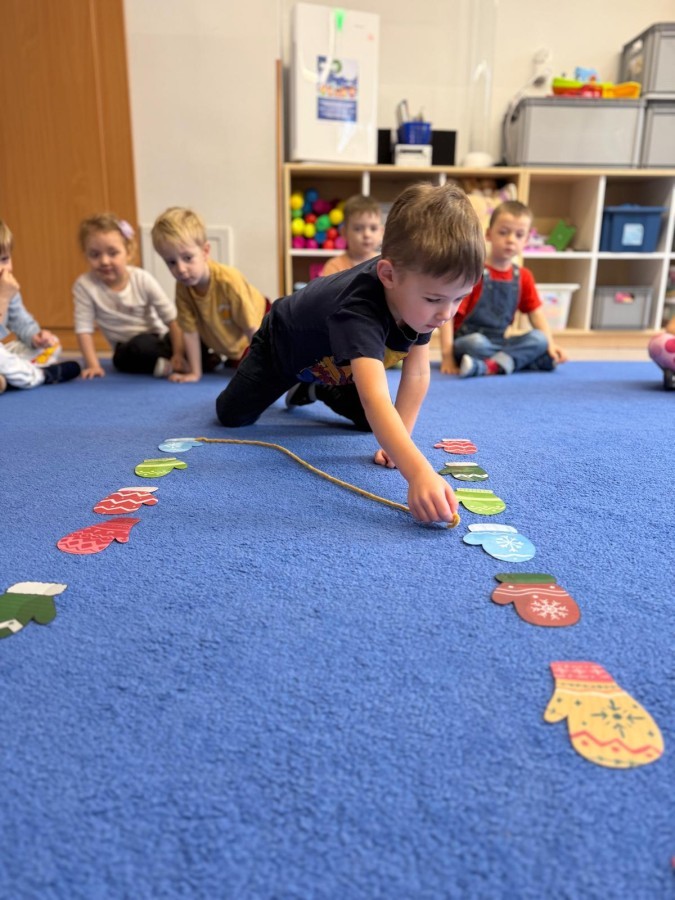 Podczas zimowych zabaw w przedszkolu dzieci aktywnie i radośnie spędzały czas, rozwijając swoje umiejętności poprzez różnorodne aktywności . W ramach ćwiczeń motoryki małej przedszkolaki zbierały pompony rozsypane po sali przy użyciu pęsety, ćwicząc precyzję ruchów i chwyt. Koordynację wzrokowo-ruchową usprawniały poprzez łączenie w pary rękawiczek, a sprawność manualną doskonaliły, łowiąc gumki z wody za pomocą słomki – zadanie wymagało skupienia i cierpliwości. Dzieci brały również udział
