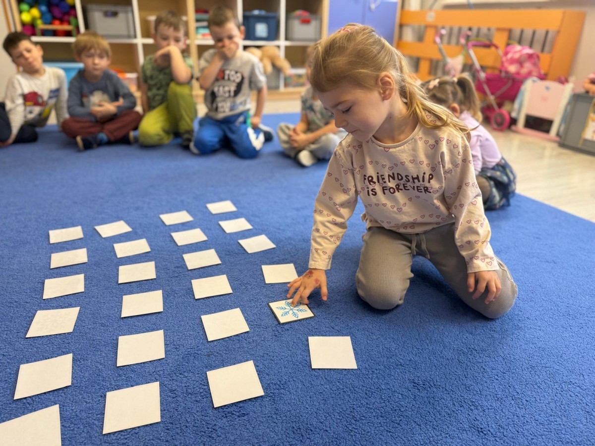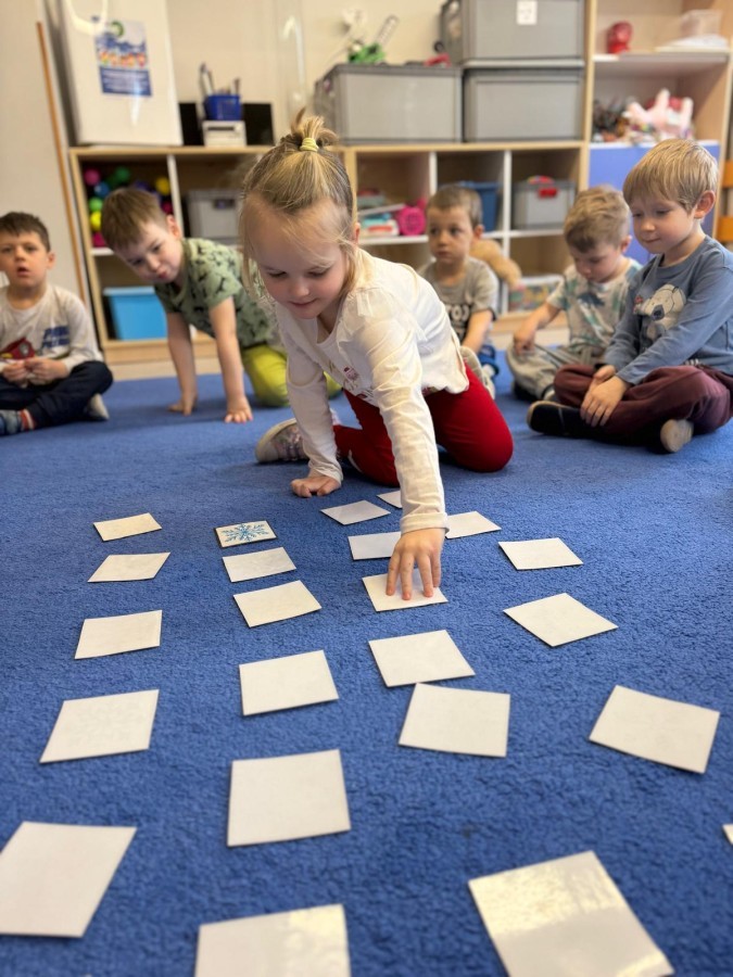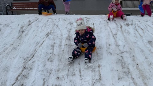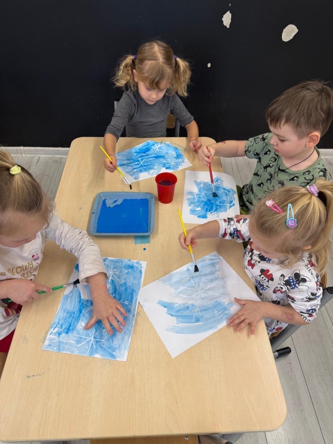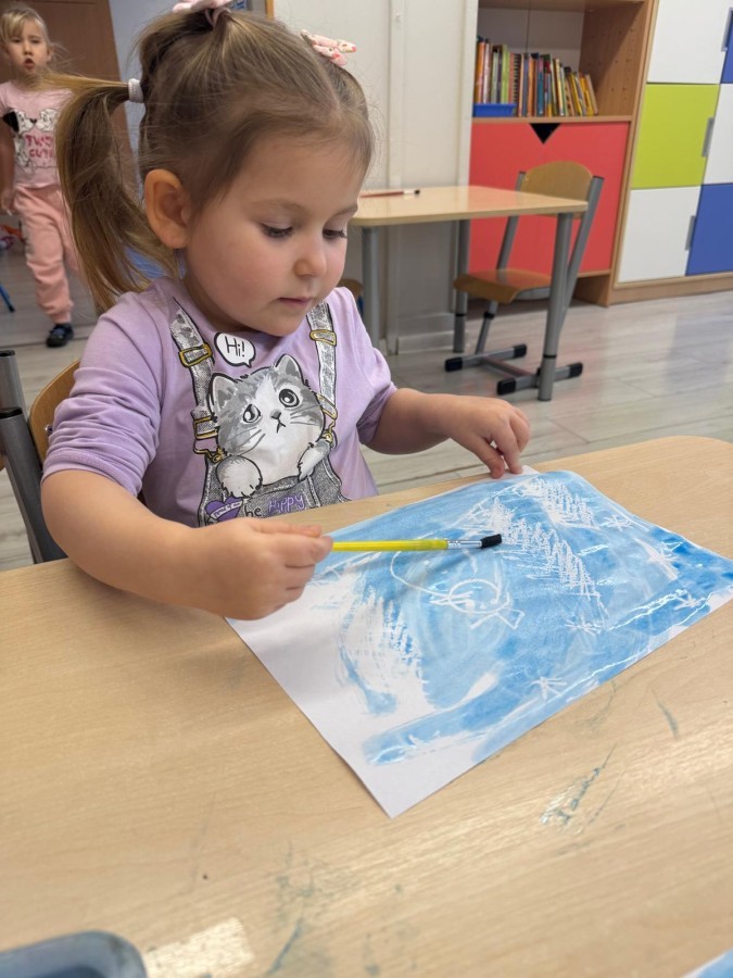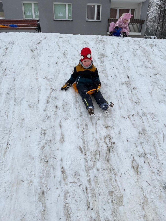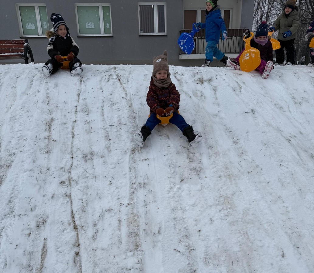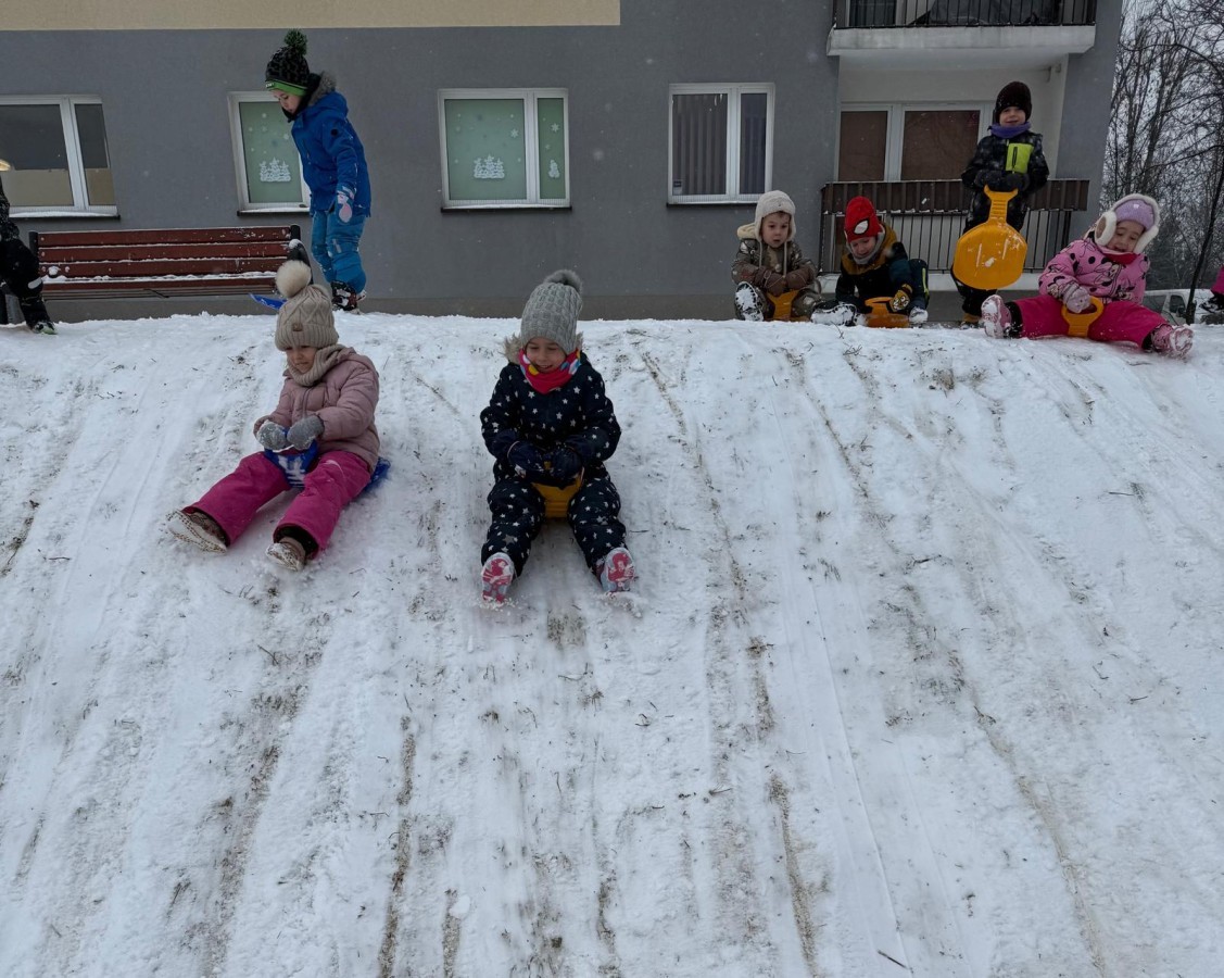 w ćwiczeniach percepcji wzrokowej i koncentracji uwagi, grając w memory oraz odszukując takie same śnieżynki. Nie zabrakło także działań twórczych – podczas pracy plastycznej mali artyści malowali farbami, odkrywając piękno zimowych krajobrazów. Zwieńczeniem były zabawy na śniegu: radosne zjeżdżanie na ślizgach oraz pierwsze próby lepienia bałwana, które sprawiły dzieciom mnóstwo frajdy i uśmiechu. To był czas pełen ruchu, kreatywności i zimowej radości!