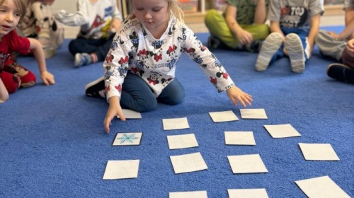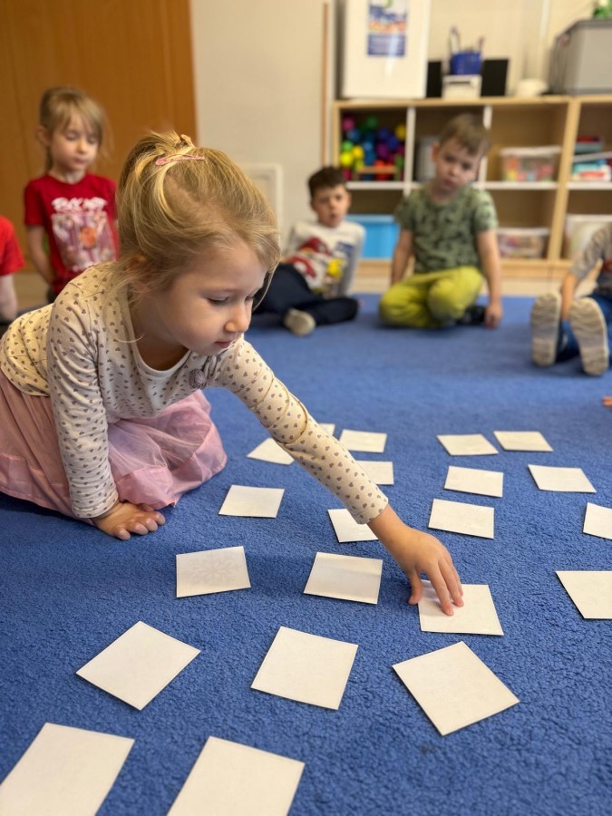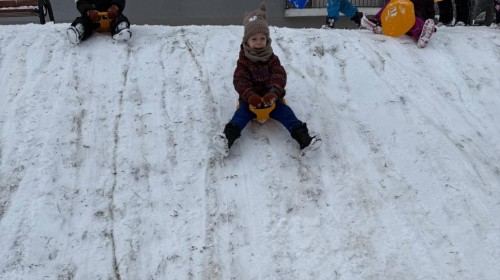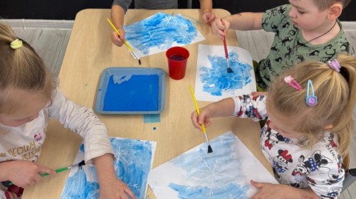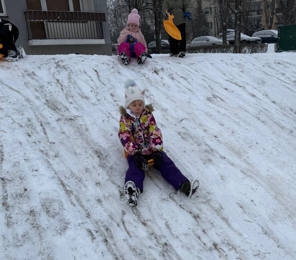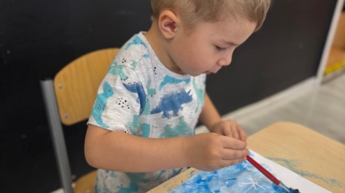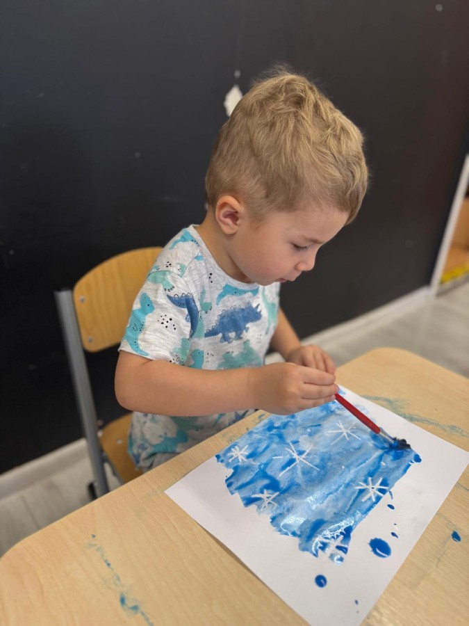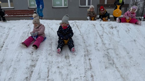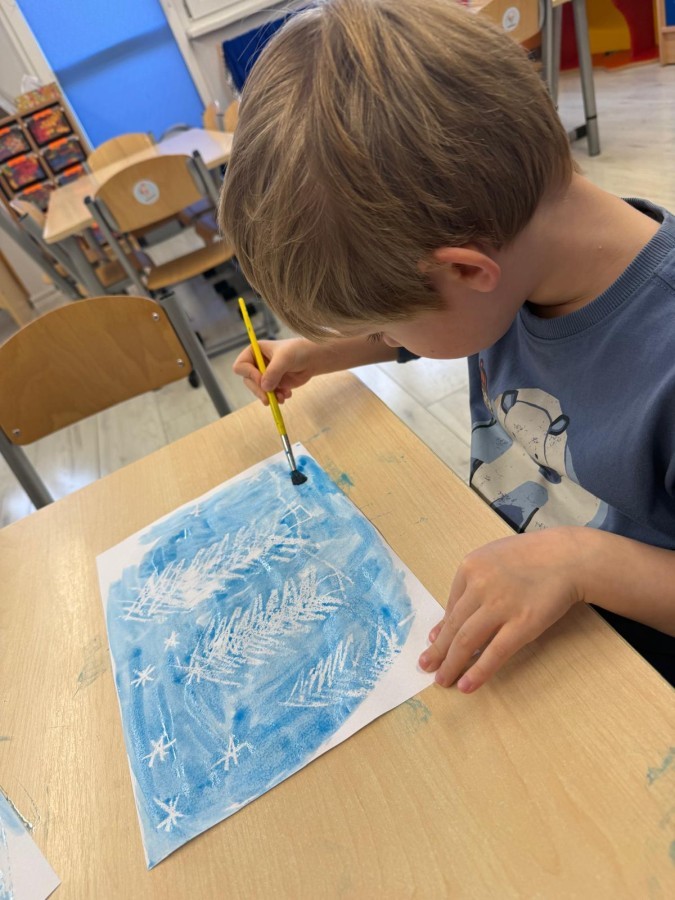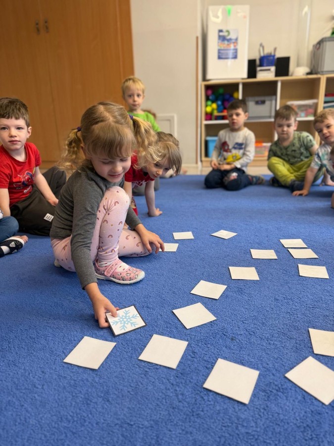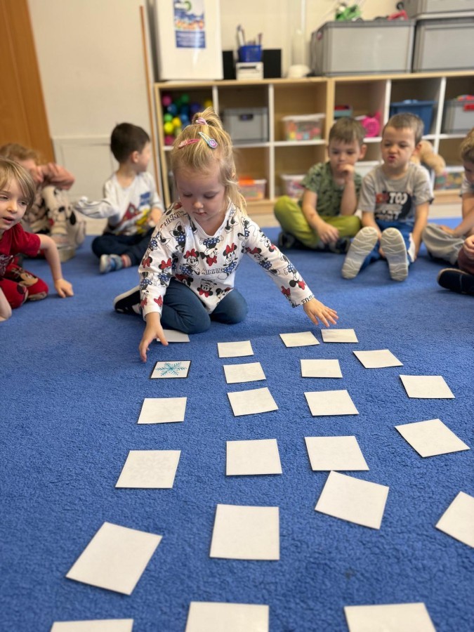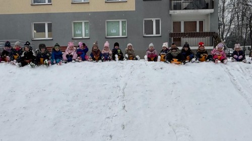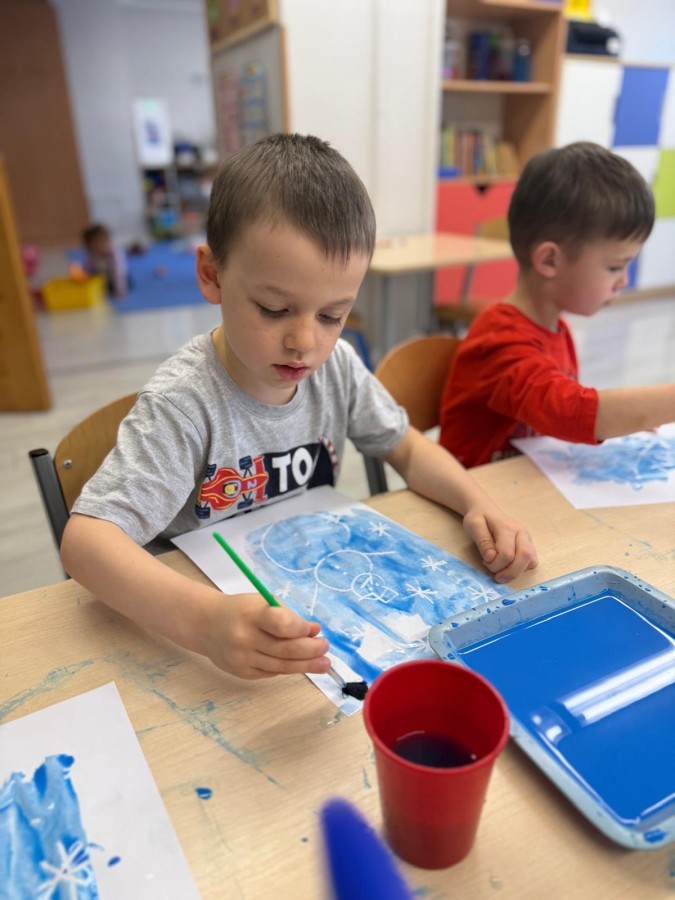 w ćwiczeniach percepcji wzrokowej i koncentracji uwagi, grając w memory oraz odszukując takie same śnieżynki. Nie zabrakło także działań twórczych – podczas pracy plastycznej mali artyści malowali farbami, odkrywając piękno zimowych krajobrazów. Zwieńczeniem były zabawy na śniegu: radosne zjeżdżanie na ślizgach oraz pierwsze próby lepienia bałwana, które sprawiły dzieciom mnóstwo frajdy i uśmiechu. To był czas pełen ruchu, kreatywności i zimowej radości!