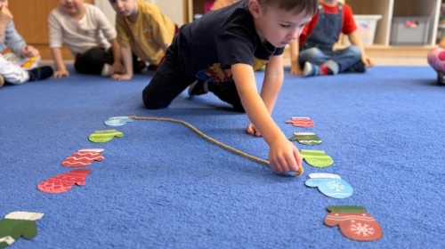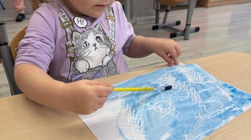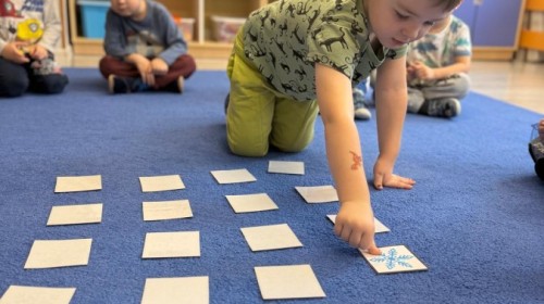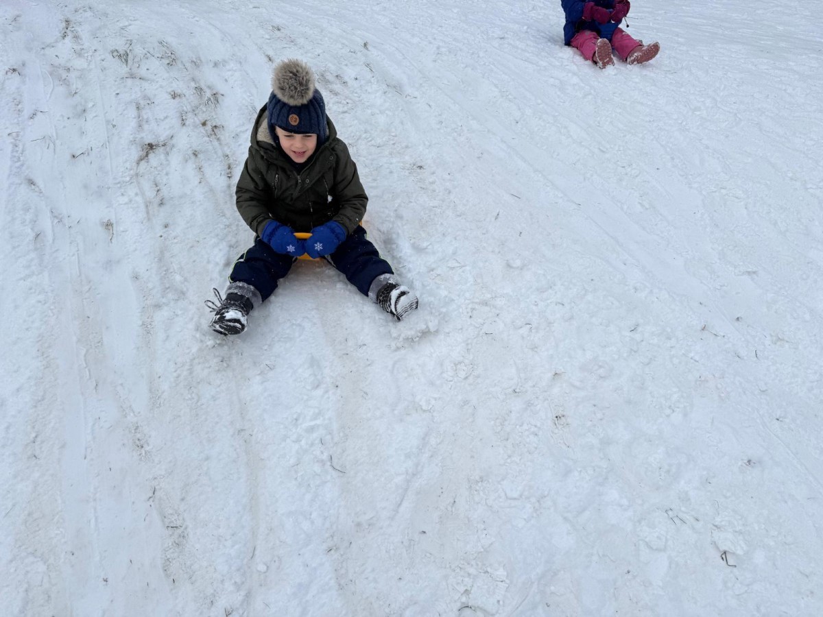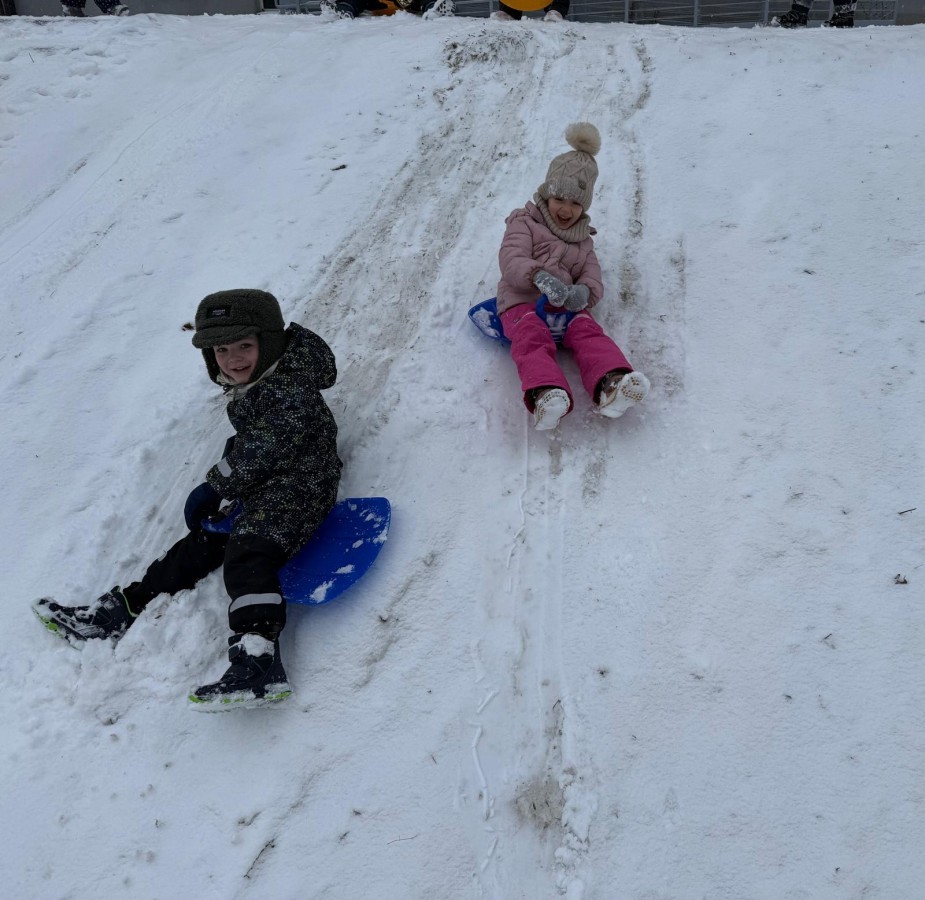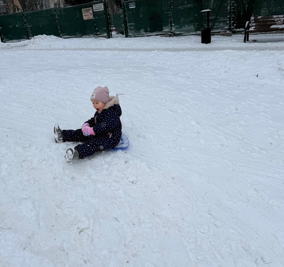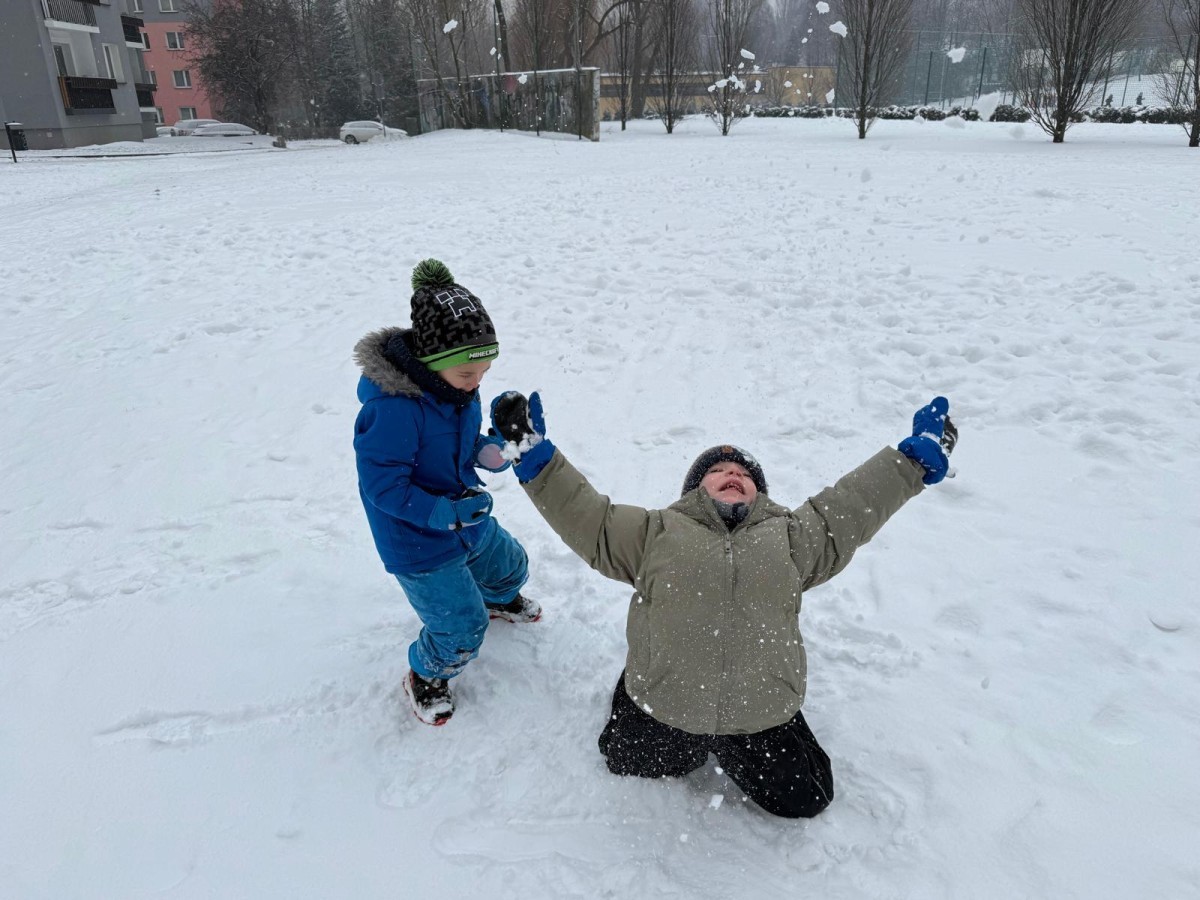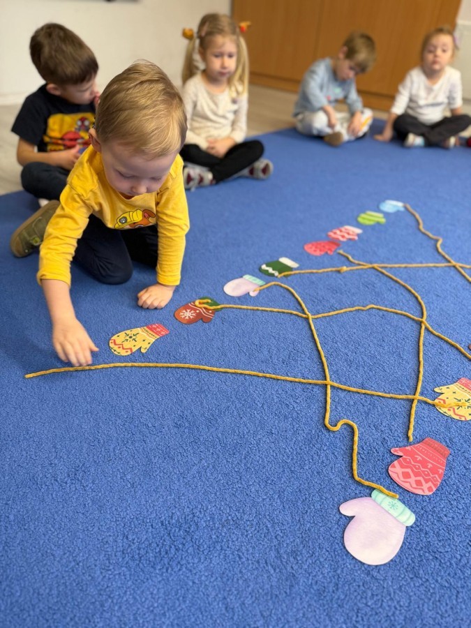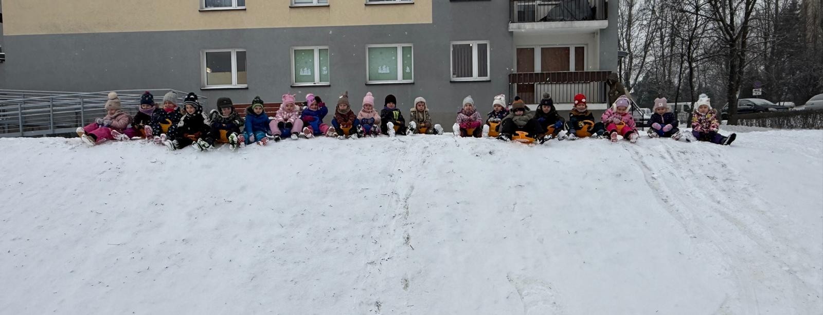 w ćwiczeniach percepcji wzrokowej i koncentracji uwagi, grając w memory oraz odszukując takie same śnieżynki. Nie zabrakło także działań twórczych – podczas pracy plastycznej mali artyści malowali farbami, odkrywając piękno zimowych krajobrazów. Zwieńczeniem były zabawy na śniegu: radosne zjeżdżanie na ślizgach oraz pierwsze próby lepienia bałwana, które sprawiły dzieciom mnóstwo frajdy i uśmiechu. To był czas pełen ruchu, kreatywności i zimowej radości!