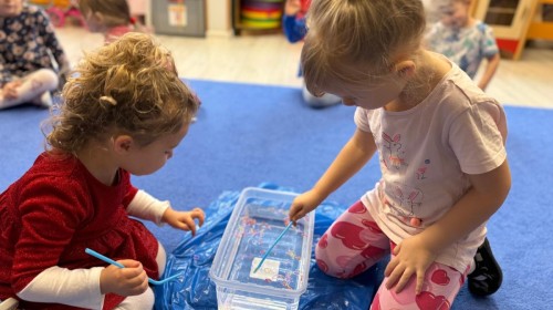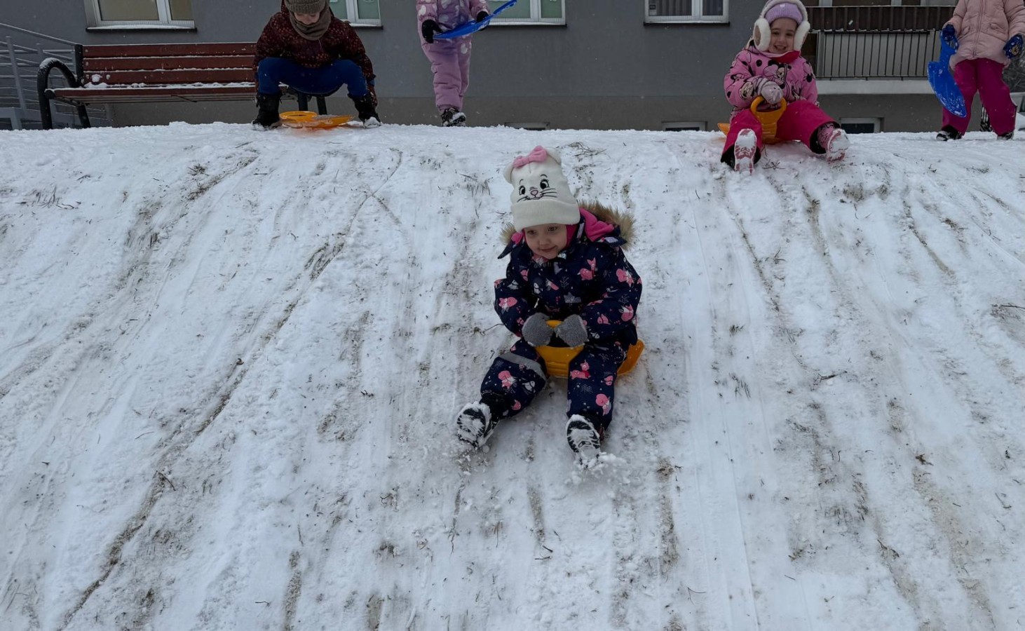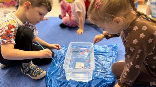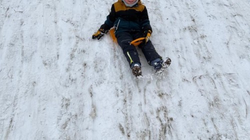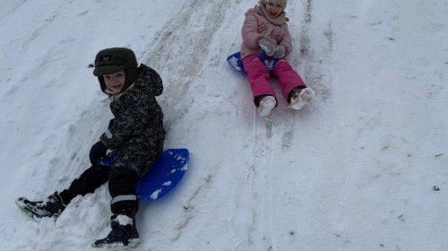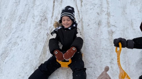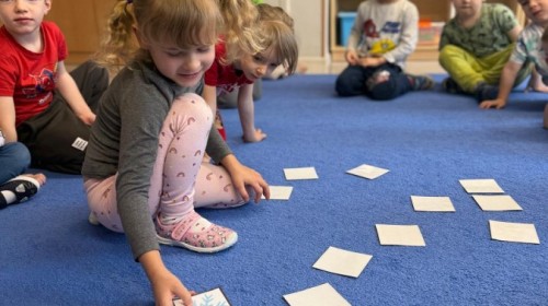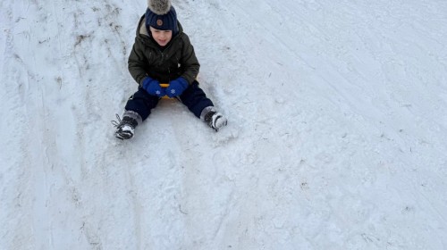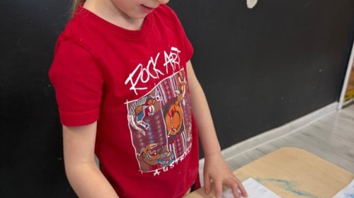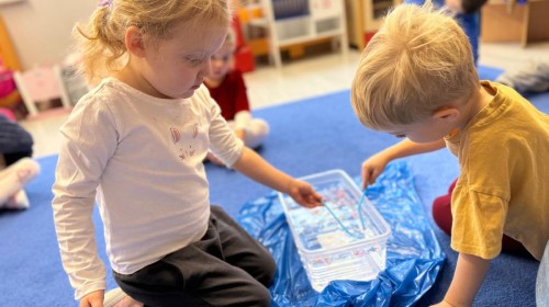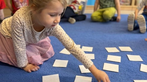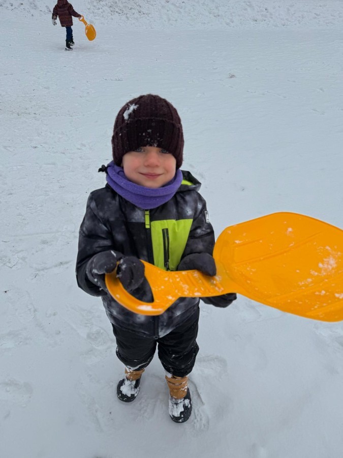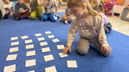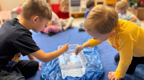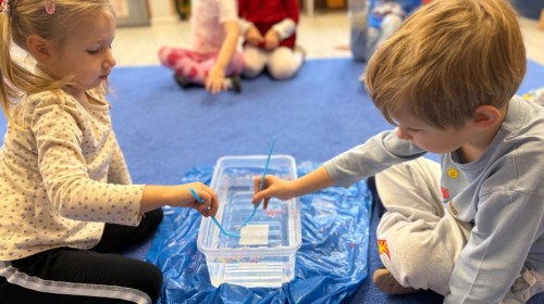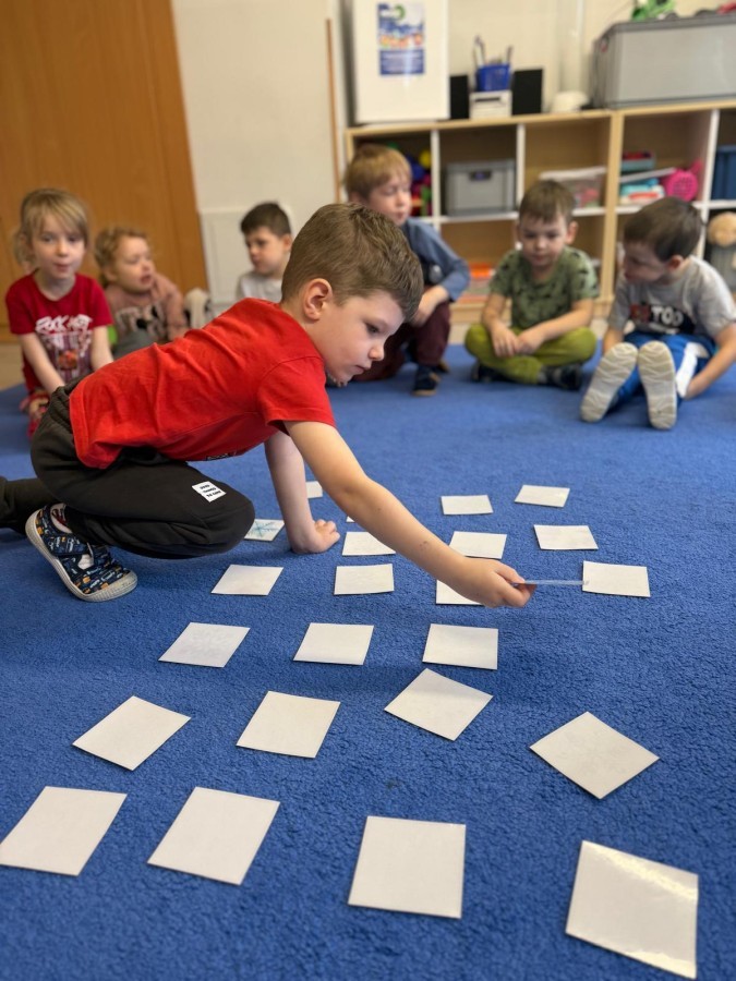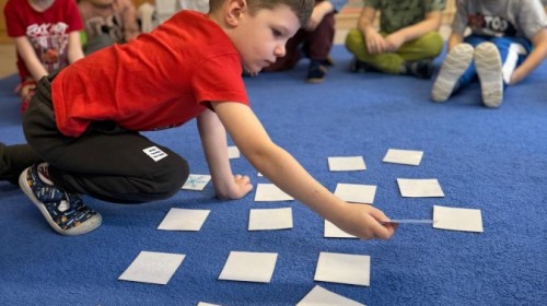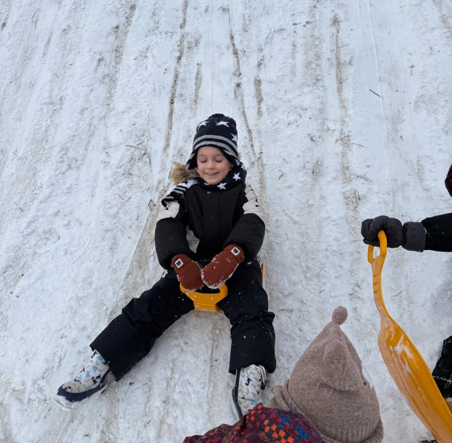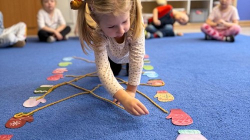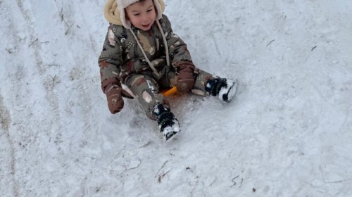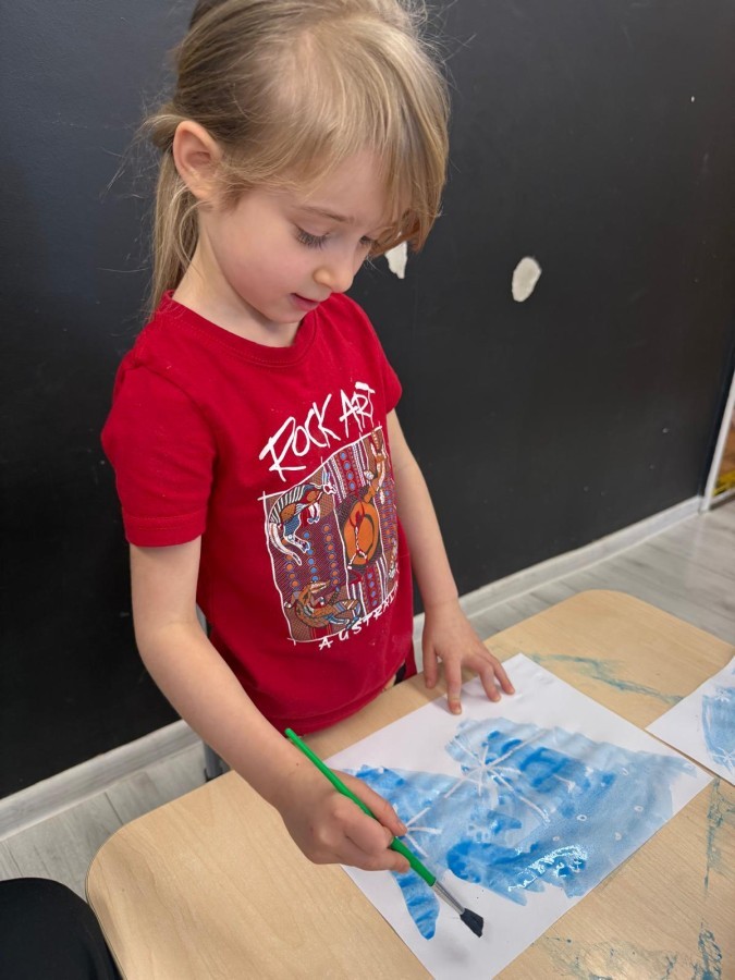 w ćwiczeniach percepcji wzrokowej i koncentracji uwagi, grając w memory oraz odszukując takie same śnieżynki. Nie zabrakło także działań twórczych – podczas pracy plastycznej mali artyści malowali farbami, odkrywając piękno zimowych krajobrazów. Zwieńczeniem były zabawy na śniegu: radosne zjeżdżanie na ślizgach oraz pierwsze próby lepienia bałwana, które sprawiły dzieciom mnóstwo frajdy i uśmiechu. To był czas pełen ruchu, kreatywności i zimowej radości!
