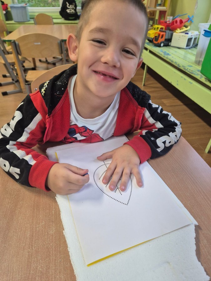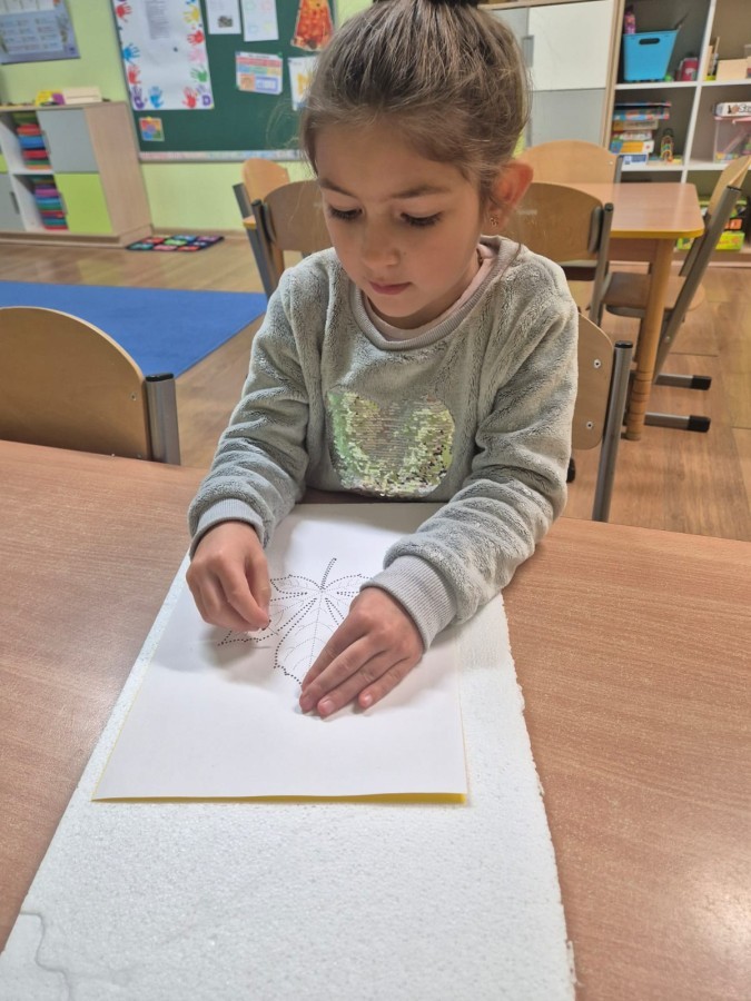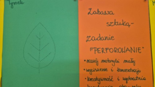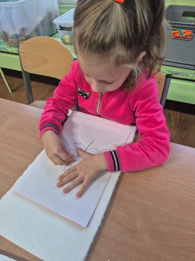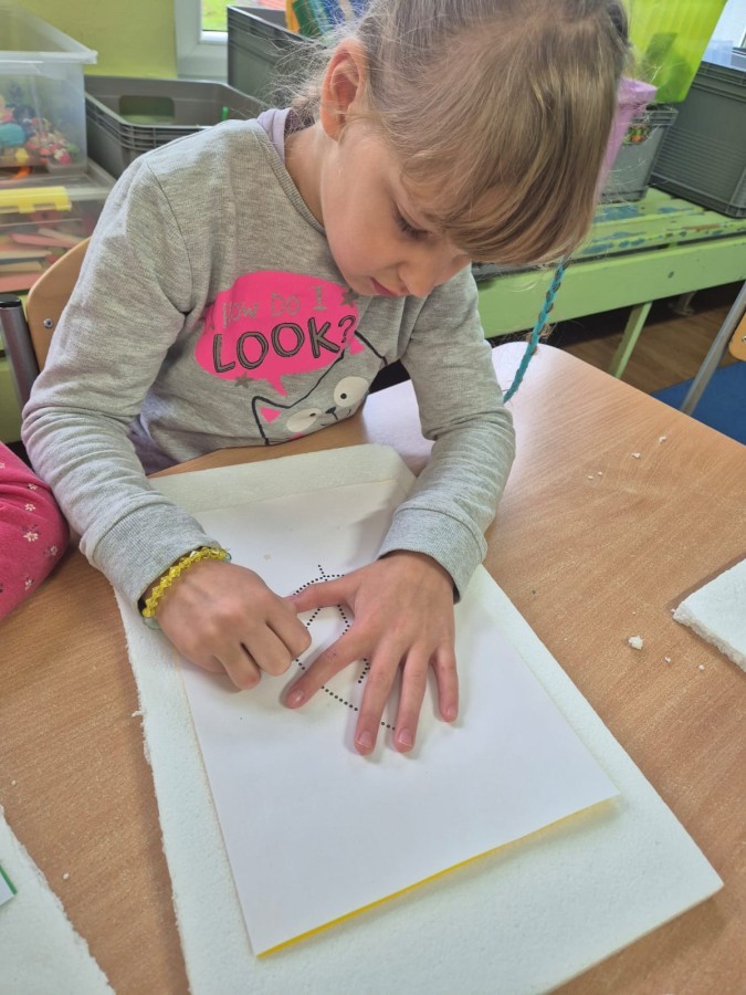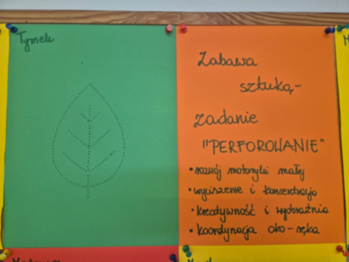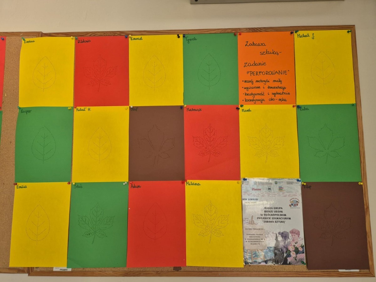 W ramach programu edukacyjnego „Zabawa sztuką” dzieci z grupy Wilki wzięły udział w twórczym zadaniu pod tytułem „Perforowanie”. Polegało ono na tworzeniu wzorów i kompozycji poprzez dziurkowanie papieru przy użyciu bezpiecznych narzędzi (np. pinezek, dziurkaczy czy specjalnych szpikulców). Zadanie to przyniosło dzieciom wiele radości i jednocześnie stanowiło cenne ćwiczenie rozwijające: