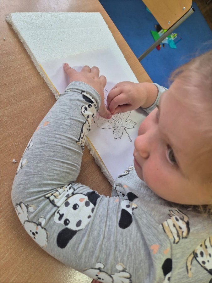 Dodatkowo, perforowanie pobudzało ciekawość poznawczą i było świetnym wprowadzeniem do rozmów o fakturze, strukturze i możliwościach wykorzystania różnych materiałów plastycznych. Nasza grupa używała pinezek oraz podkładek styropianowych, w których przygotowaniu także pomagały dzieci. Wilki z zaangażowaniem tworzyły własne, niepowtarzalne prace, ciesząc się z efektów swojej pracy. To zadanie pokazało, że sztuka może być nie tylko piękna, ale i rozwijająca – szczególnie, gdy łączy się z zabawą!